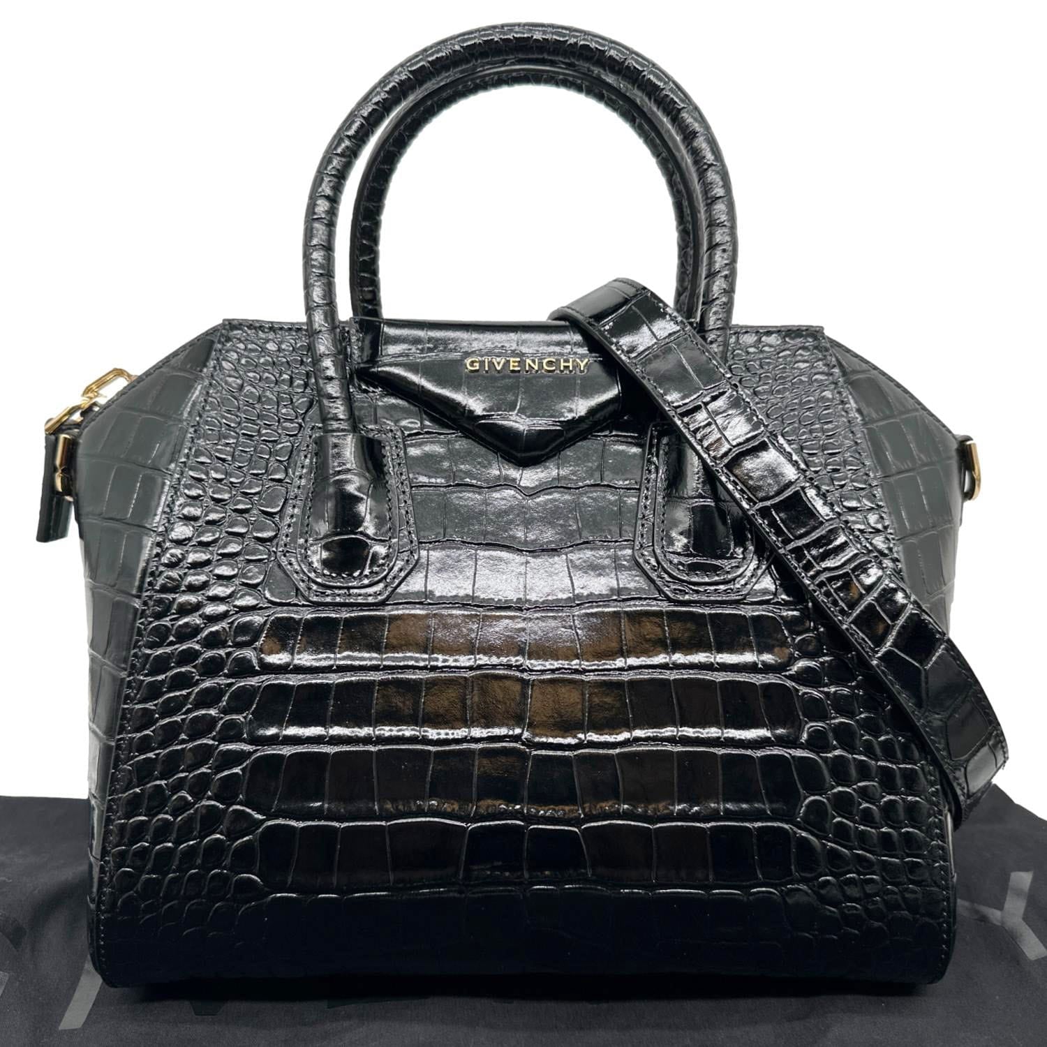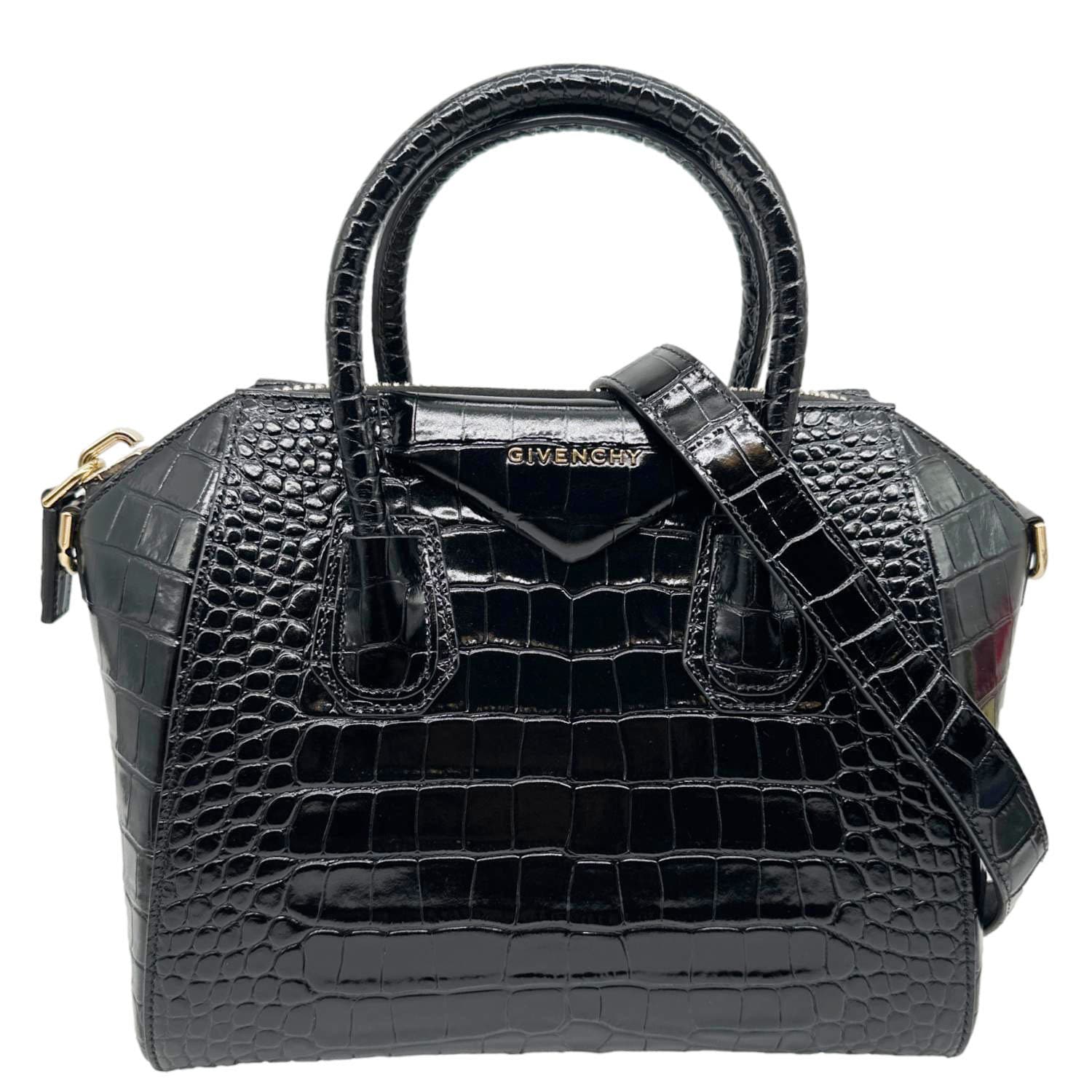 Givenchy Antigona crafted in crocodile-embossed leather with a structured silhouette in classic black. Top-handle design with shoulder strap and spacious interior, perfect for everyday use with a bold and refined luxury edge.