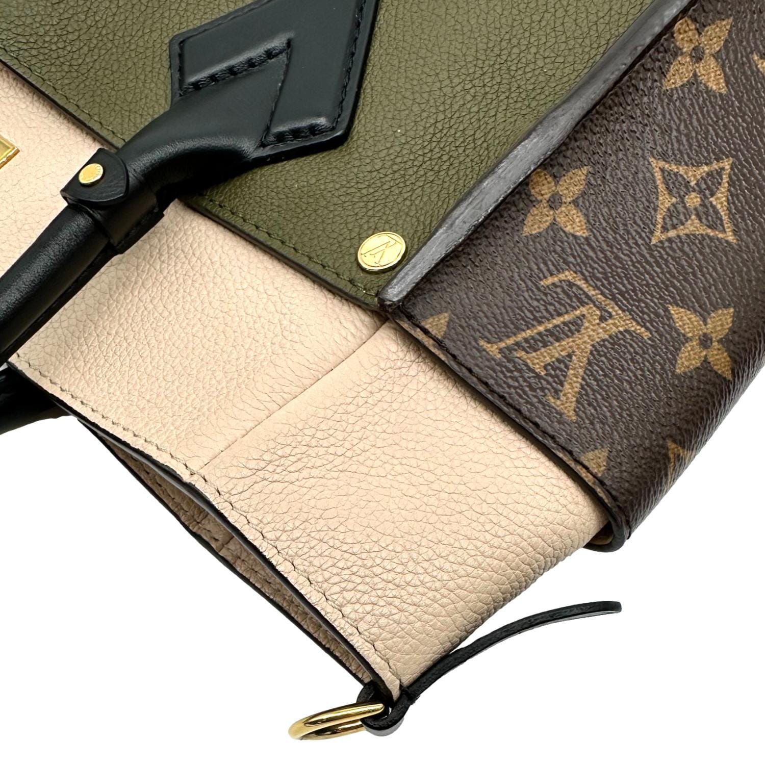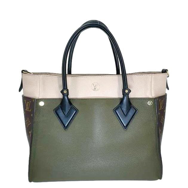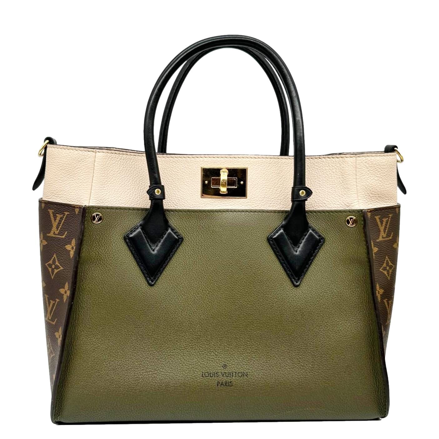 LOUIS VUITTON On My Side MM Satchel Bag in cream leather with Monogram canvas panels featuring a structured silhouette and elegant mixed-material design. Top handles only (strap missing), still spacious and refined, perfect for handheld luxury with organized everyday storage.