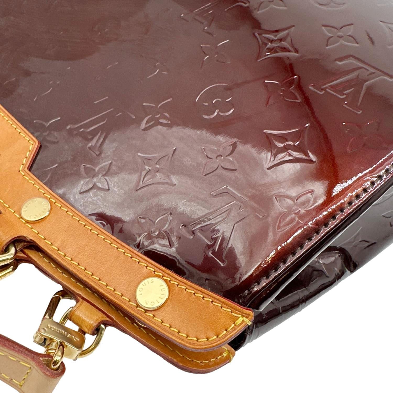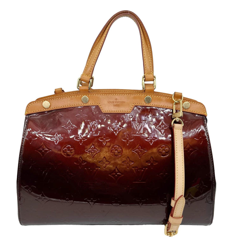 LOUIS VUITTON Brea MM in Amarante Monogram Vernis patent leather with a glossy finish. Features structured top handles and a detachable strap for versatile carry. Elegant and spacious, perfect for sophisticated everyday use.