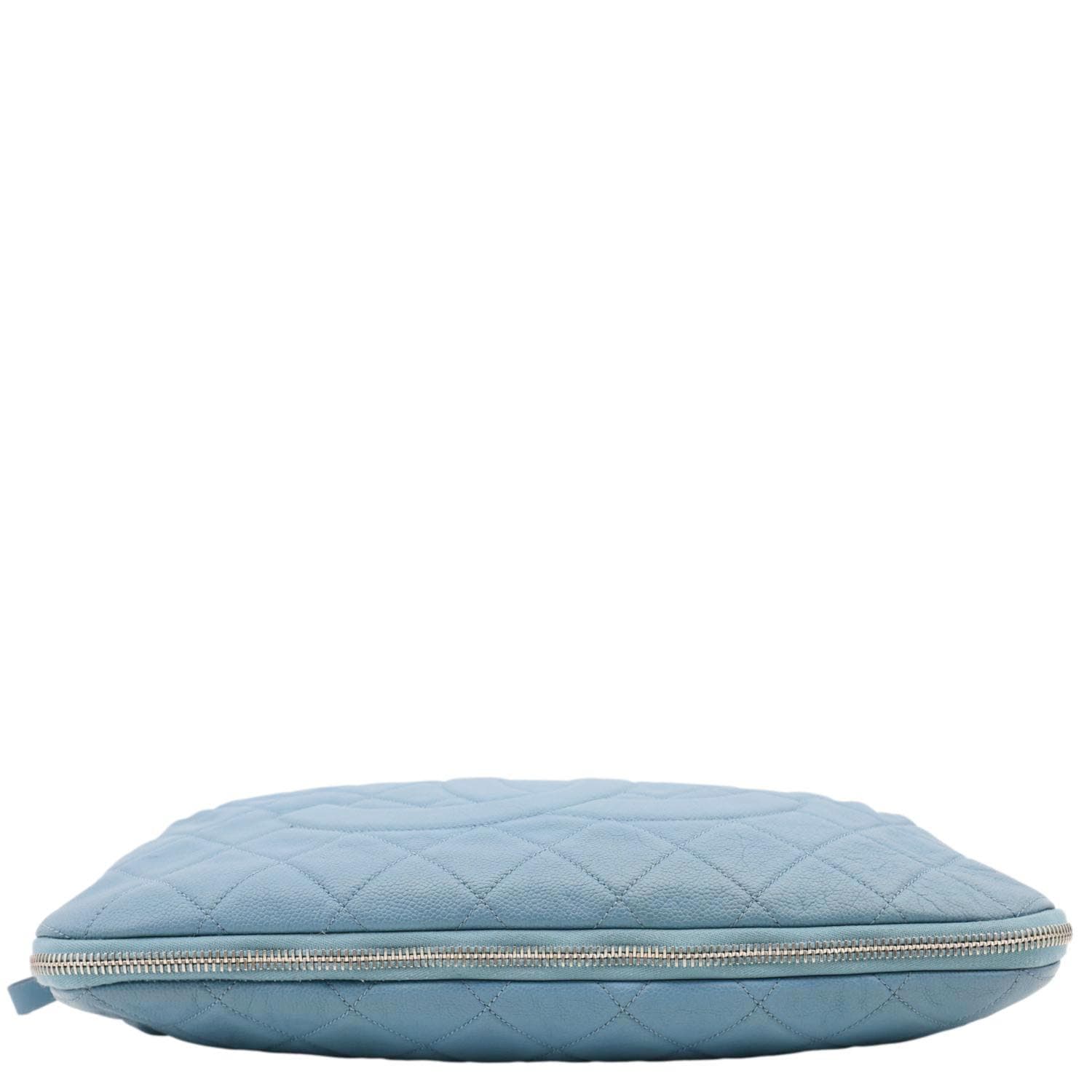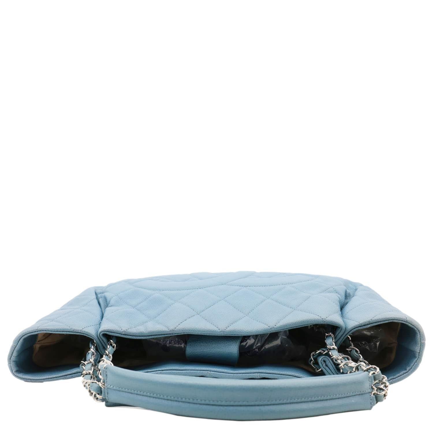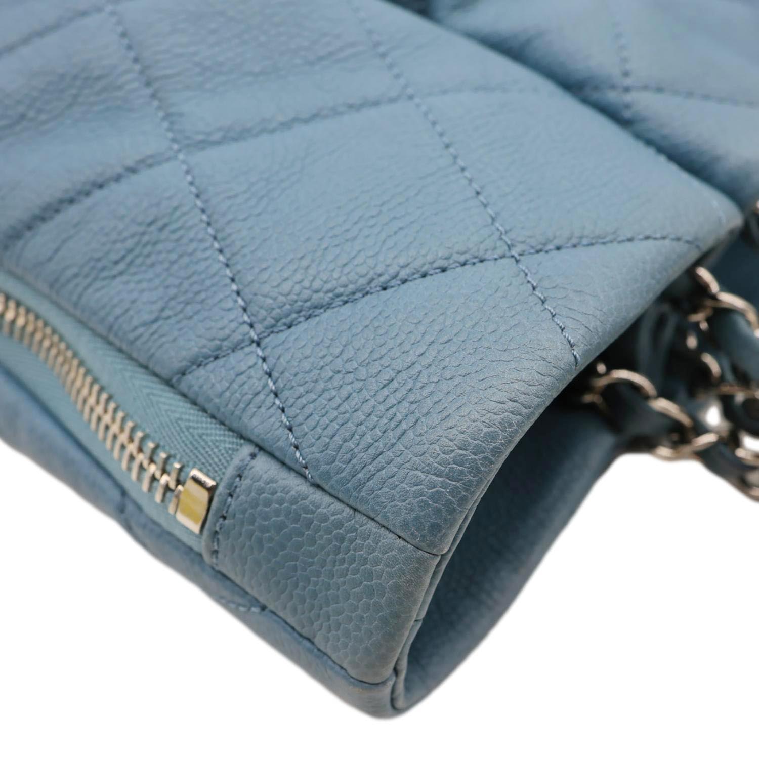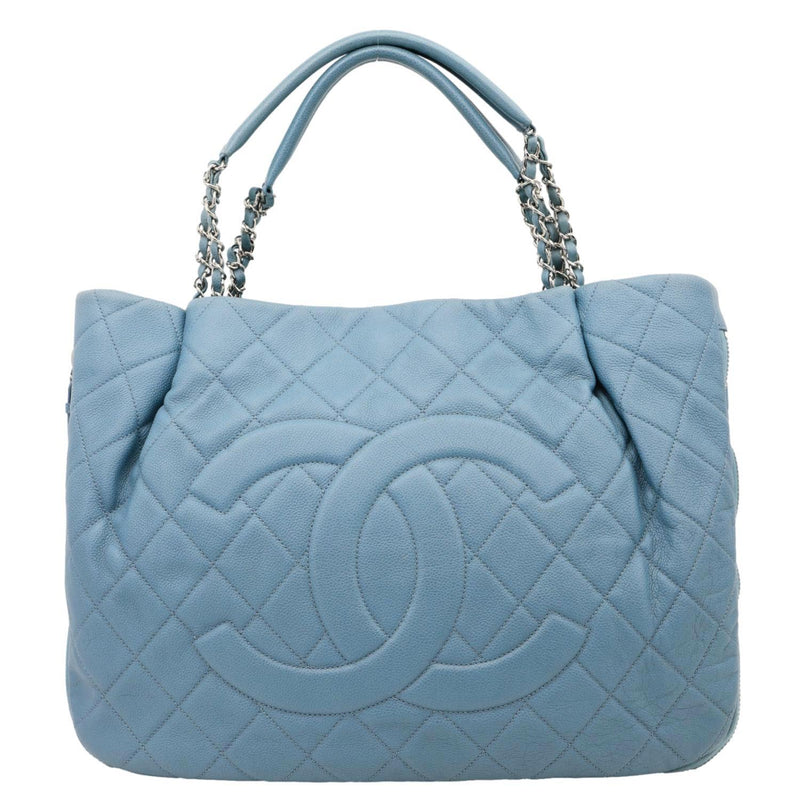 Chanel expandable zip-around tote in blue quilted caviar leather with structured shape and luxe hardware. Expandable design offers extra space when needed, perfect for everyday carry or travel. Elegant, timeless silhouette that pairs beautifully with both casual and refined outfits.