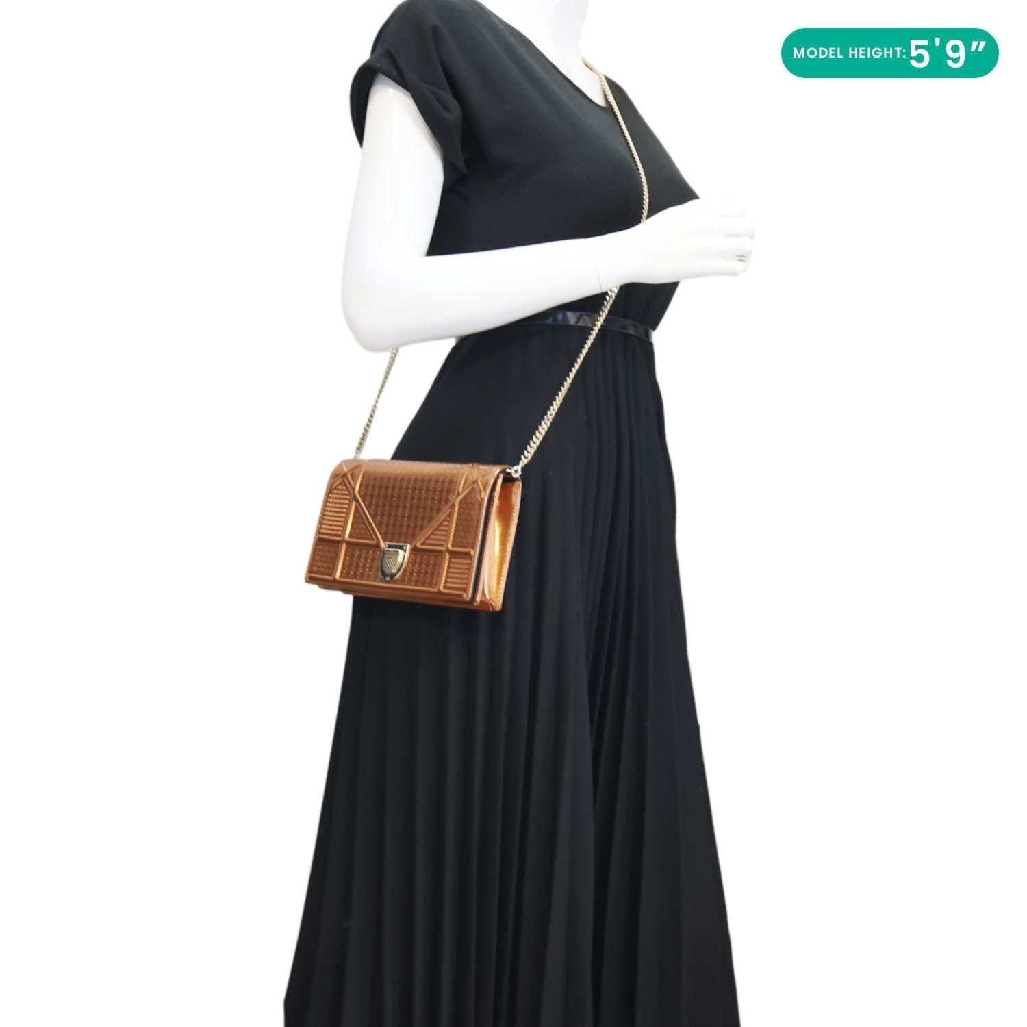 CHRISTIAN DIOR Diorama Wallet on Chain in glossy micro-cannage patent leather, finished in vibrant orange. Compact yet elegant, it doubles as a chic clutch or crossbody with its chain strap.