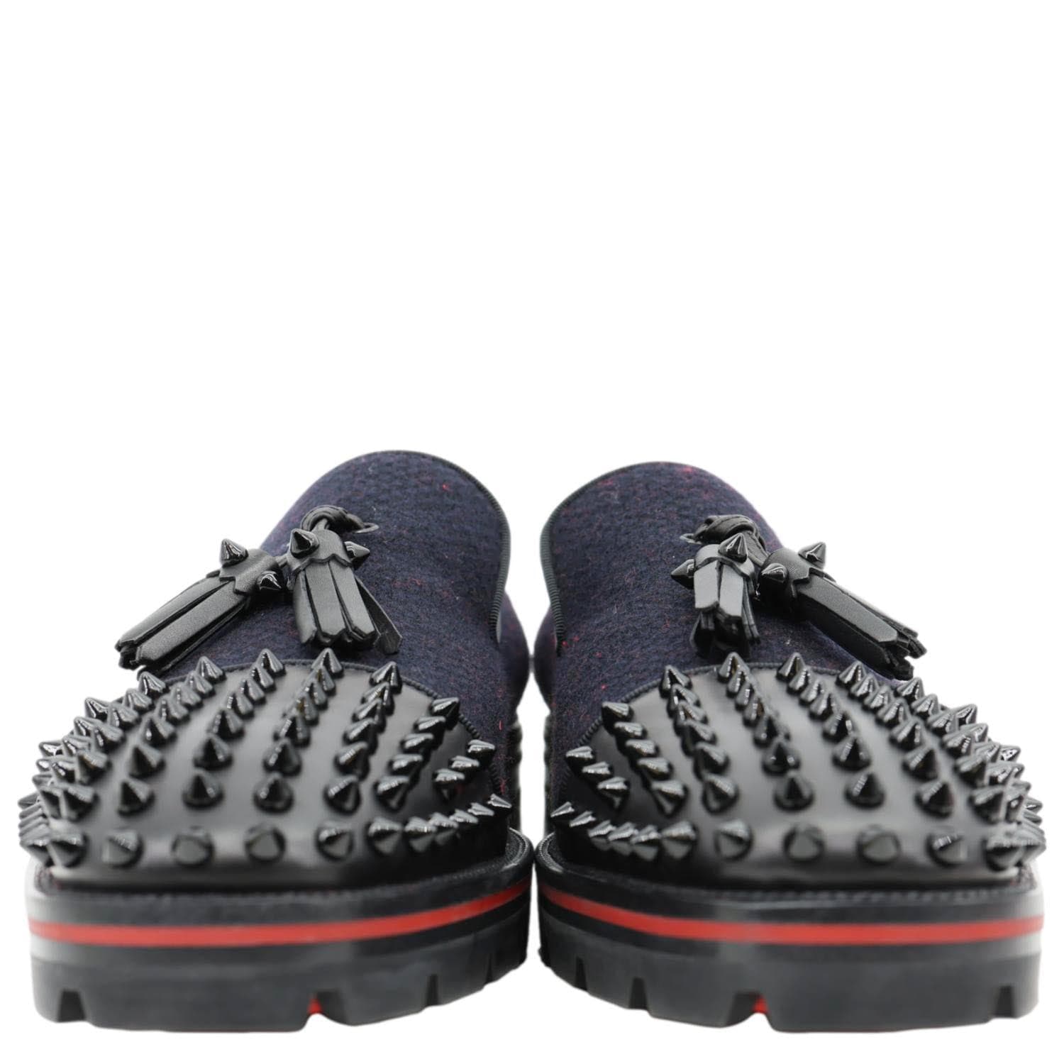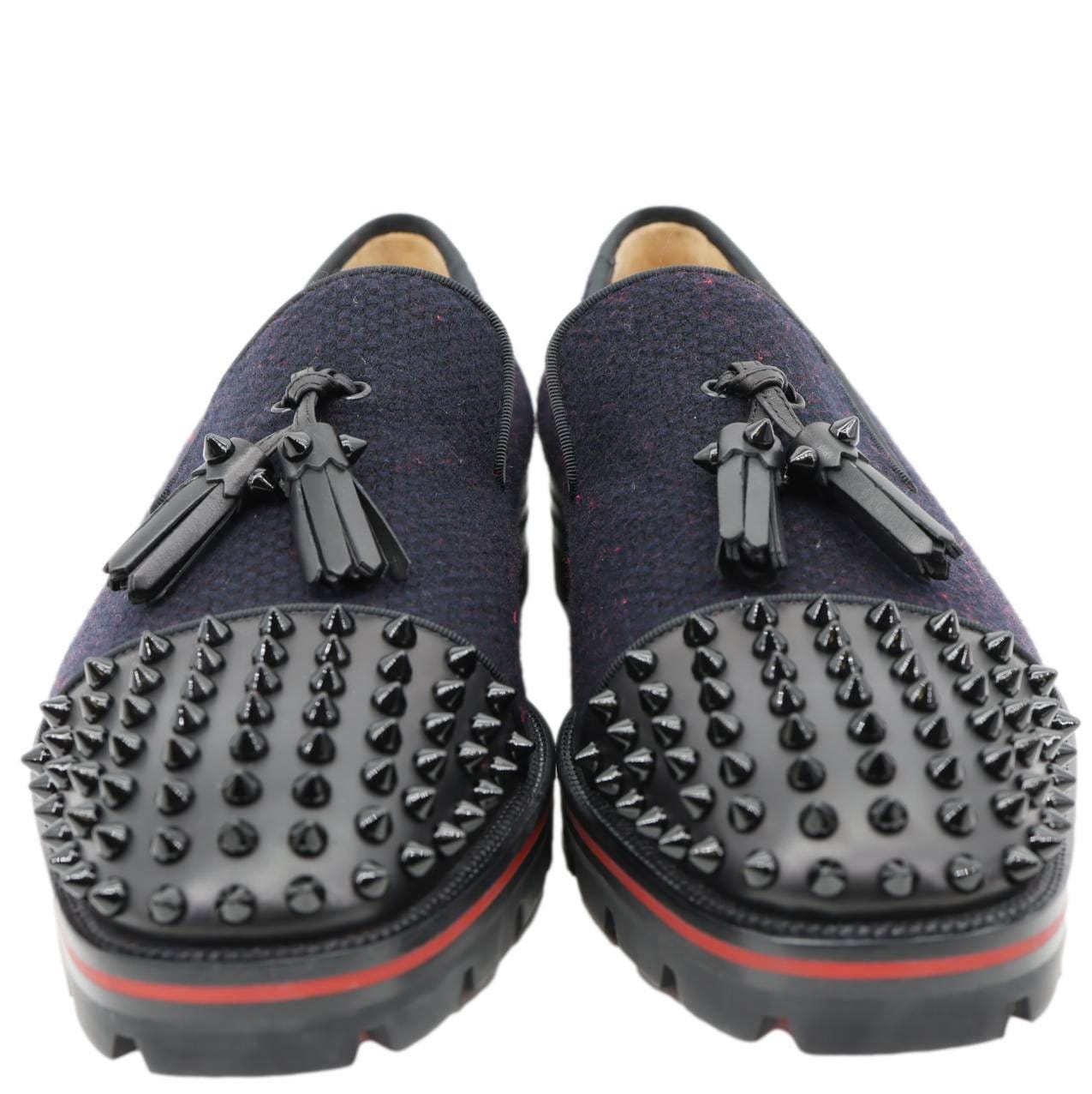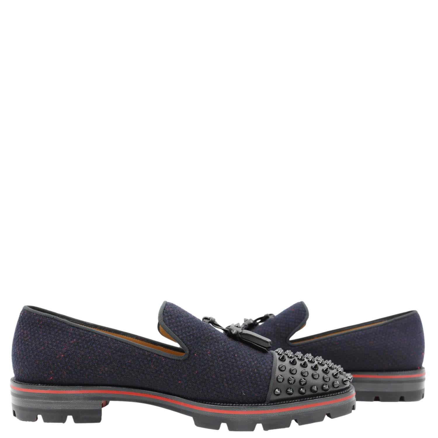 CHRISTIAN LOUBOUTIN Rossini Spike Tassel Tweed Loafer in navy blue and black with signature spike detailing. Luxurious tweed finish with tassel accents, combining bold elegance and refined craftsmanship.