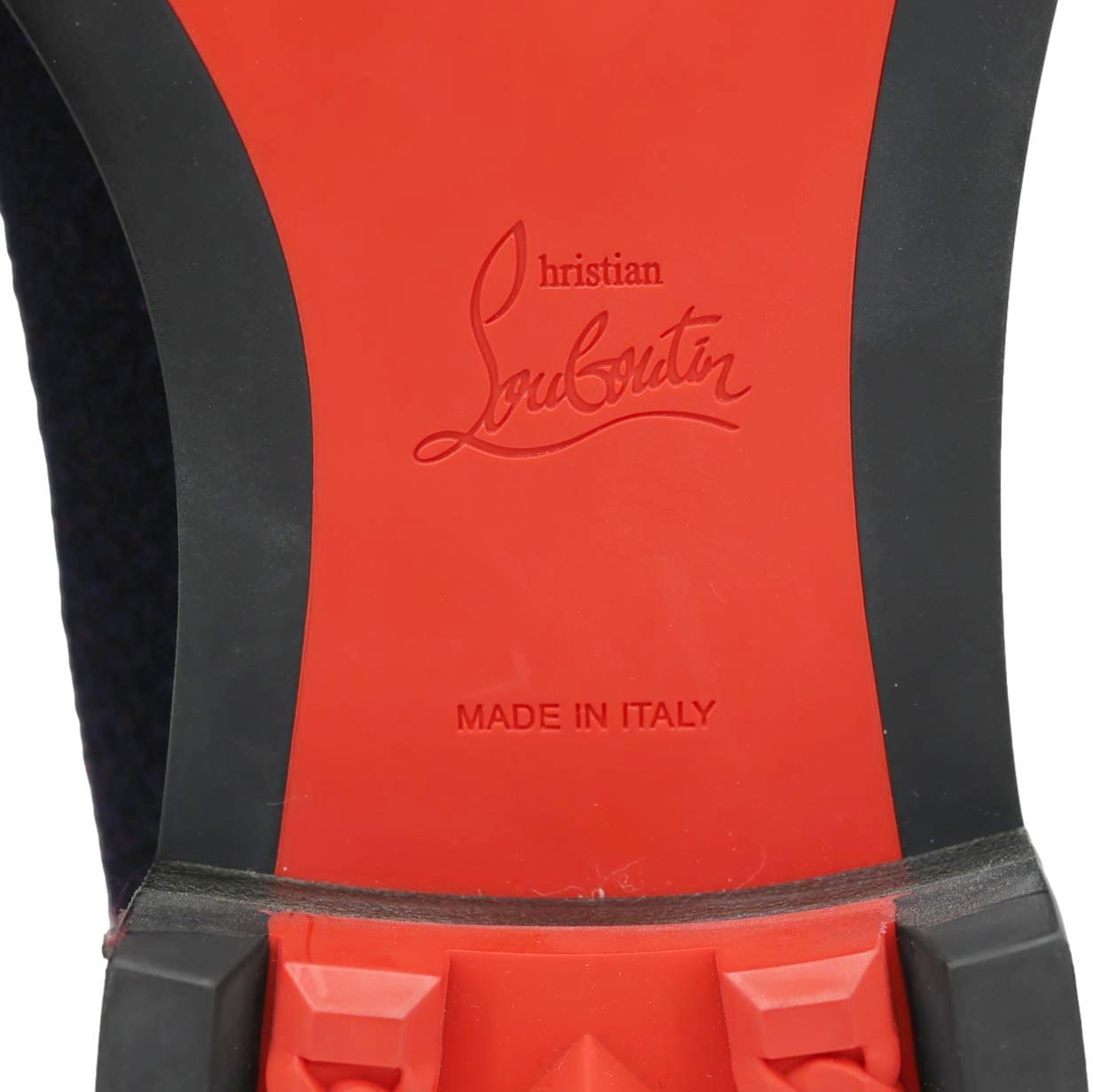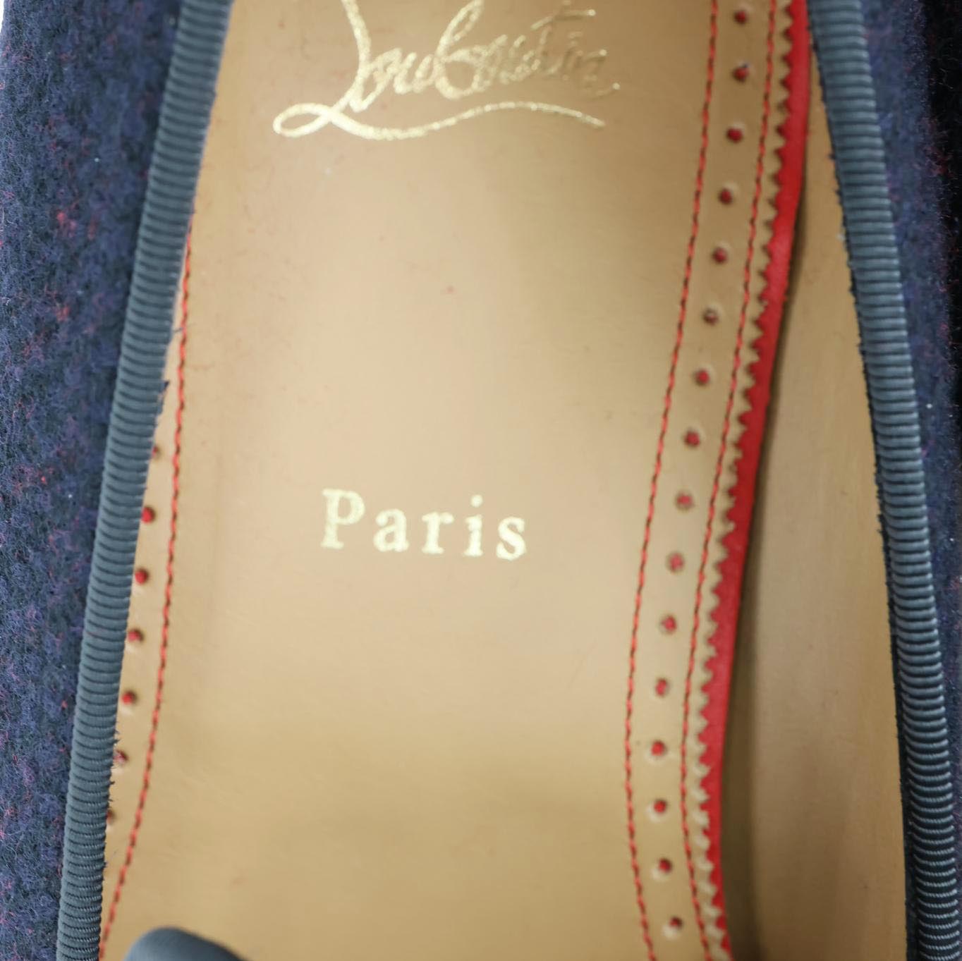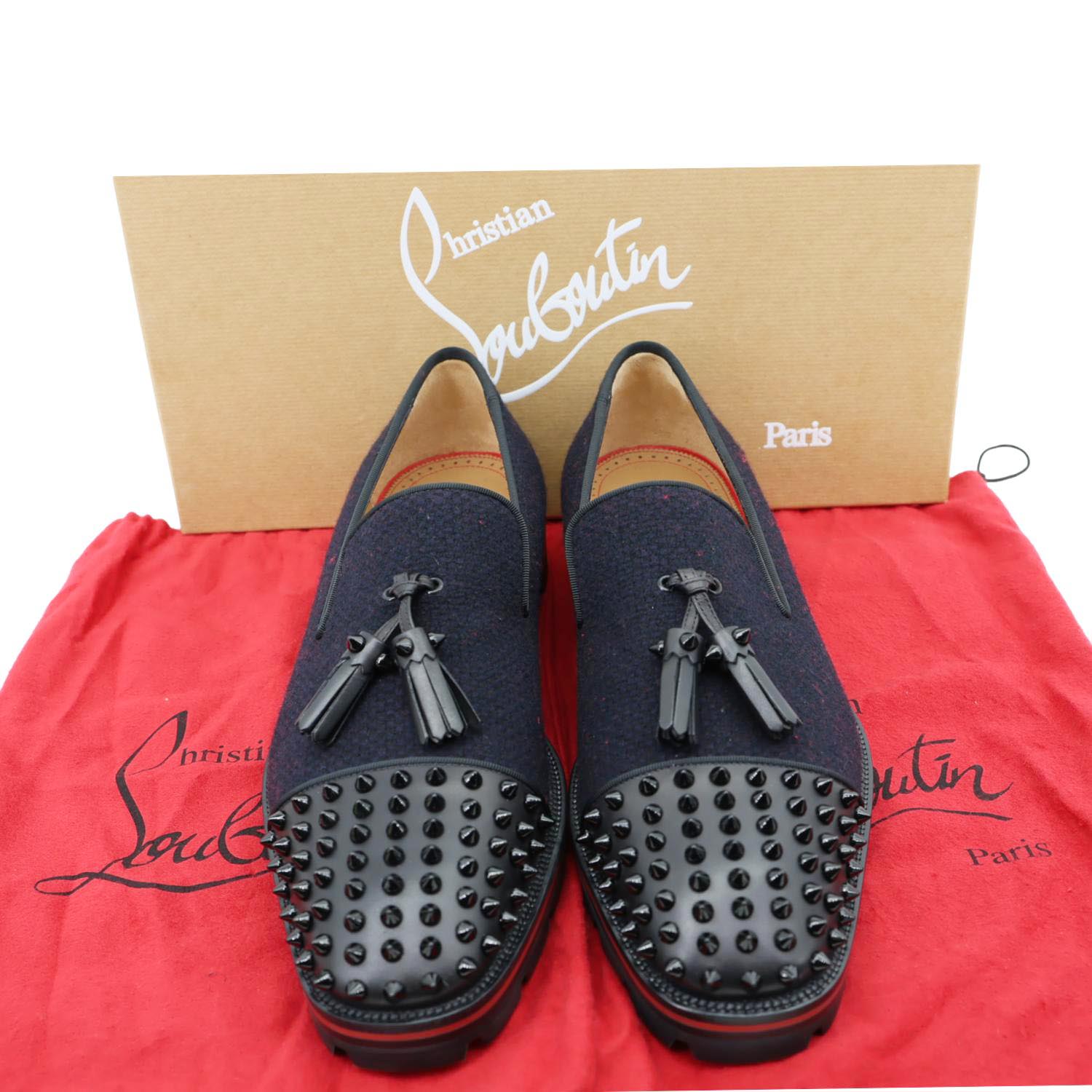 CHRISTIAN LOUBOUTIN Rossini Spike Tassel Tweed Loafer in navy blue and black with signature spike detailing. Luxurious tweed finish with tassel accents, combining bold elegance and refined craftsmanship.