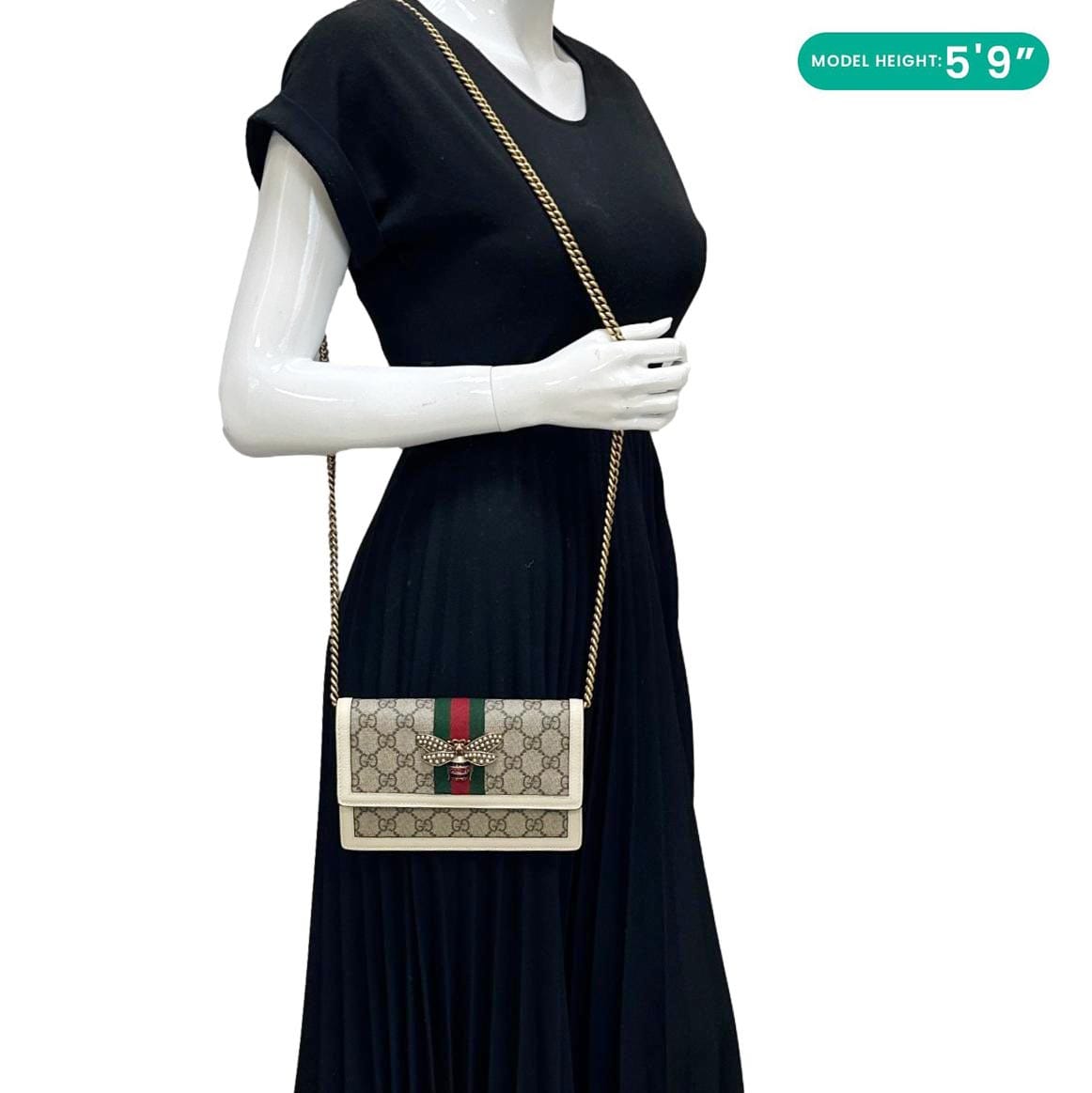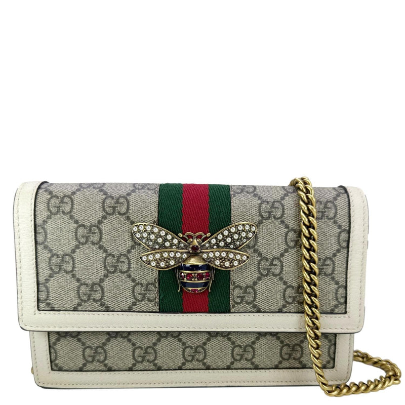 The Gucci Web Queen Margaret Mini GG Supreme Canvas Chain Wallet in Beige features the iconic bee motif with red and green web detailing. Compact yet elegant, it blends classic Gucci heritage with modern charm.