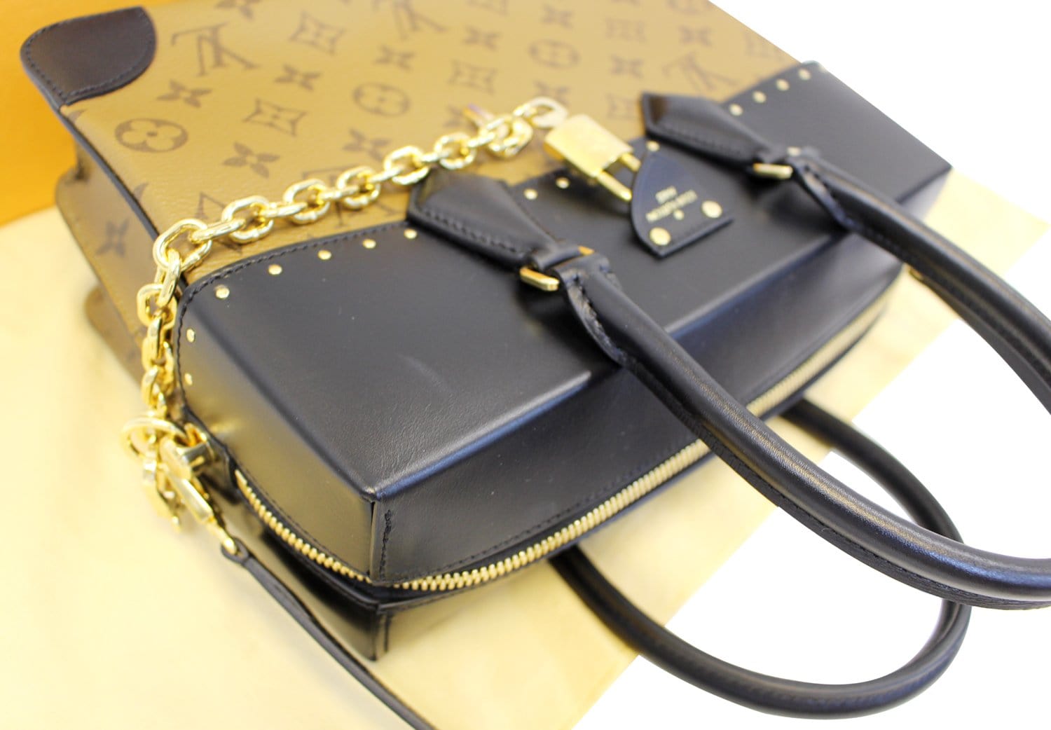 This stylish structured bag is crafted of classic Louis Vuitton reverse monogram coated canvas. This shoulder bag features black cowhide leather trim, optional black leather shoulder strap with polished brass hardware.