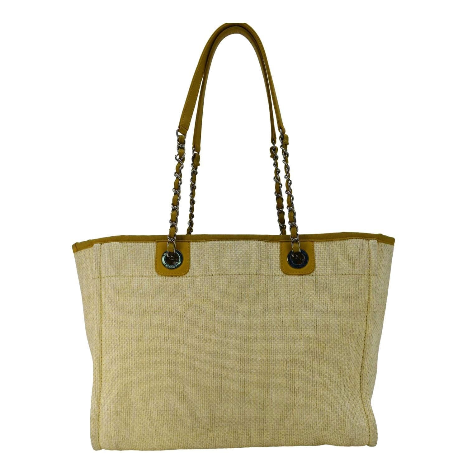 The CHANEL Deauville Straw Raffia Tote Bag in yellow features a lightweight raffia construction with chic leather accents and the iconic CHANEL logo. Perfect for casual outings, it offers spacious storage with a stylish, summery vibe.