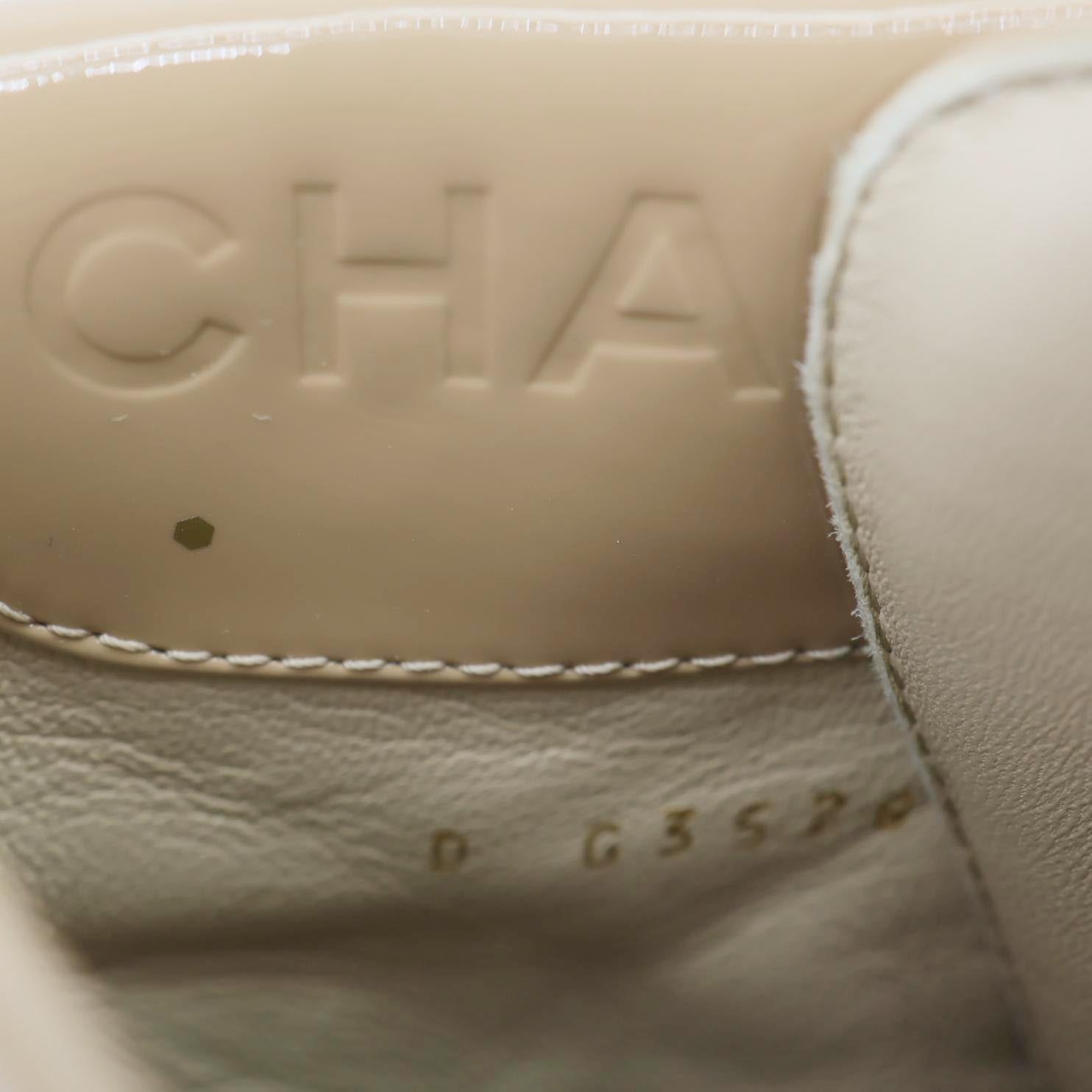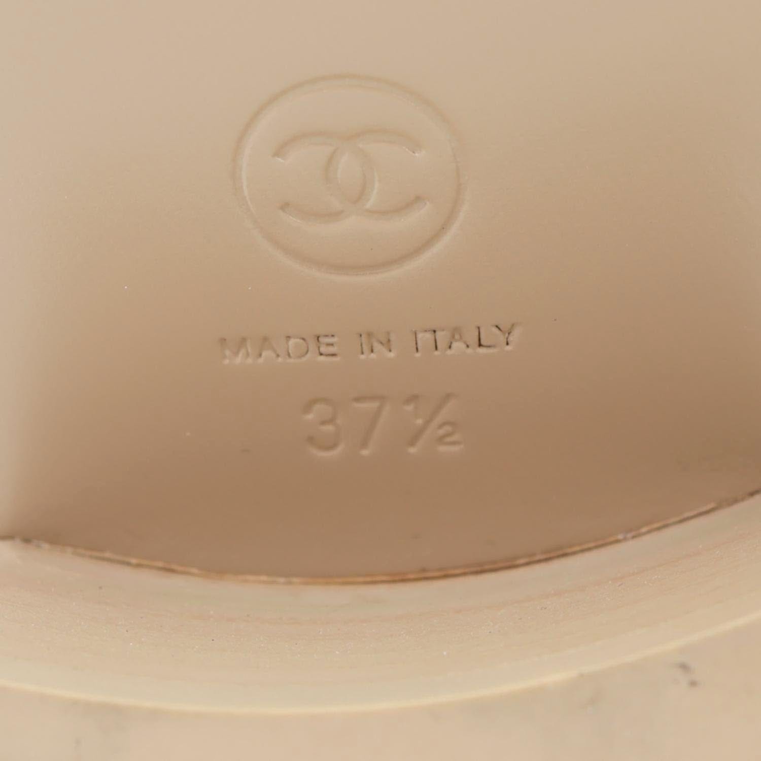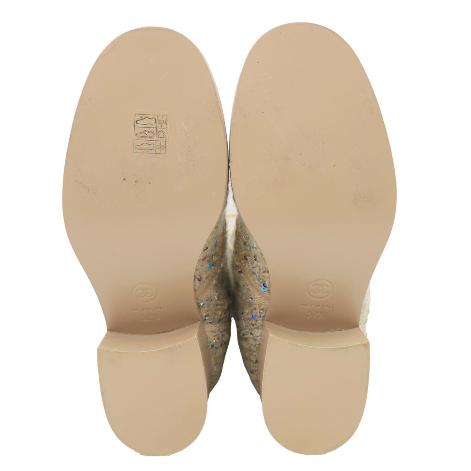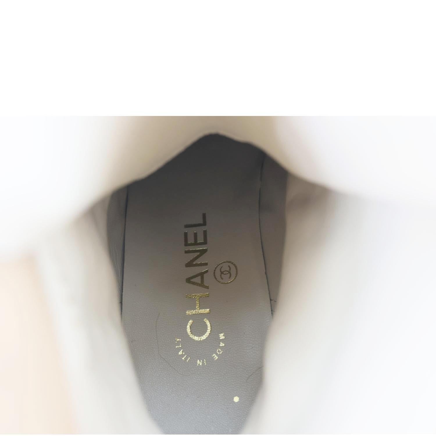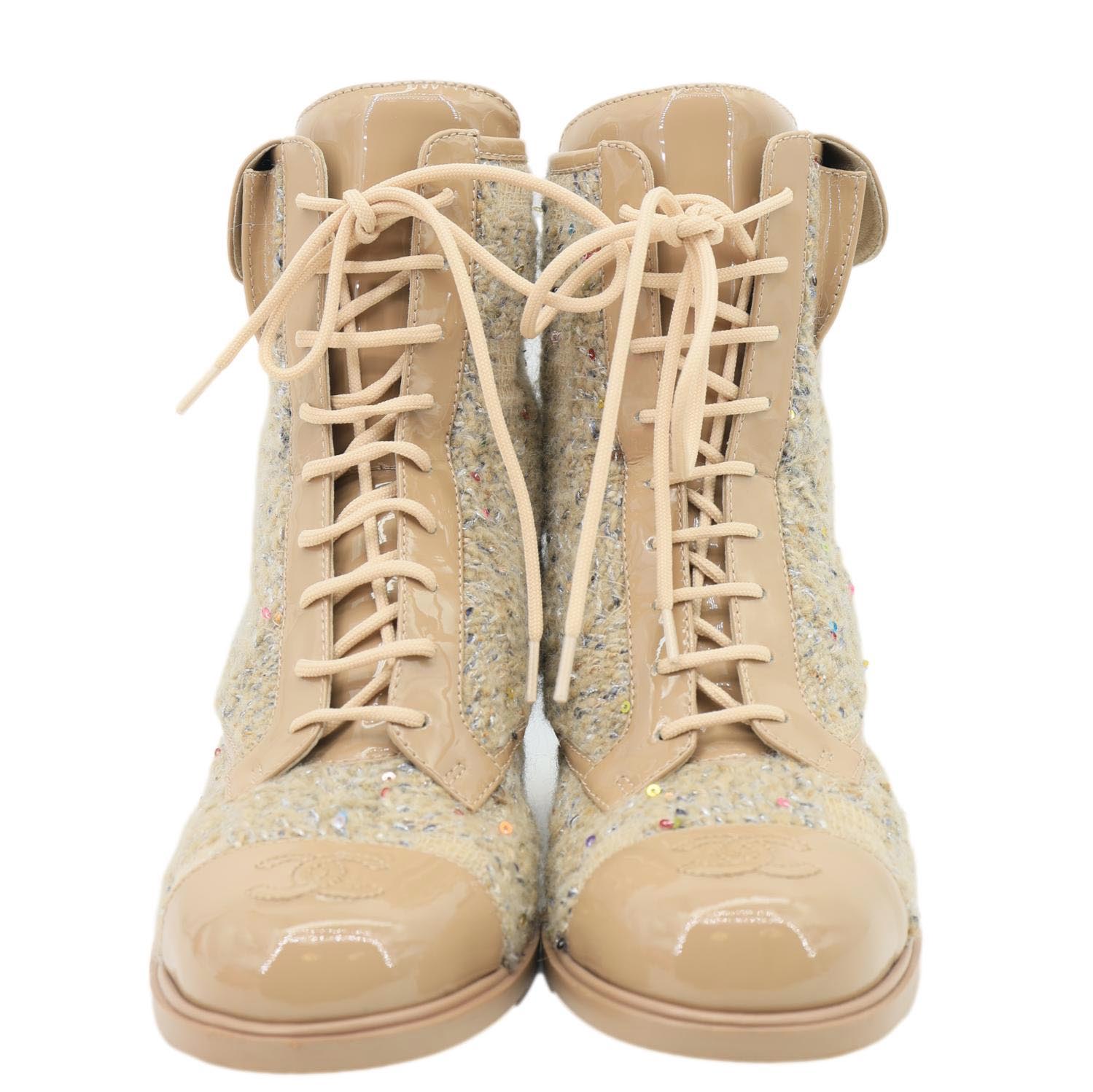 CHANEL tweed and patent leather combat boots in tan with signature luxe detailing. Chunky yet chic, blending edgy silhouette with classic Chanel sophistication. Comfortable and stylish, perfect for fashion-forward everyday wear.