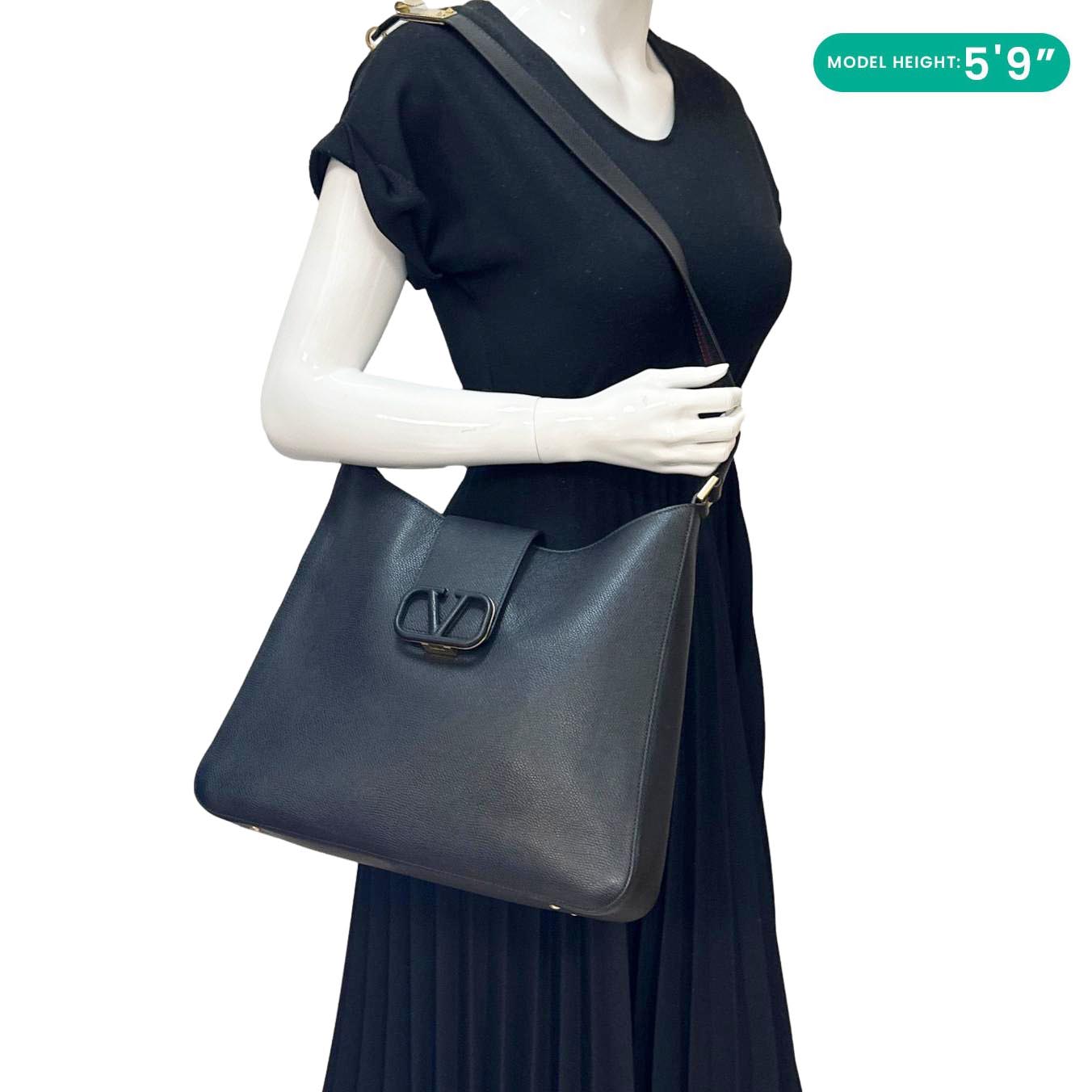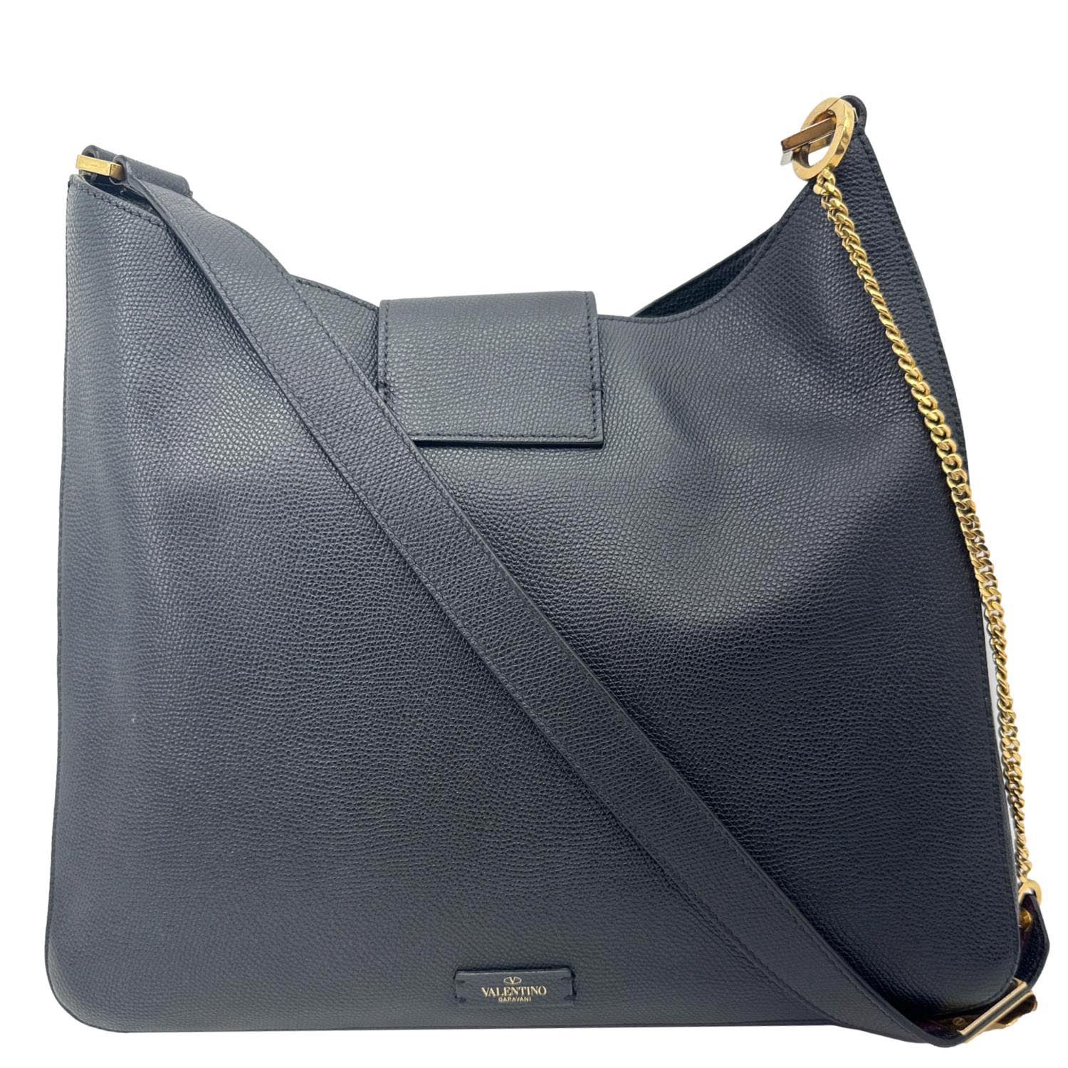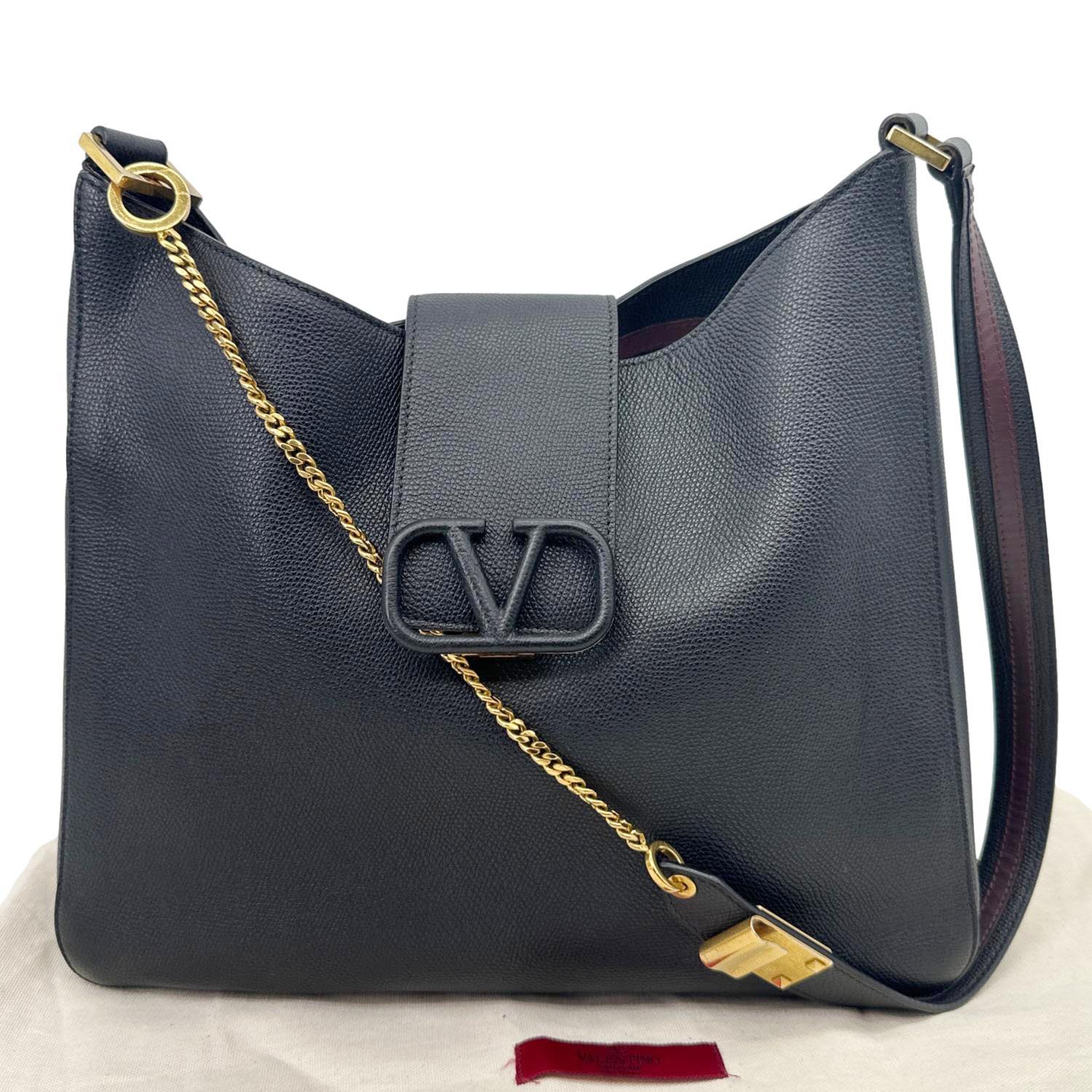 VALENTINO VSling Hobo Bag in grainy calfskin leather with signature V logo accent in black. A refined crossbody style blending luxury craftsmanship with everyday versatility.