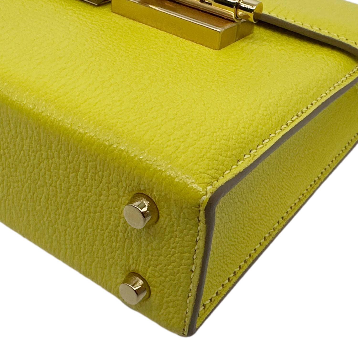 HERMES Verrou Chaine Mini Goatskin Leather Crossbody Bag Yellow features smooth goatskin leather with the signature Verrou clasp in a vibrant yellow, for a bold and stylish look. Its compact crossbody design offers chic, hands-free elegance for everyday or evening wear.