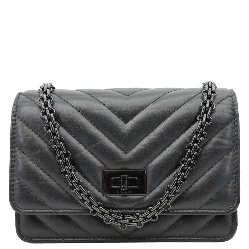 CHANEL Reissue Wallet On Chain in chevron-quilted leather features a sleek black finish with the iconic Mademoiselle lock. Elegant and versatile, it offers compact organization with timeless reissue styling.