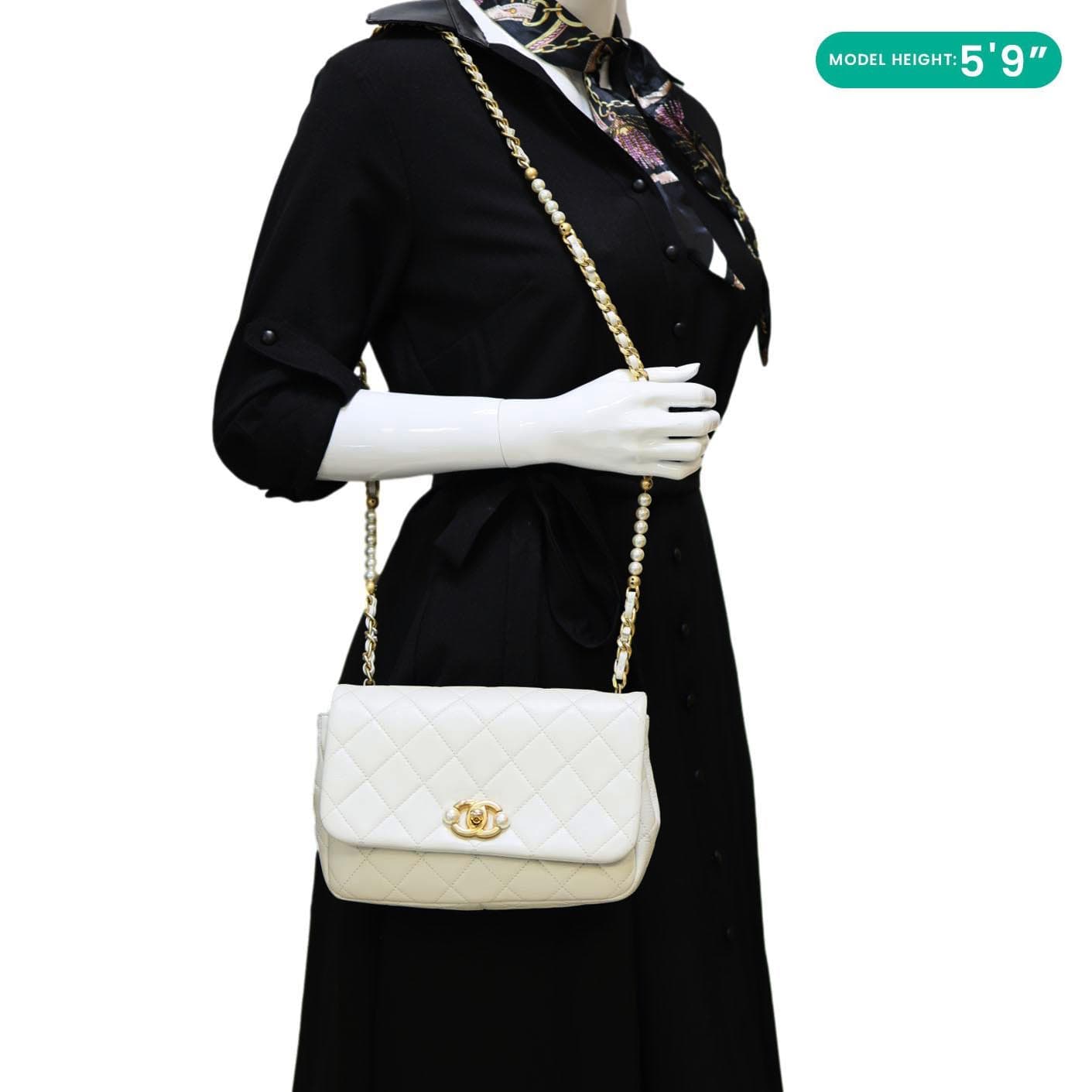 Elegant CHANEL Pearl Side Flap crafted in quilted leather with refined pearl detailing in classic white. A chic crossbody bag offering timeless sophistication and everyday versatility.