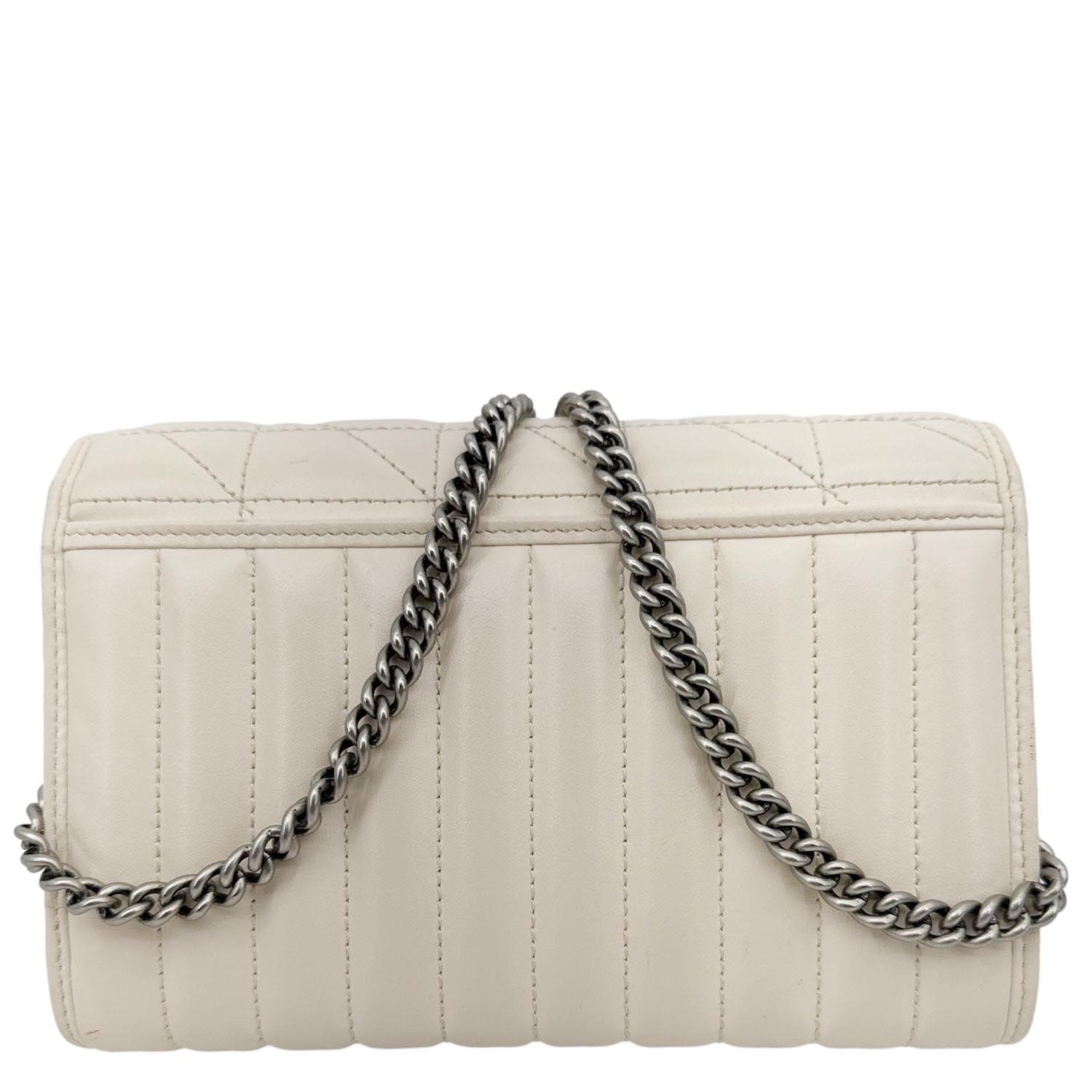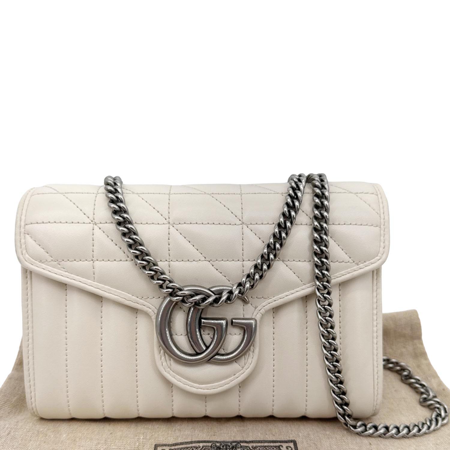 Crafted in matelassé calfskin with the iconic GG logo, this elegant chain wallet offers refined style in mystic white. Compact yet versatile, it transitions effortlessly from day to evening.