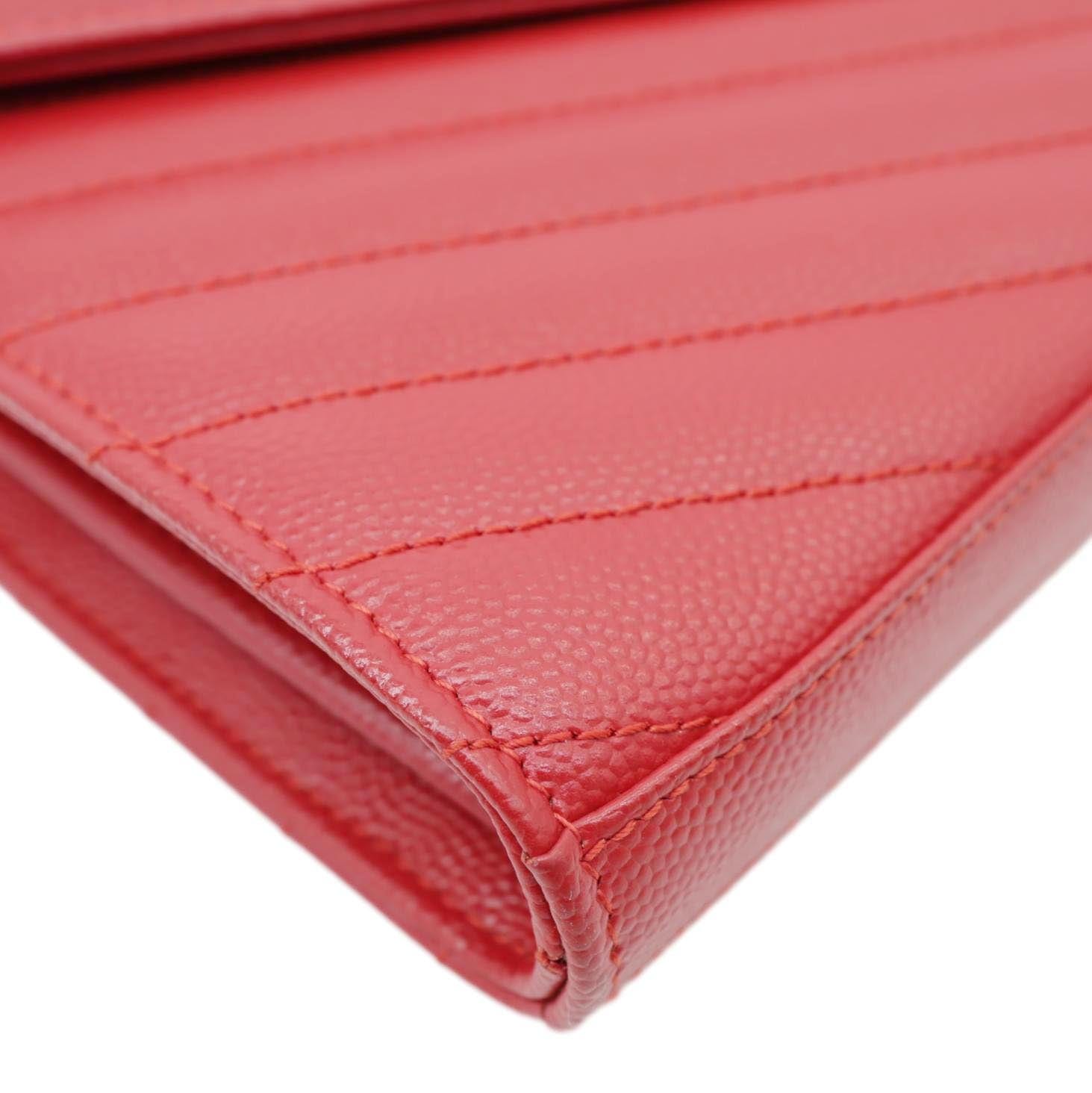 The YVES SAINT LAURENT Envelope Grain De Poudre Chevron Leather Wallet On Chain in red features chevron quilting and a gold-toned YSL logo. This compact wallet on a chain offers style and functionality with card slots and a zippered compartment.