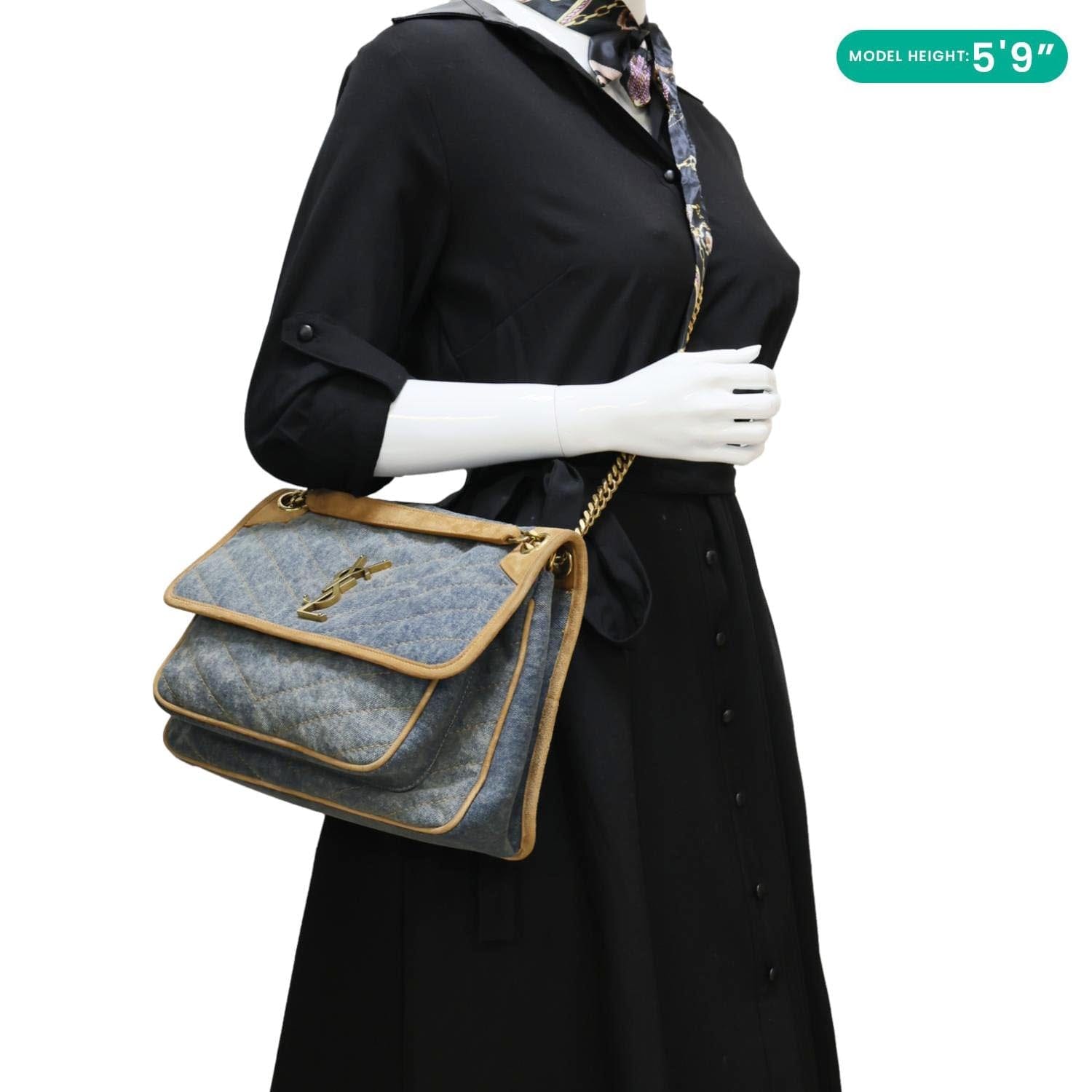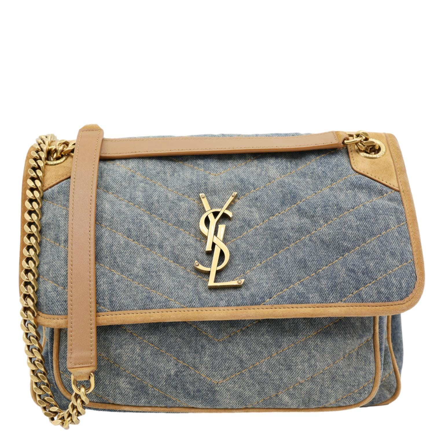 Iconic YSL Niki Medium crafted in stylish blue denim with signature logo and chain strap. A versatile crossbody bag offering a relaxed silhouette with modern luxury appeal.