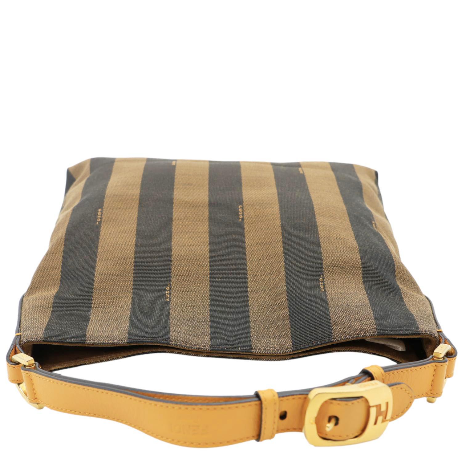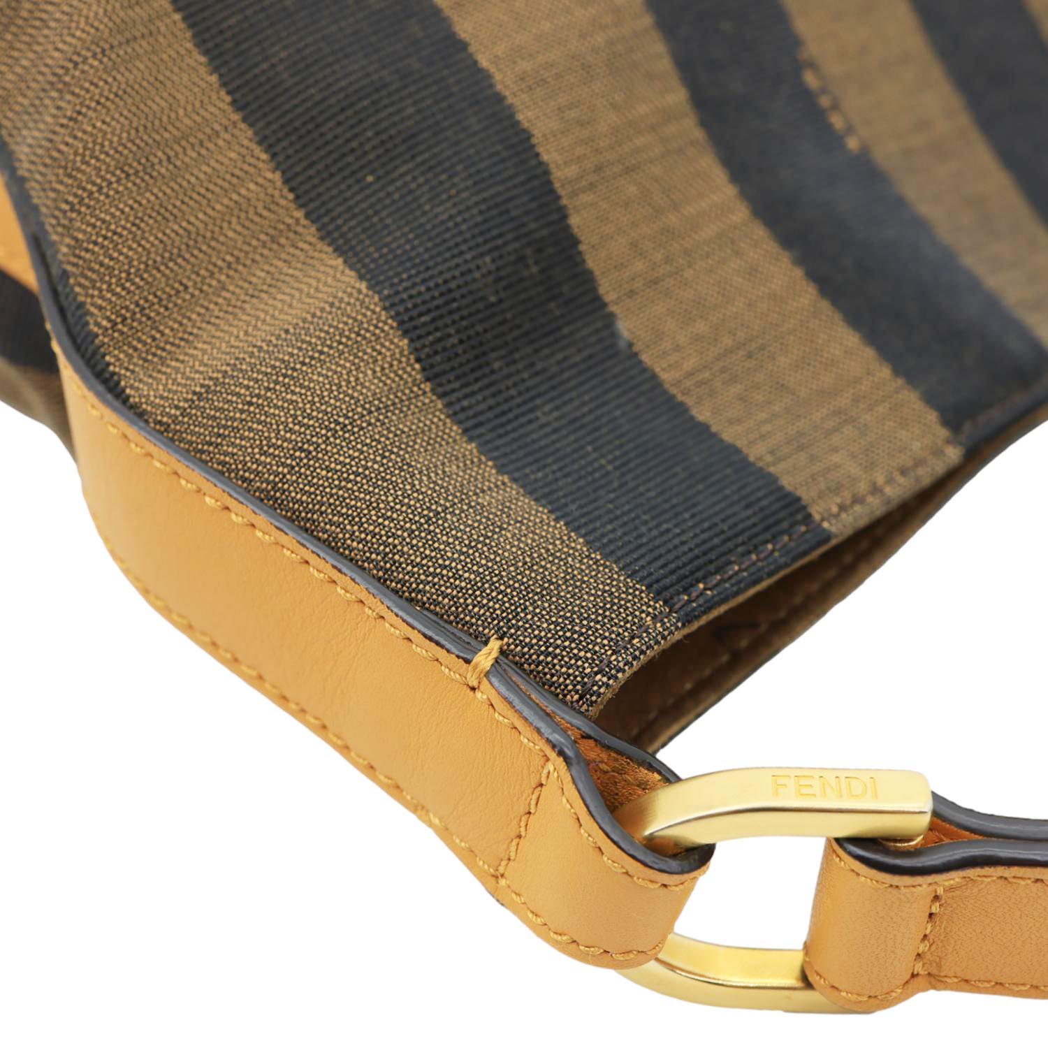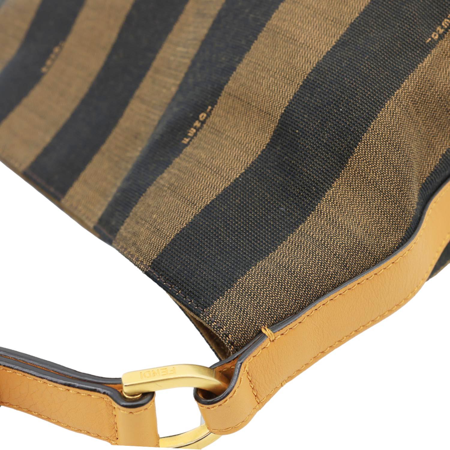 Fendi Pequin Stripe Canvas Hobo Bag in tobacco features signature striped canvas with leather trim for a classic, casual luxe look.