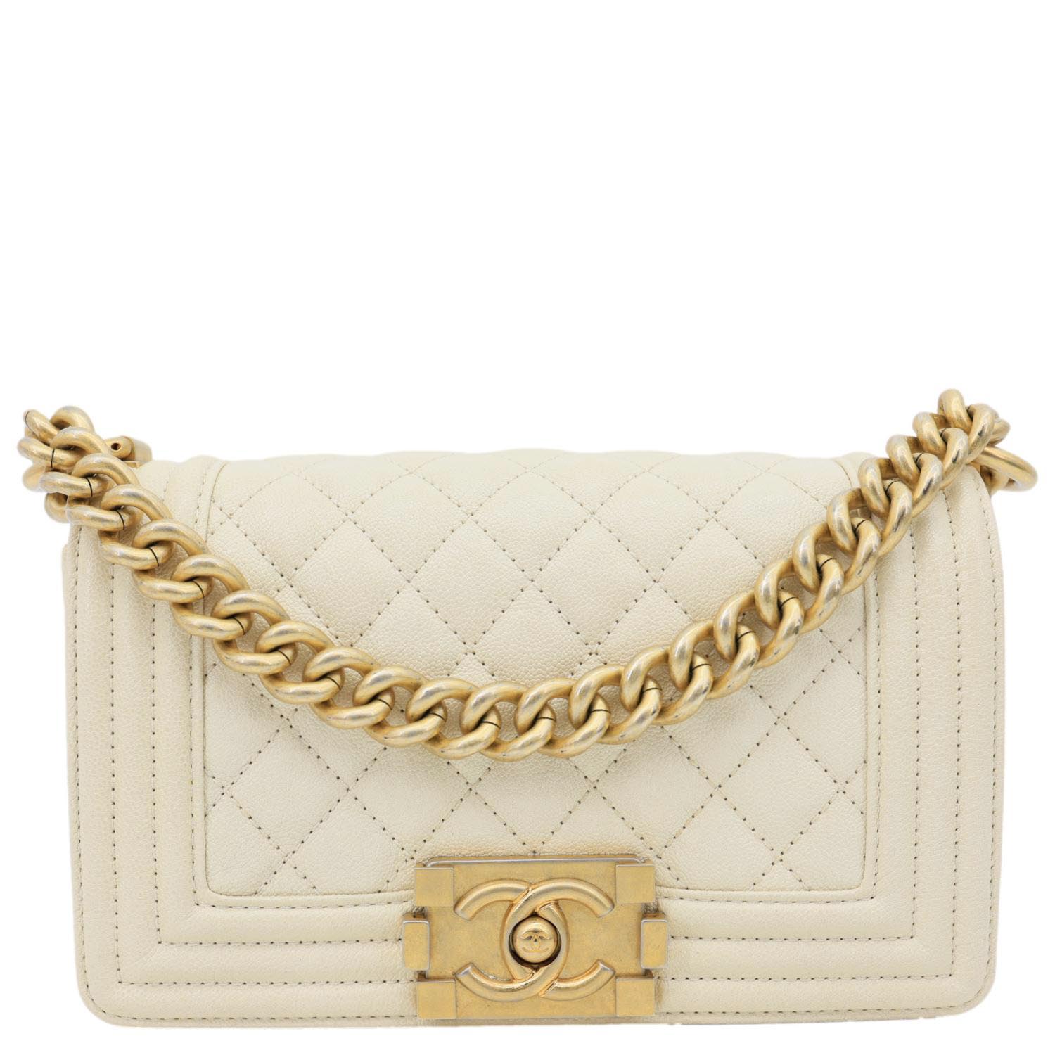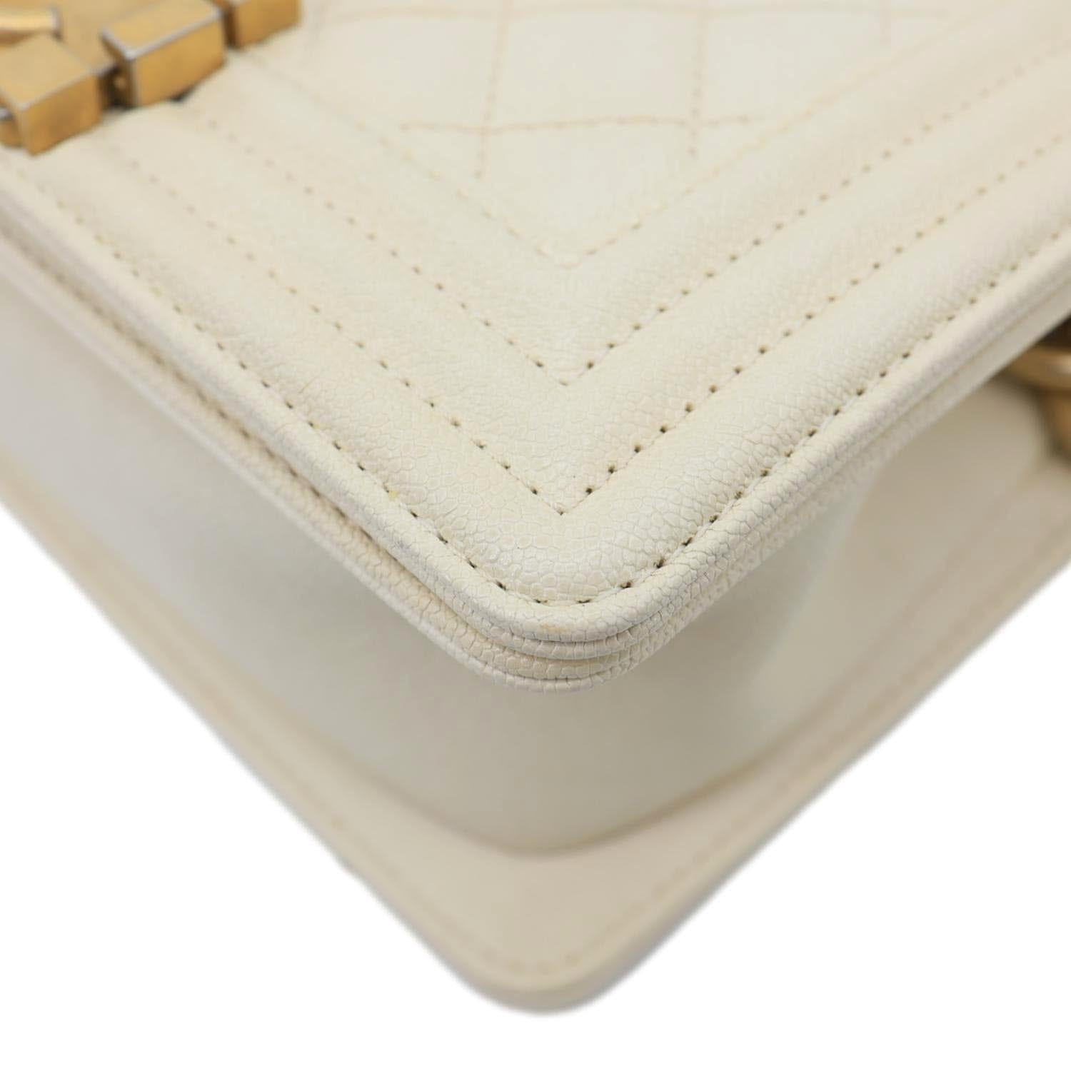 CHANEL Boy Flap Small in quilted caviar leather offers timeless elegance with a bold, structured silhouette. White finish and signature chain shoulder strap make it a standout piece for chic, everyday luxury.