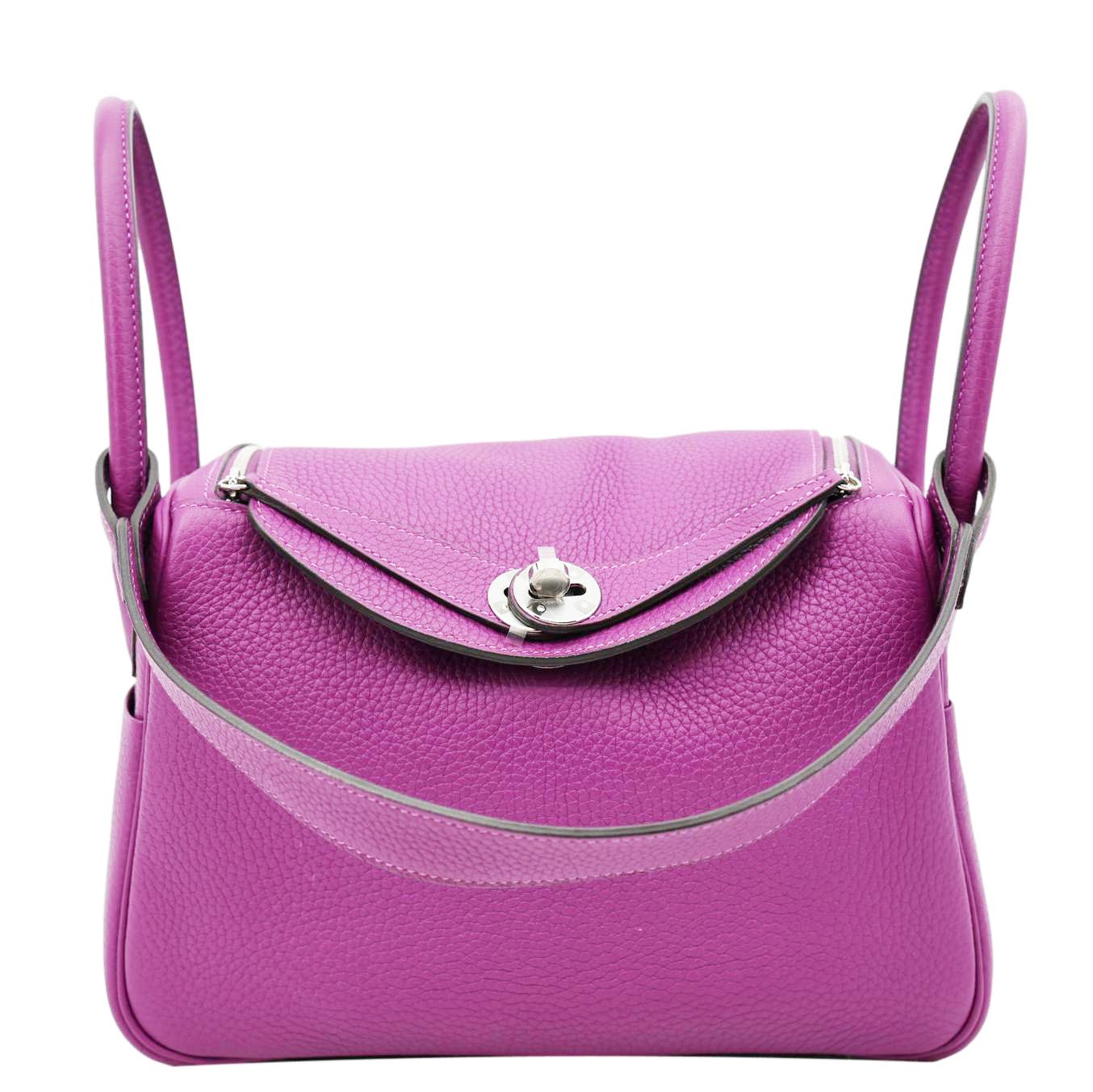 The Hermès Lindy 26 in Taurillon Clemence leather showcases a soft, slouchy silhouette with a structured yet relaxed feel. Designed in a rich purple shade, it features dual top handles, a shoulder strap, and signature Hermès craftsmanship.