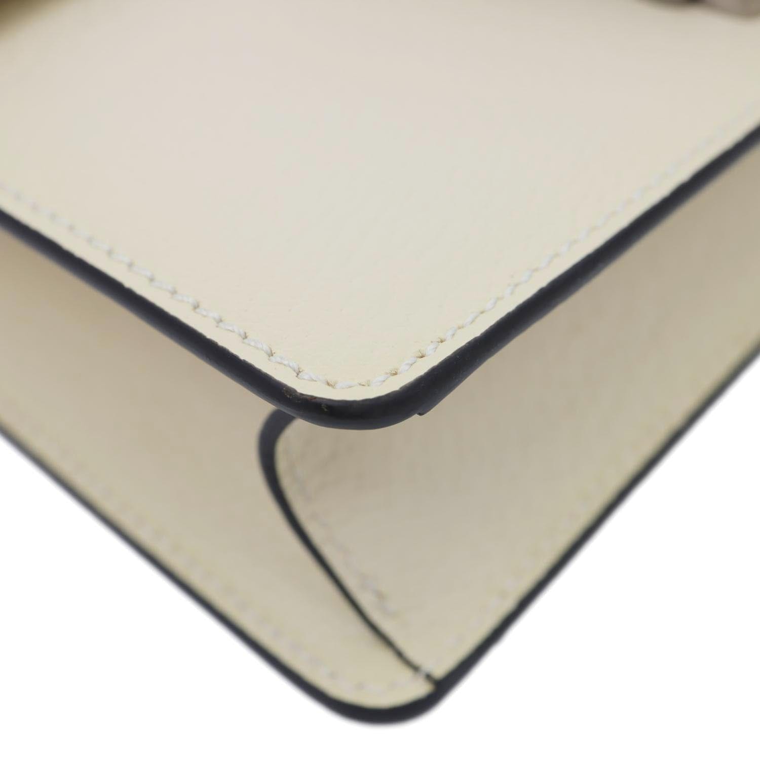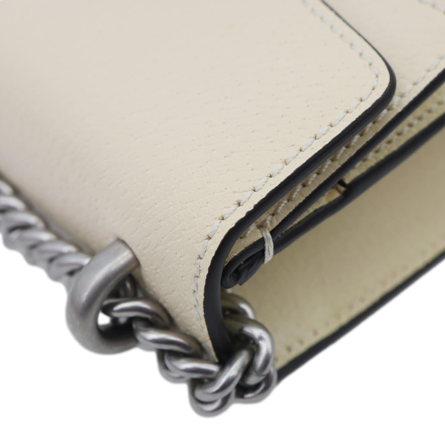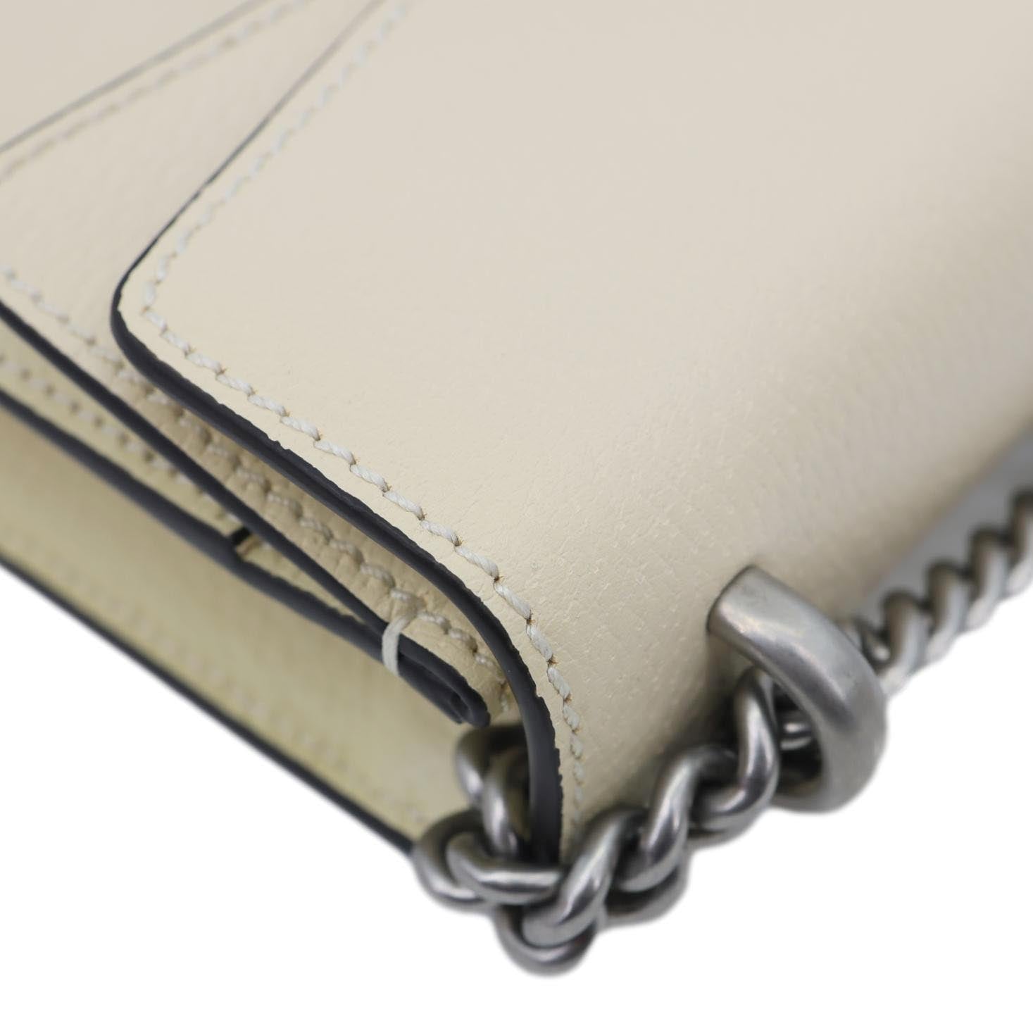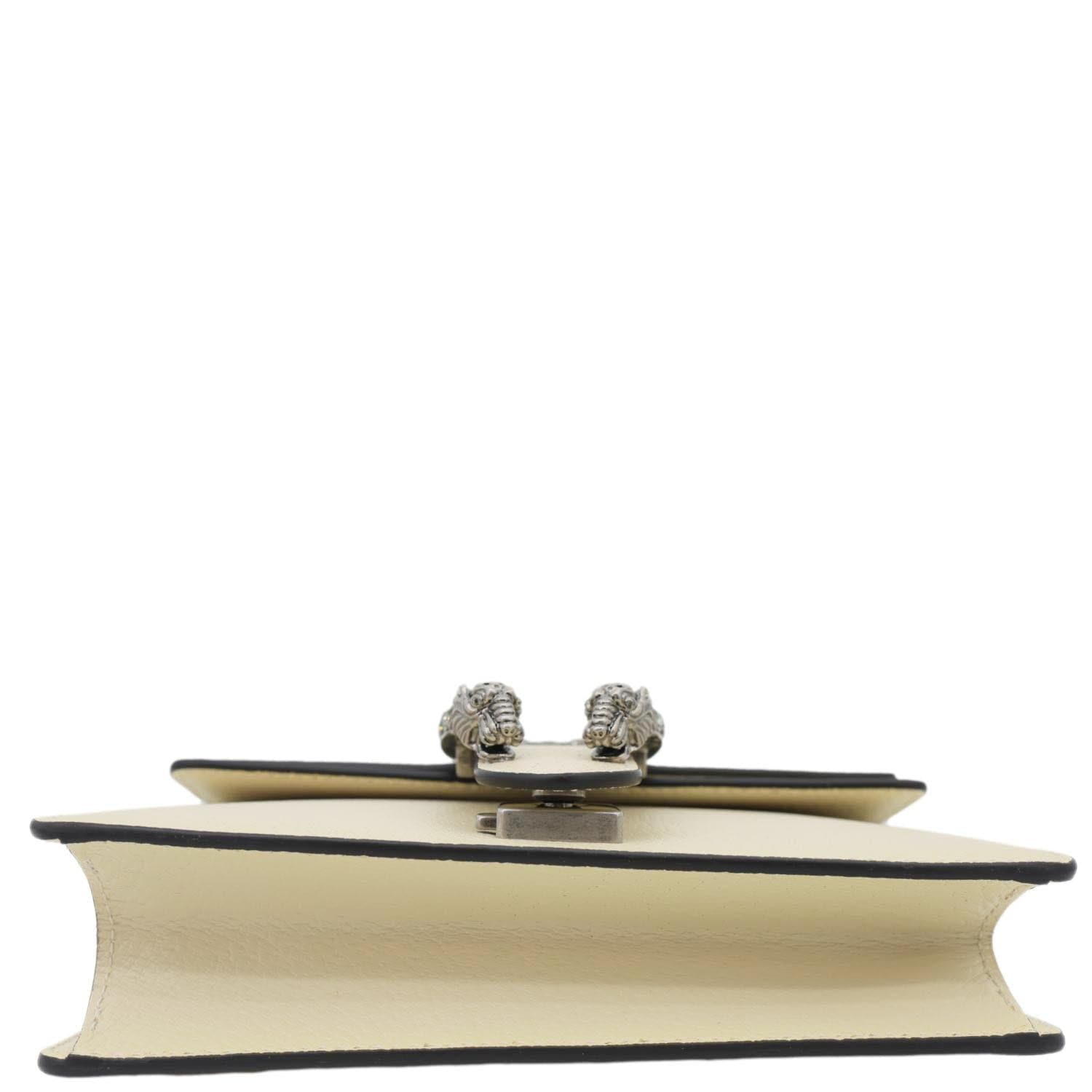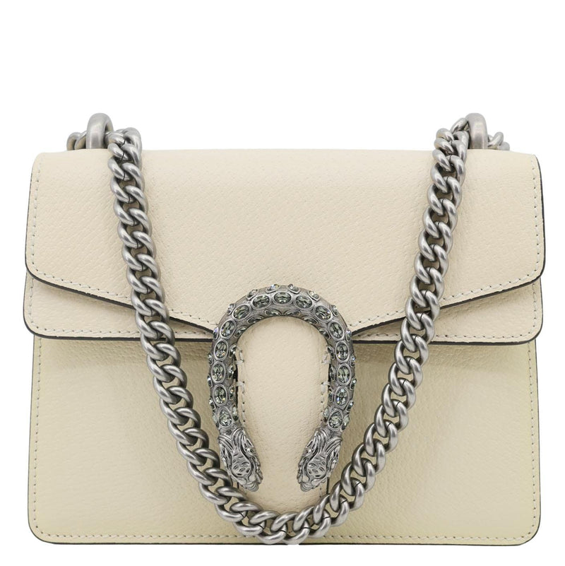 The Gucci Dionysus Mini is crafted from smooth leather in an elegant off-white shade. Finished with the iconic tiger-head closure and a chain strap, it’s a refined crossbody perfect for day or evening.