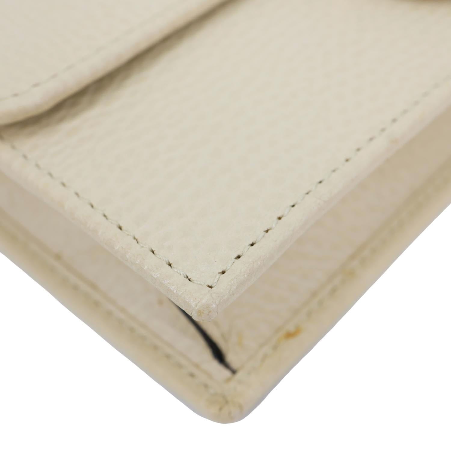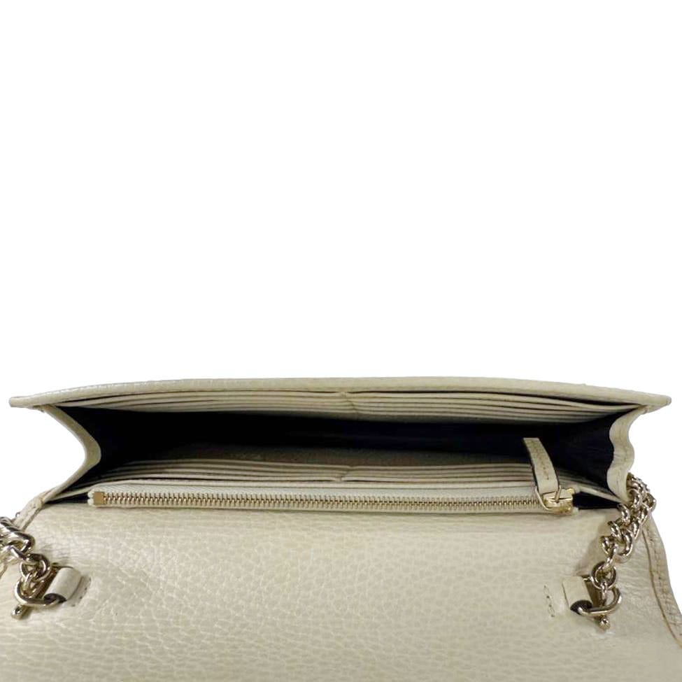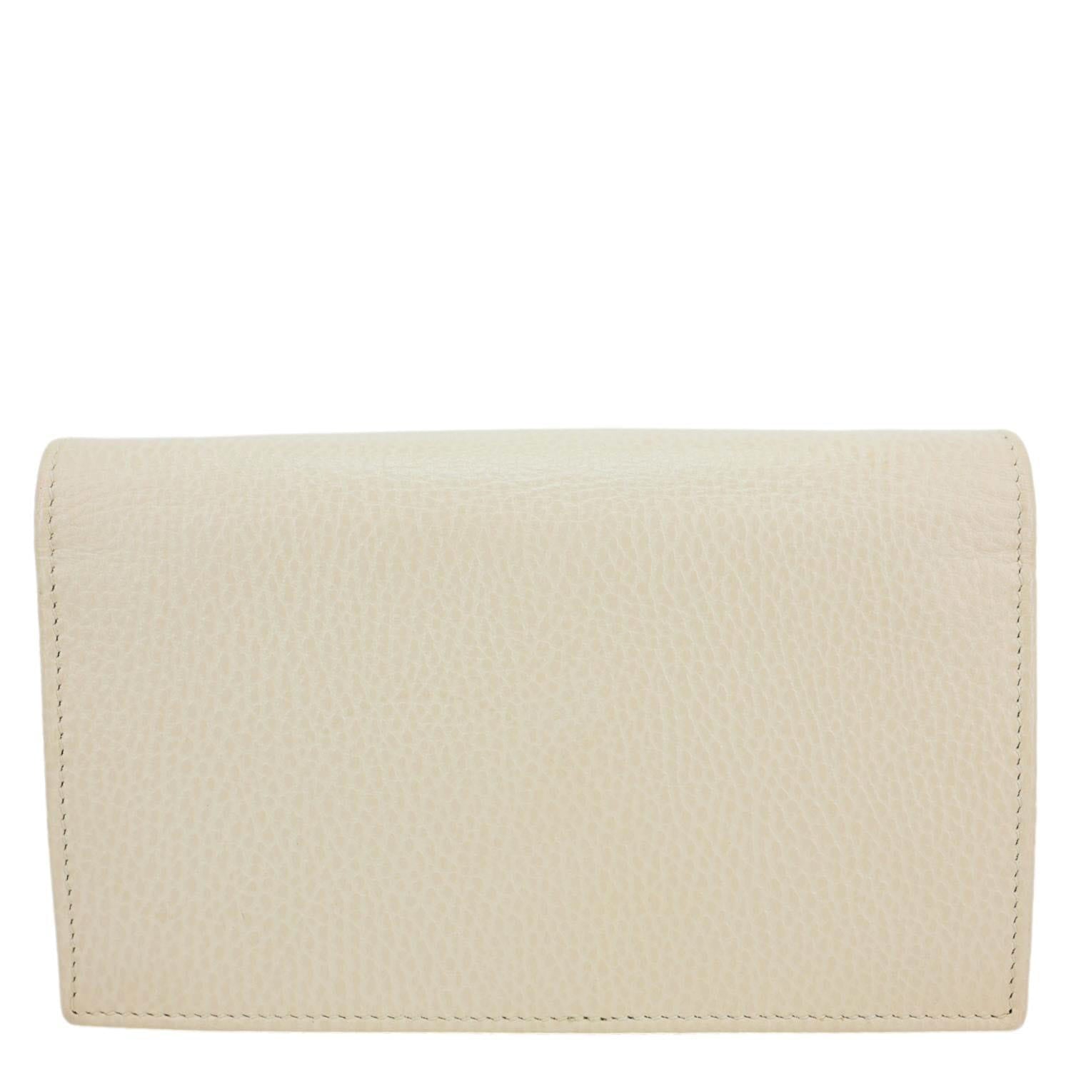 Elegant and timeless, this Gucci wallet on chain features smooth off-white leather with the signature interlocking GG logo. Compact yet functional, it offers organized compartments and a detachable chain for versatile day-to-night styling.