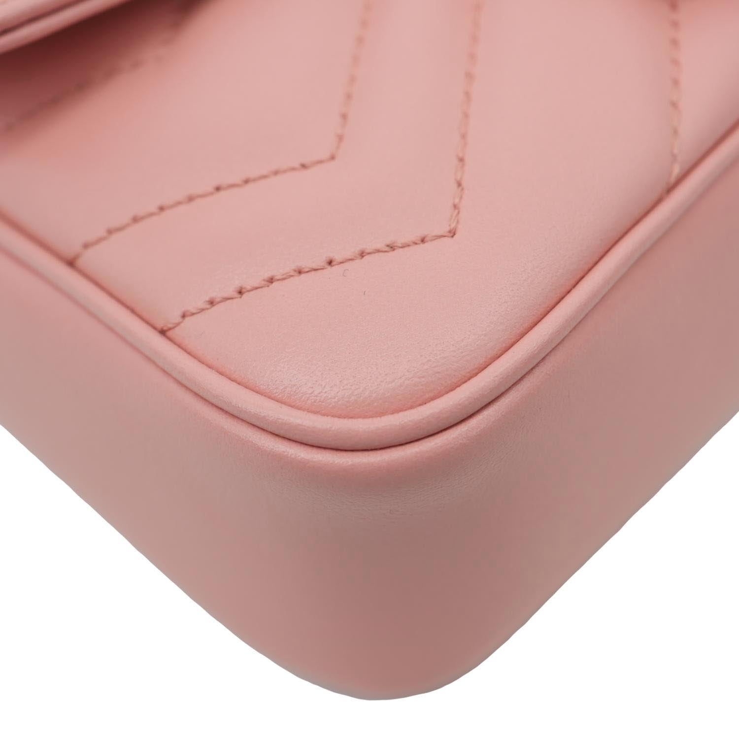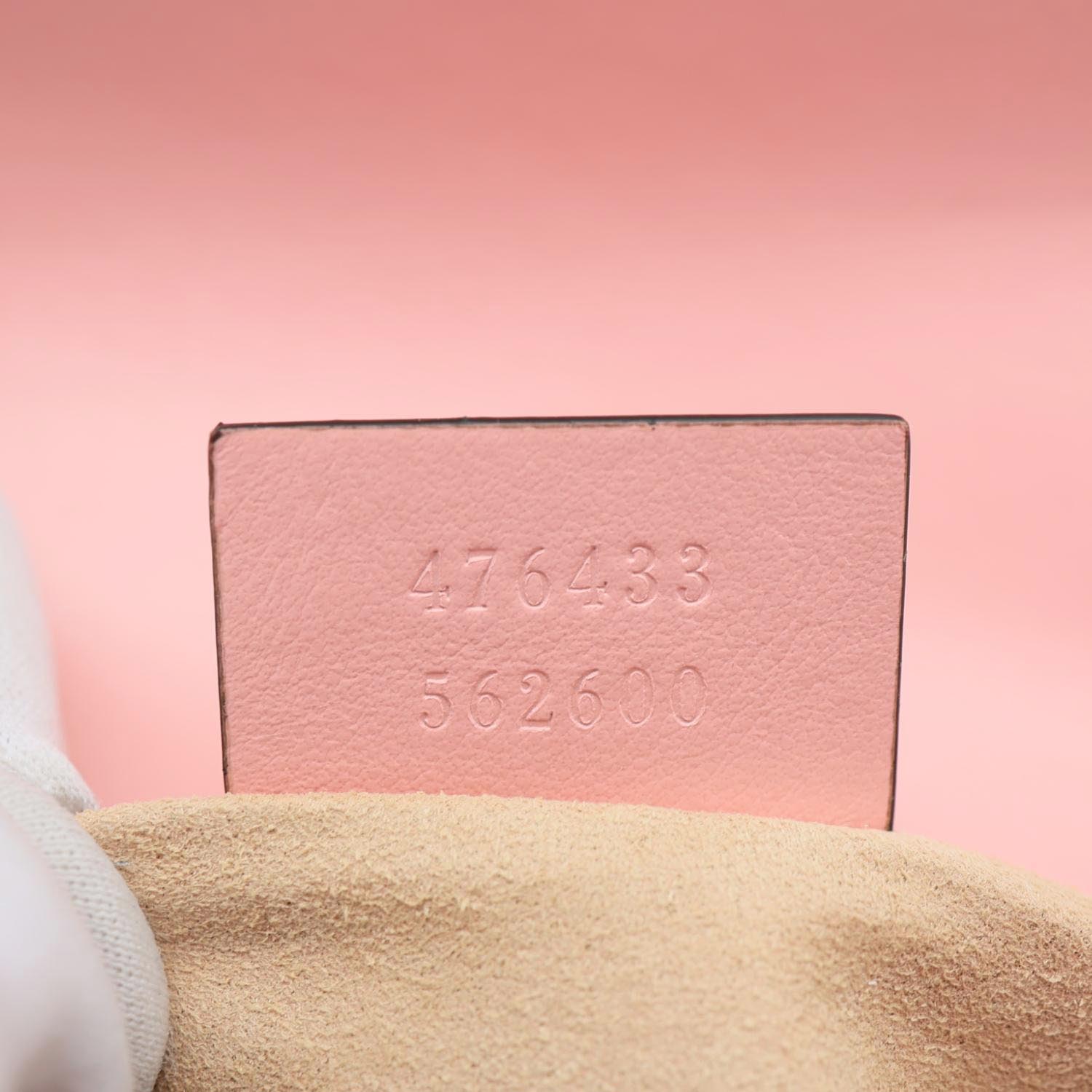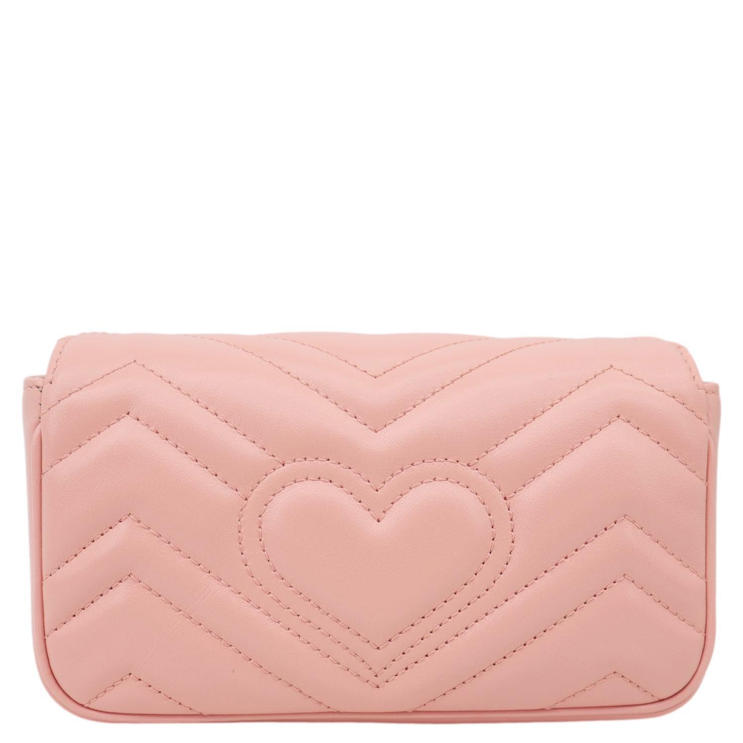 A charming Gucci GG Marmont Super Mini crafted in soft pink matelassé leather with a compact silhouette. Features the iconic GG logo and chain crossbody strap, perfect for carrying essentials in signature style.