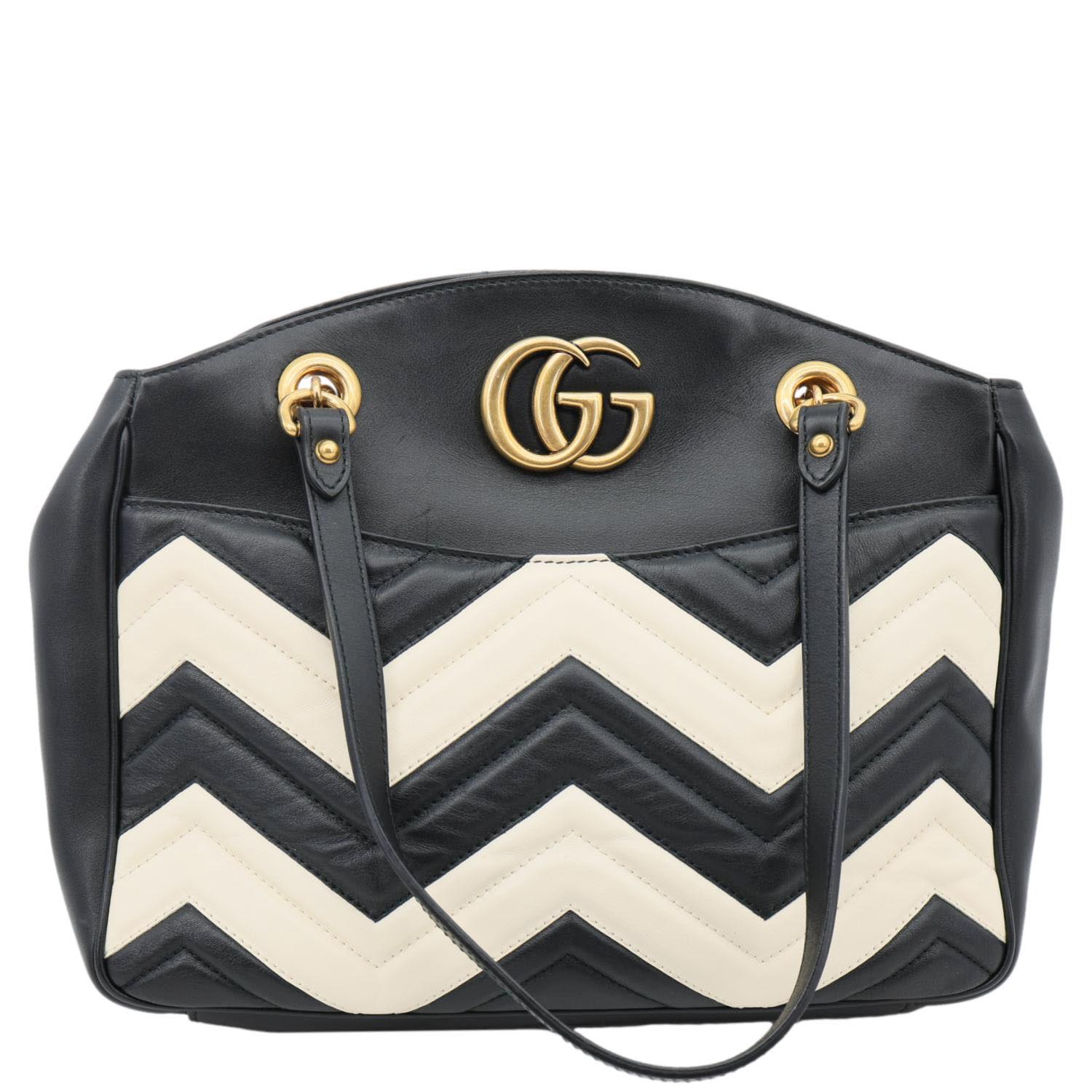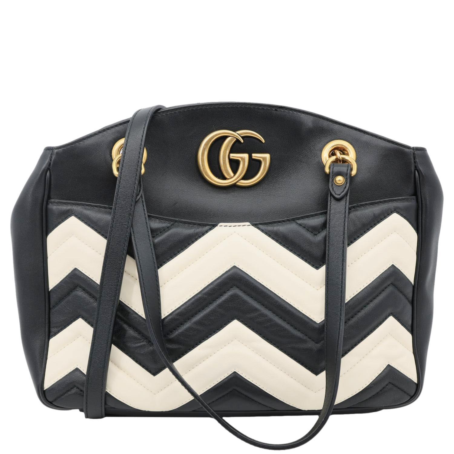 The Gucci GG Marmont Mini Tote is crafted from white leather with signature matelassé details and the iconic GG logo. Designed with dual handles and a chain shoulder strap, it offers both elegance and versatility in a compact size.
