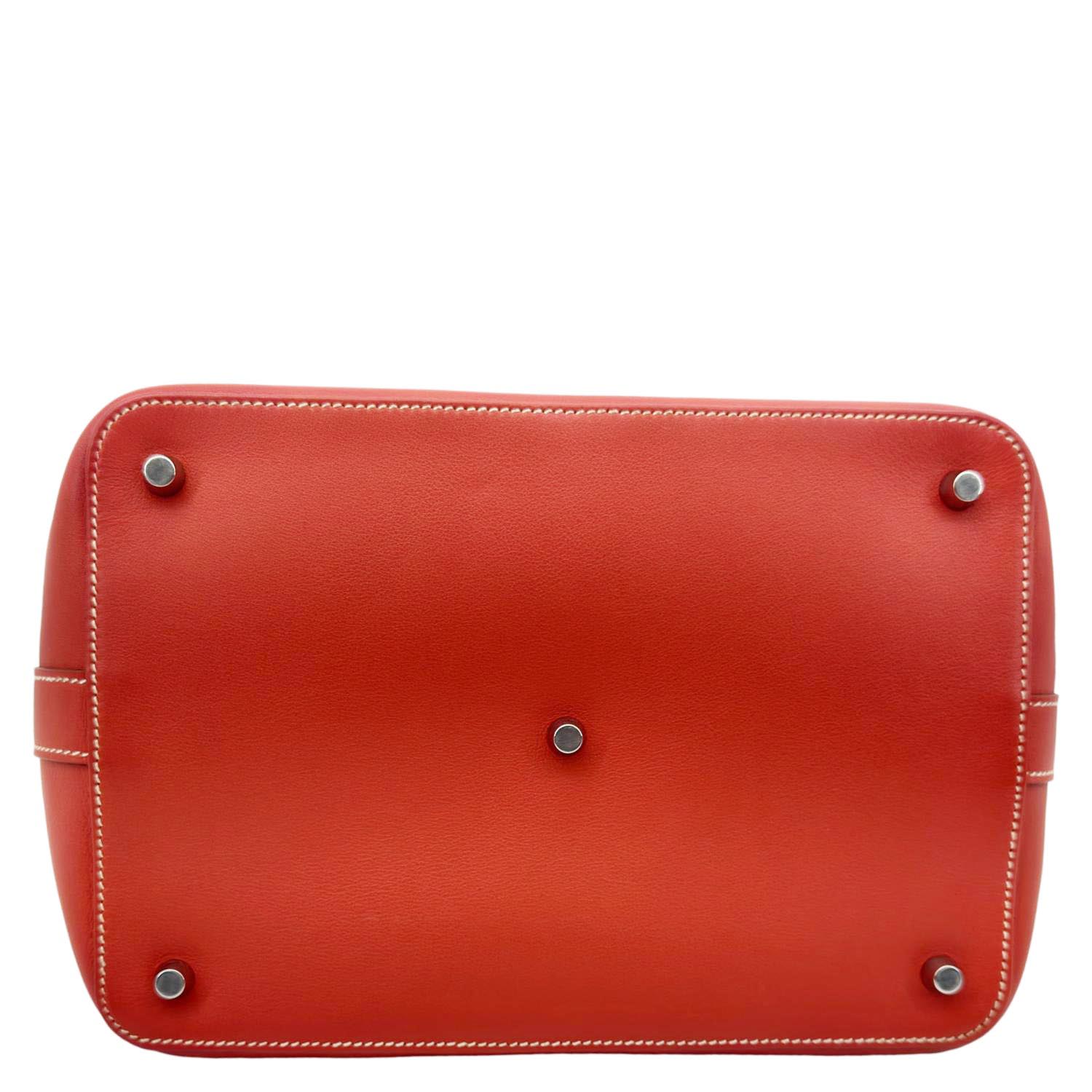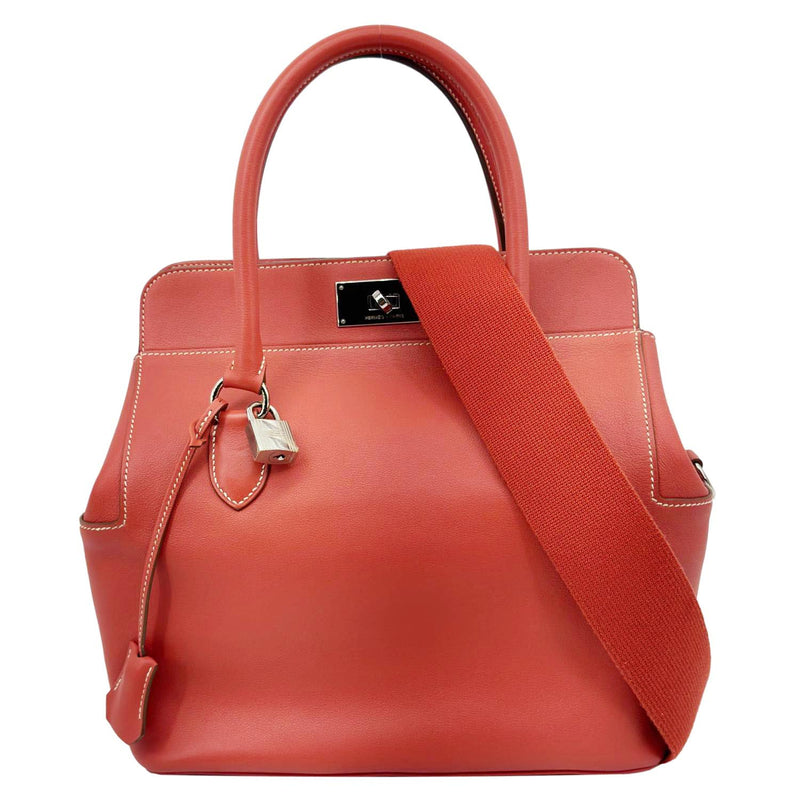 The HERMÈS Toolbox 26 in vibrant orange leather is a structured and sophisticated shoulder bag with a top handle and removable strap. Featuring palladium hardware and a signature clasp, it’s both chic and versatile for everyday elegance.