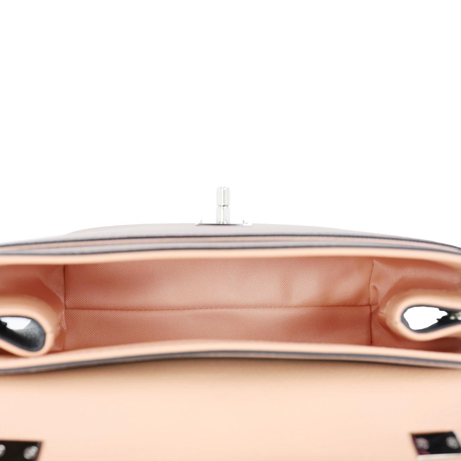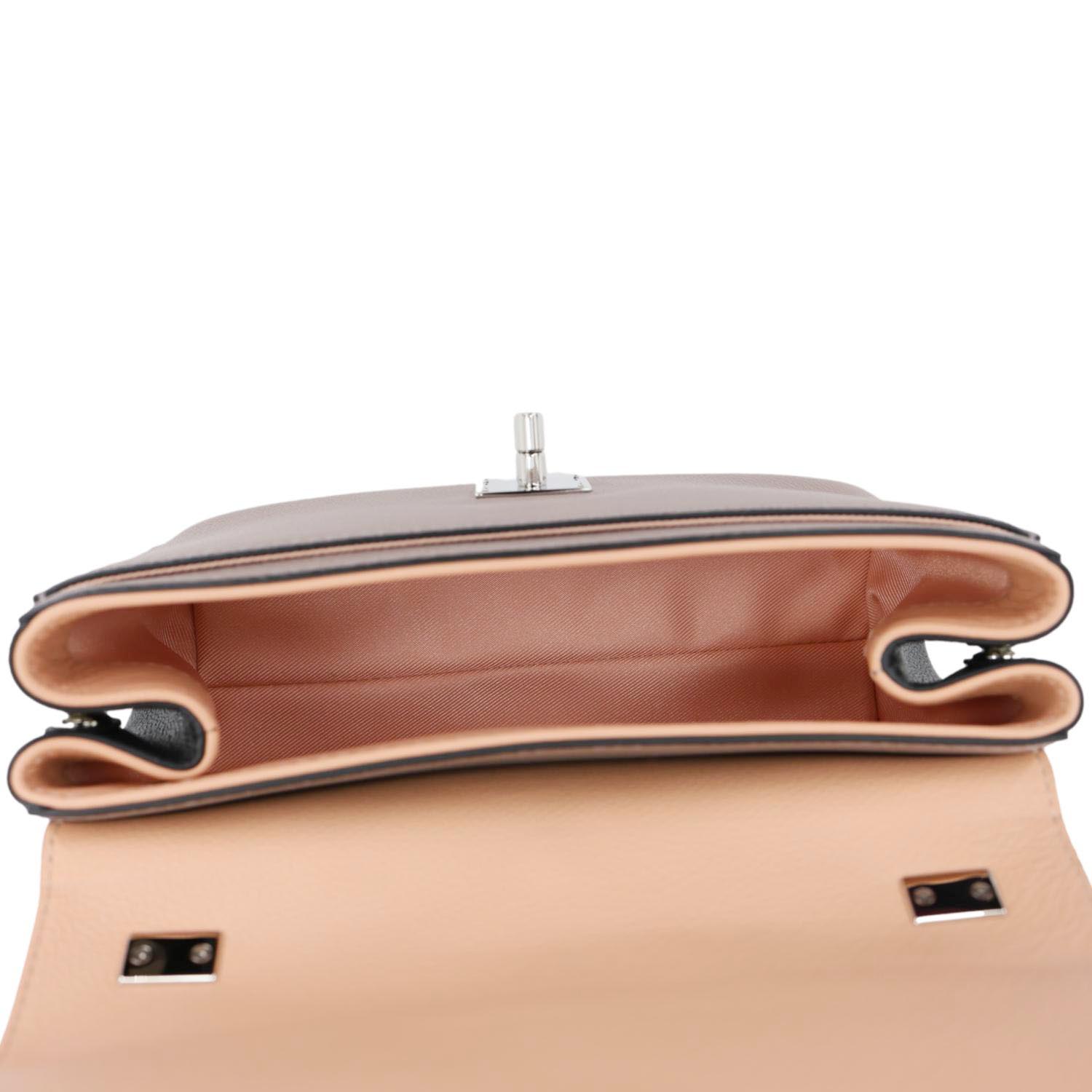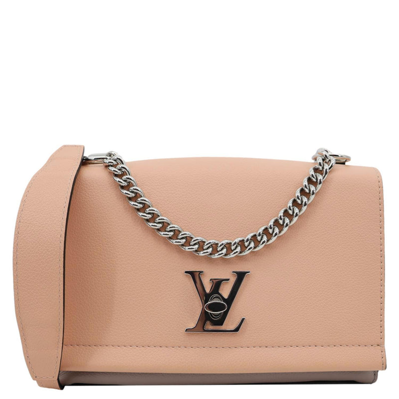 LOUIS VUITTON Lockme II BB Pebbled Leather Crossbody Bag in Rose Fog features soft grained leather with a sleek flap and LV twist-lock. A compact, feminine design perfect for chic everyday wear.