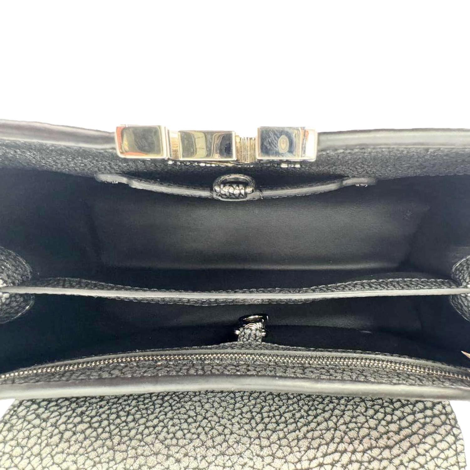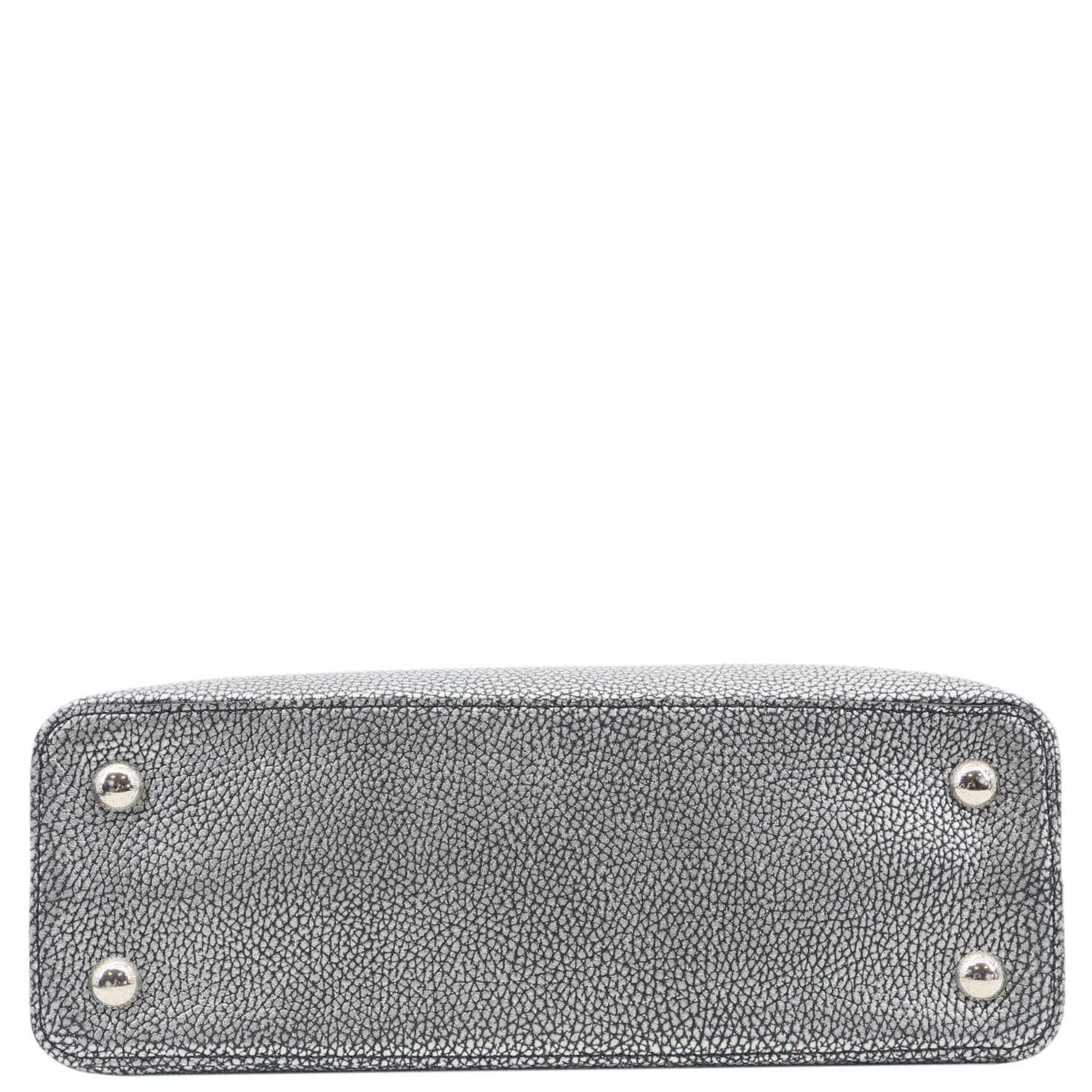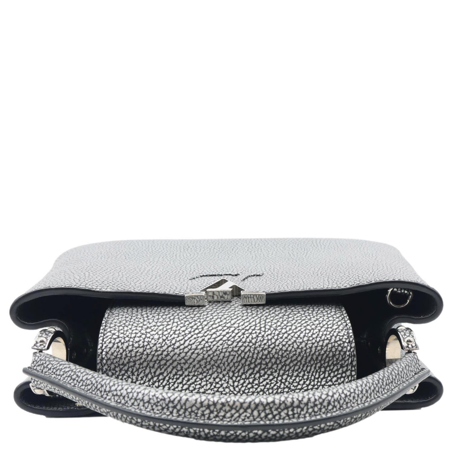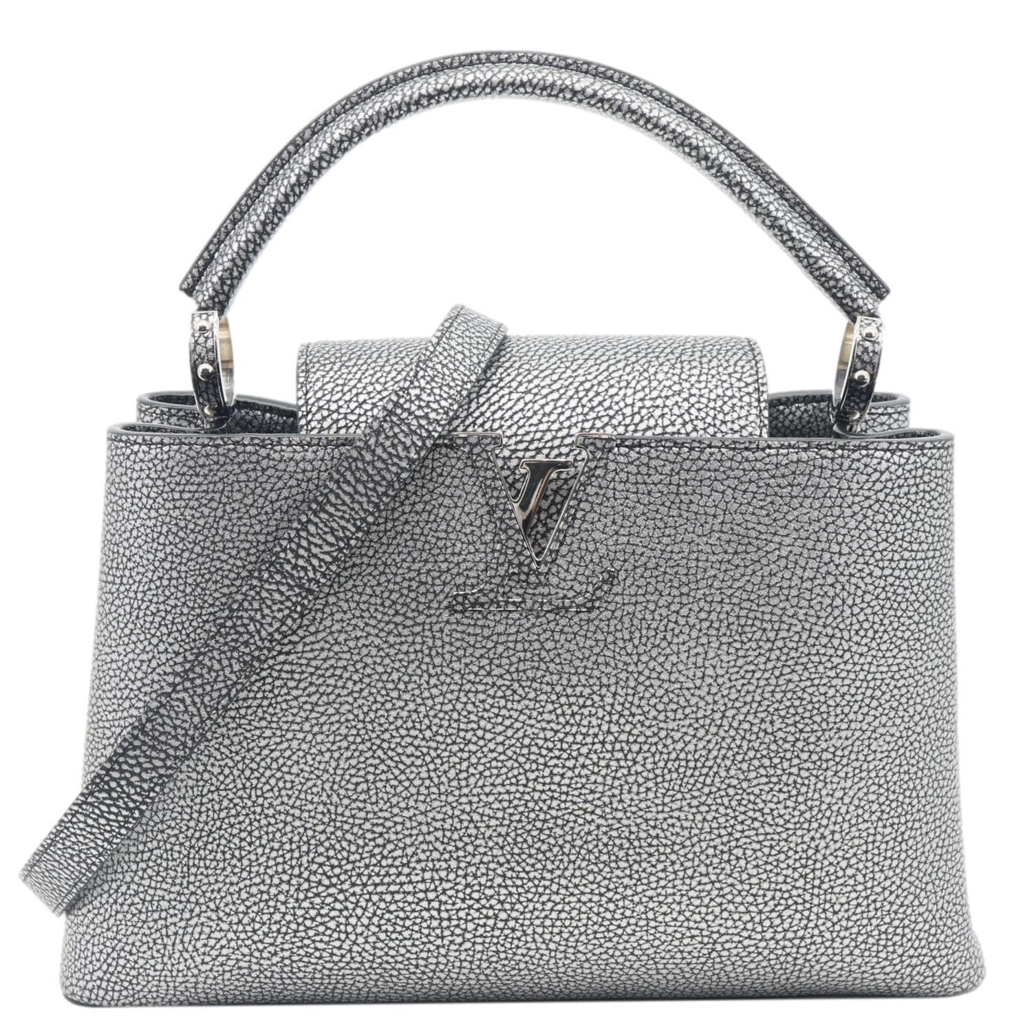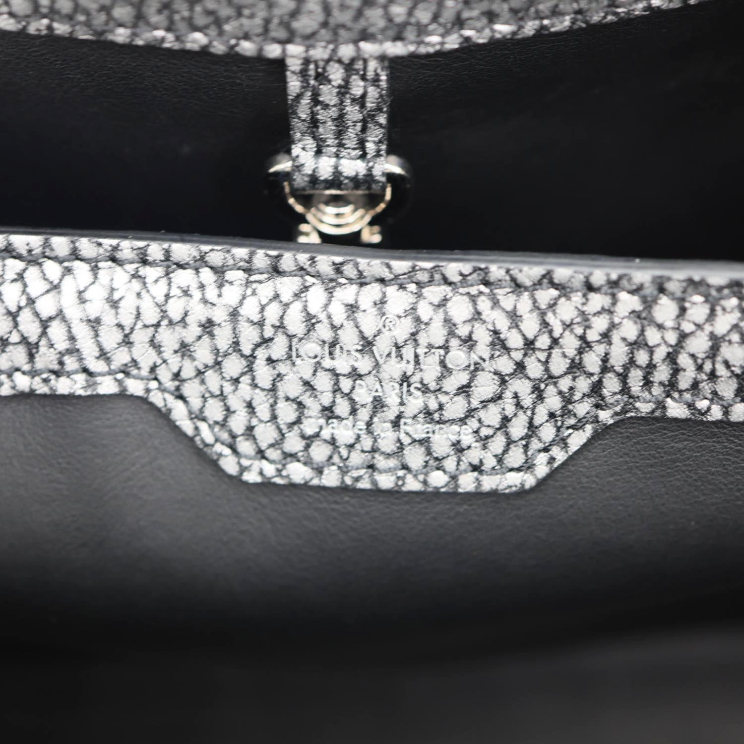 LOUIS VUITTON Capucines PM crafted in chrome Taurillon leather with a striking metallic finish. Refined silhouette features signature LV hardware and luxurious detailing. Silver tone adds a bold, modern statement to this iconic crossbody design.