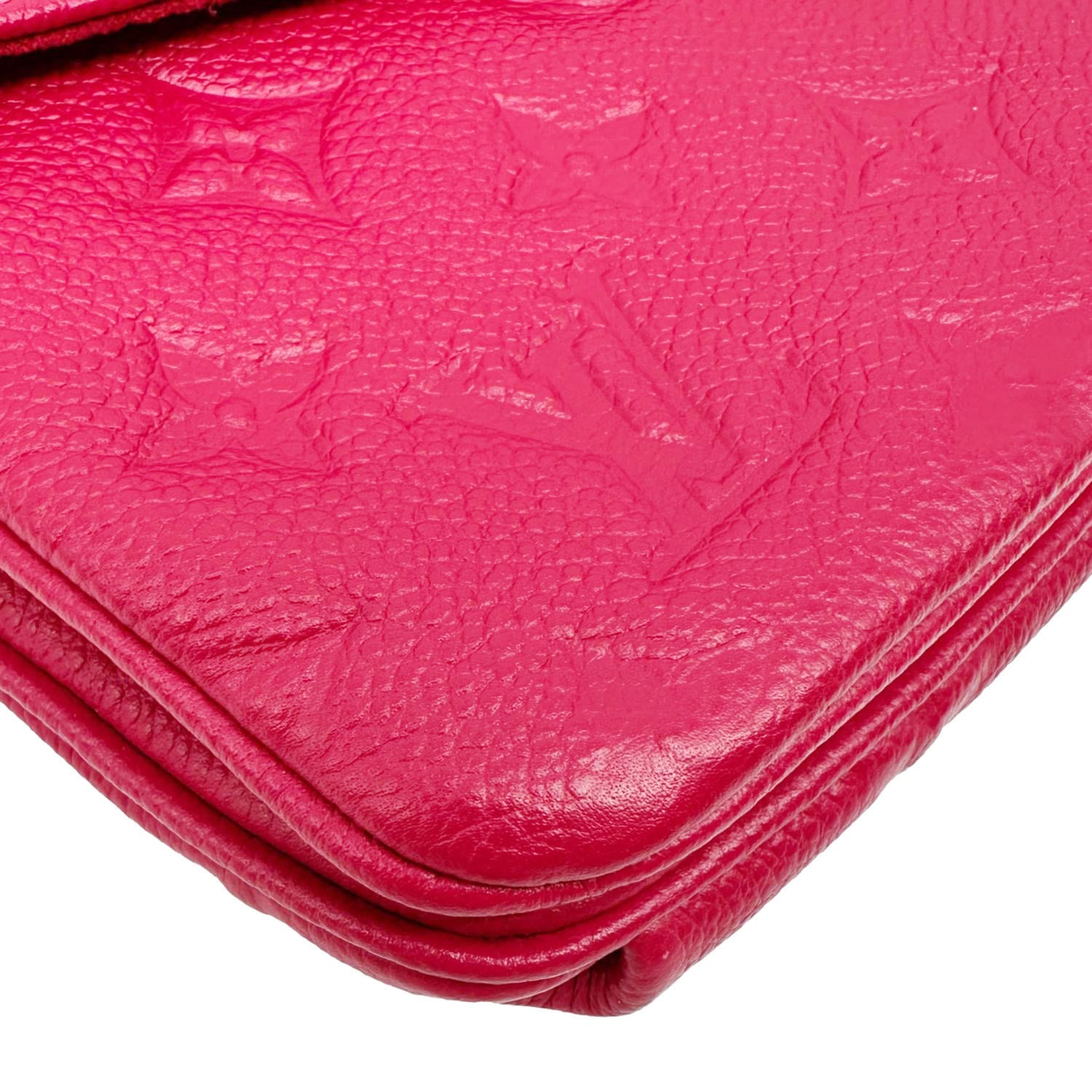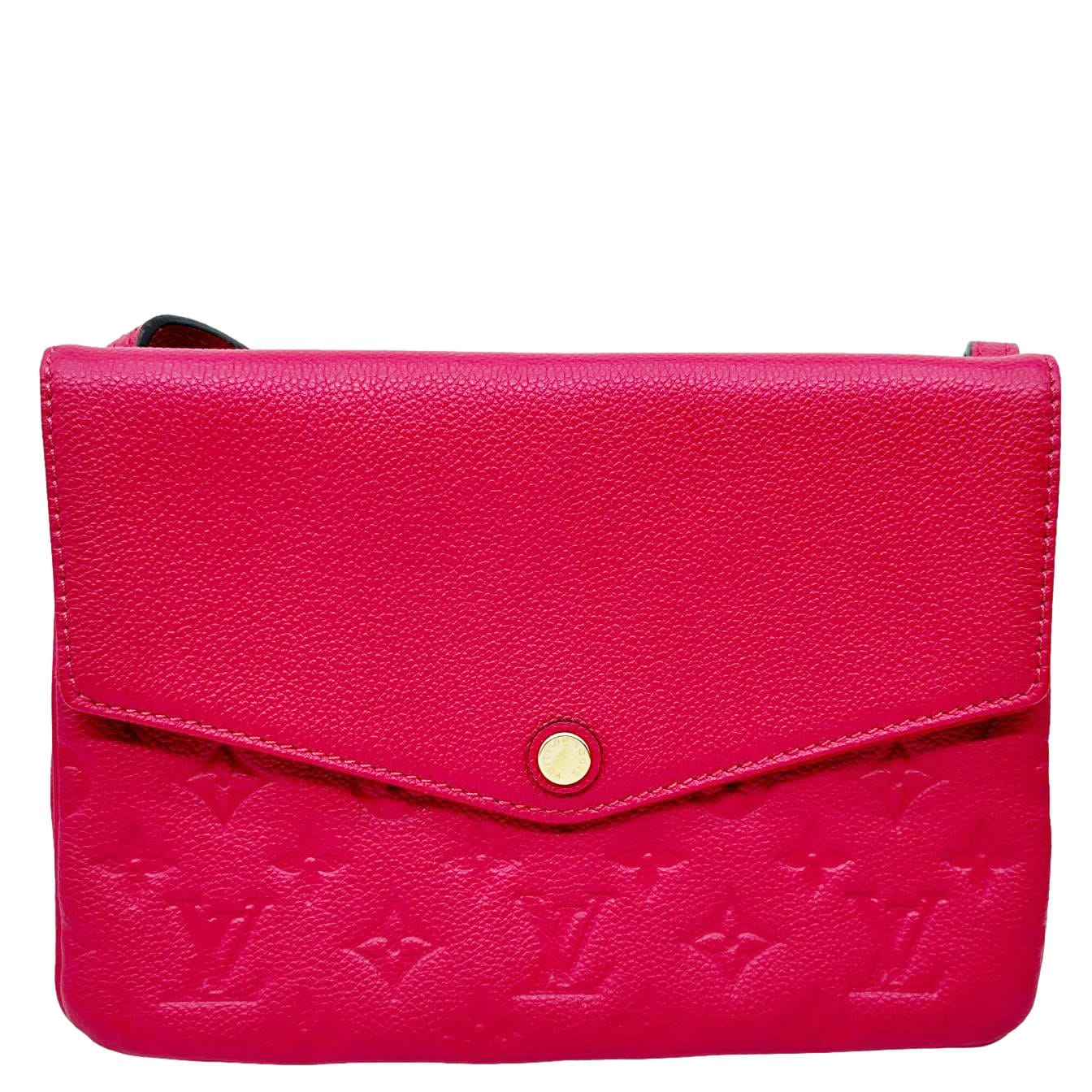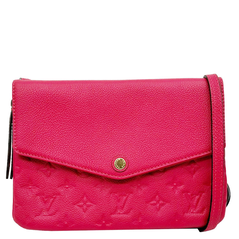 The Louis Vuitton Twice Pochette Monogram Empreinte Crossbody Bag in pink is a stylish and compact accessory crafted from soft embossed leather featuring the signature LV monogram. It offers dual compartments for easy organization while maintaining a sleek, feminine design.