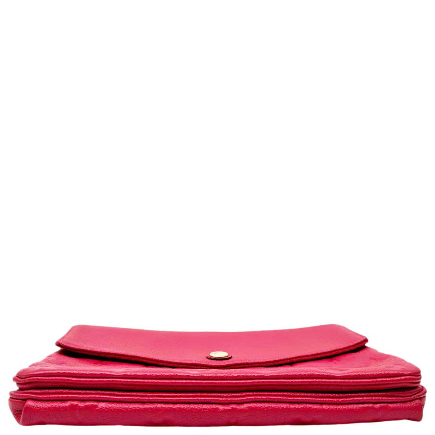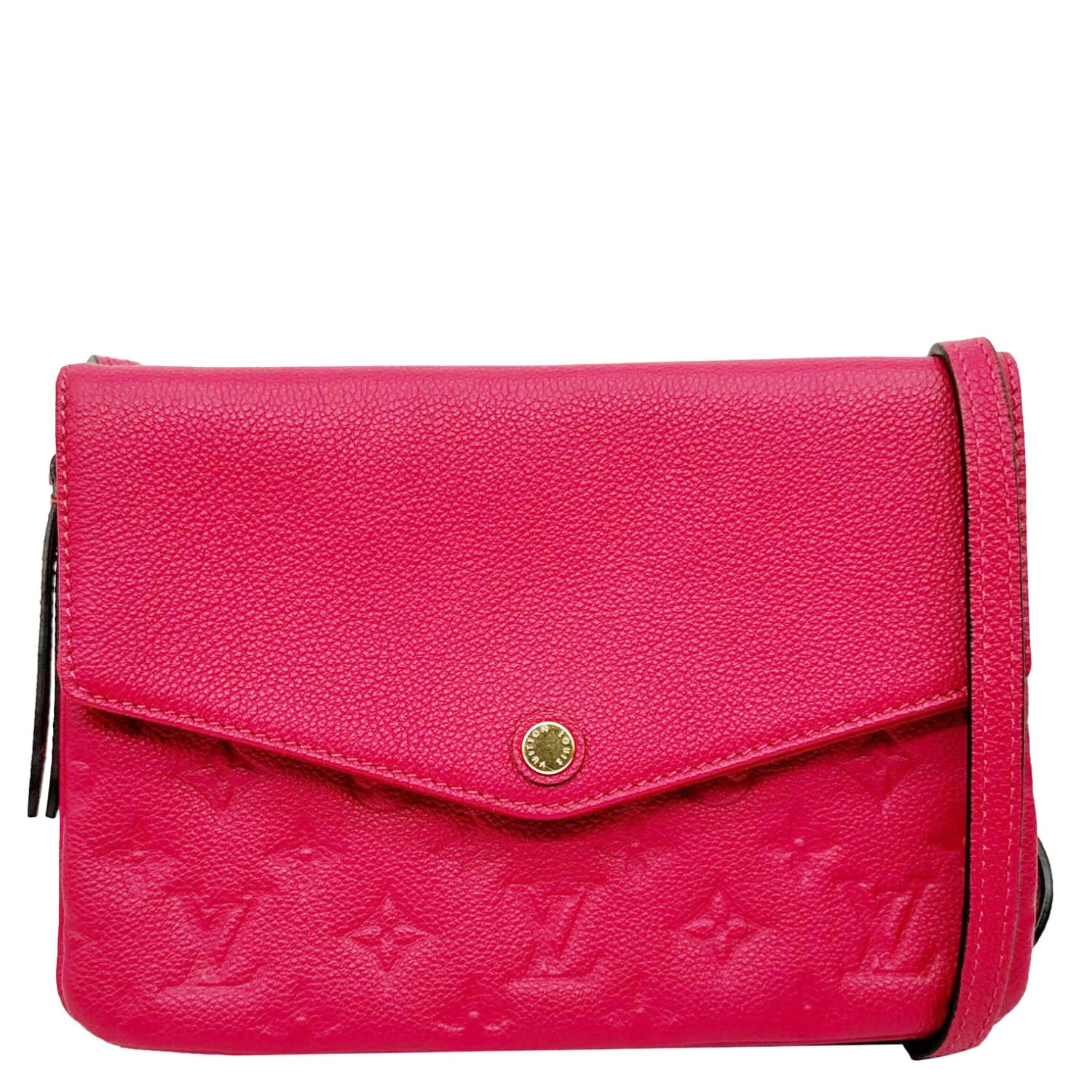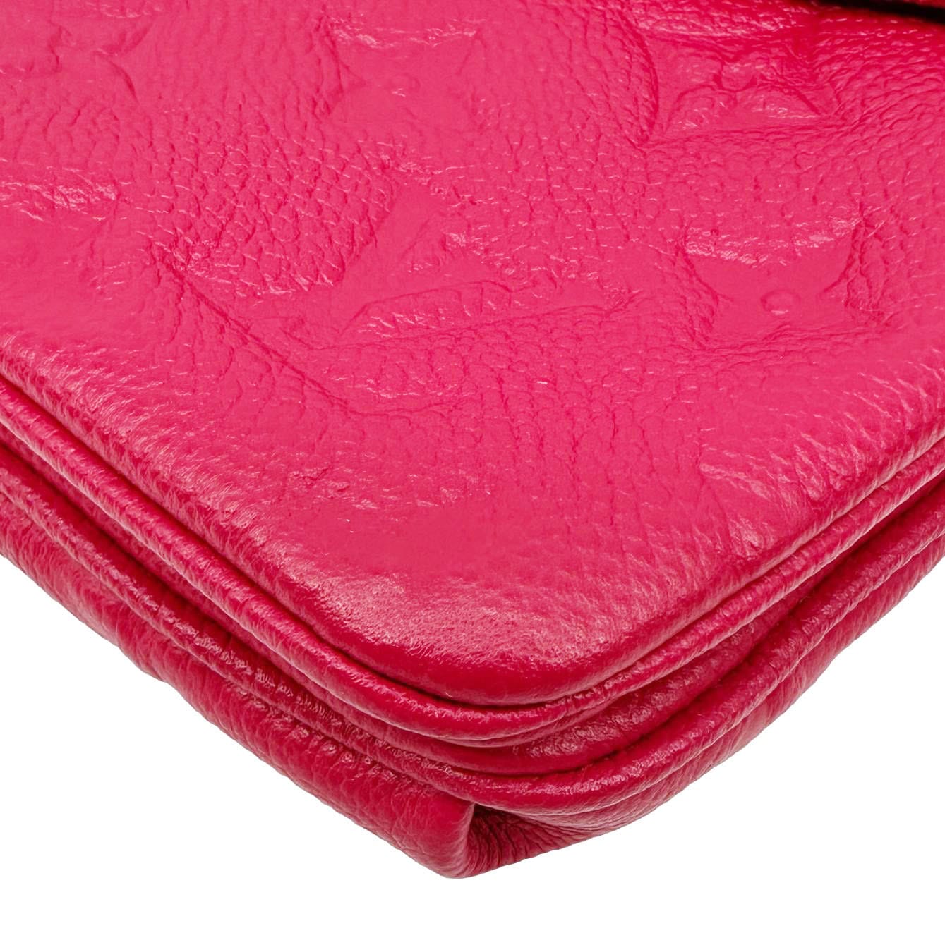 The Louis Vuitton Twice Pochette Monogram Empreinte Crossbody Bag in pink is a stylish and compact accessory crafted from soft embossed leather featuring the signature LV monogram. It offers dual compartments for easy organization while maintaining a sleek, feminine design.