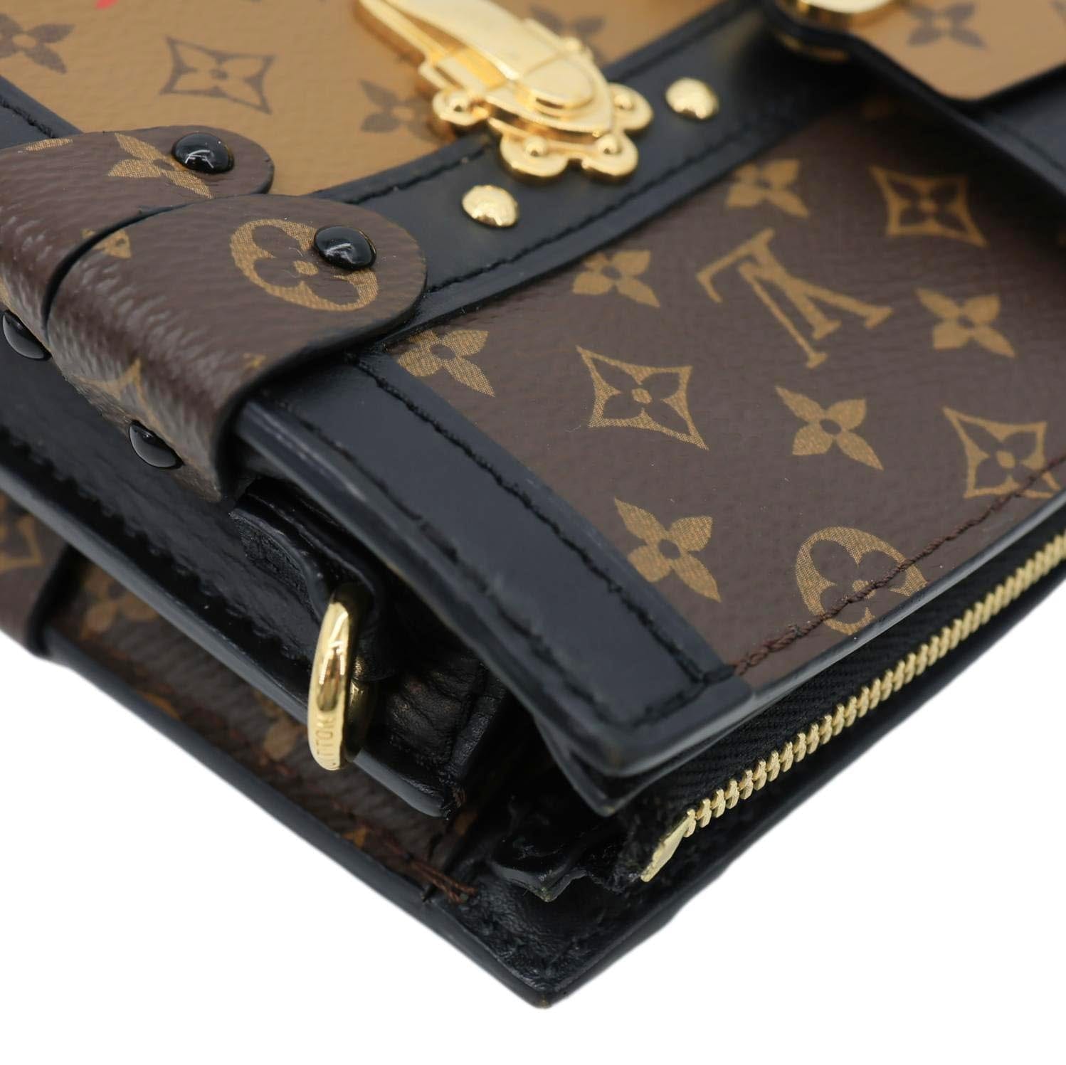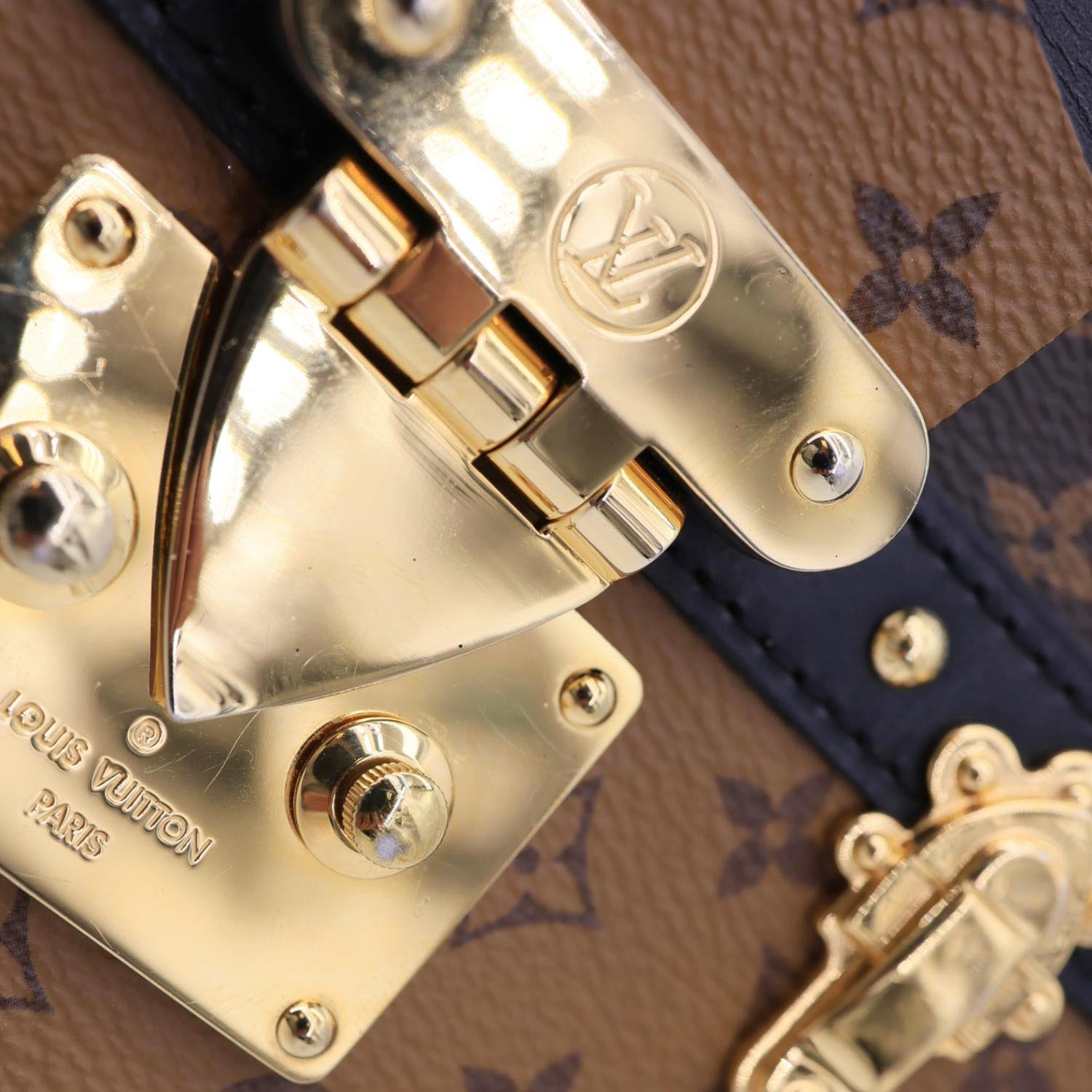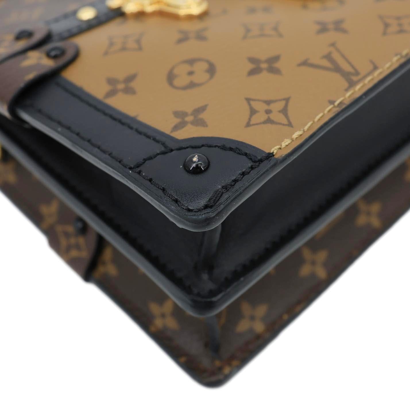 LOUIS VUITTON Trunk Clutch Reverse Monogram Crossbody Bag Brown features iconic Reverse Monogram canvas with a structured trunk-inspired silhouette and sleek gold-tone hardware. Compact and stylish, it’s perfect for carrying essentials with a modern luxury edge.