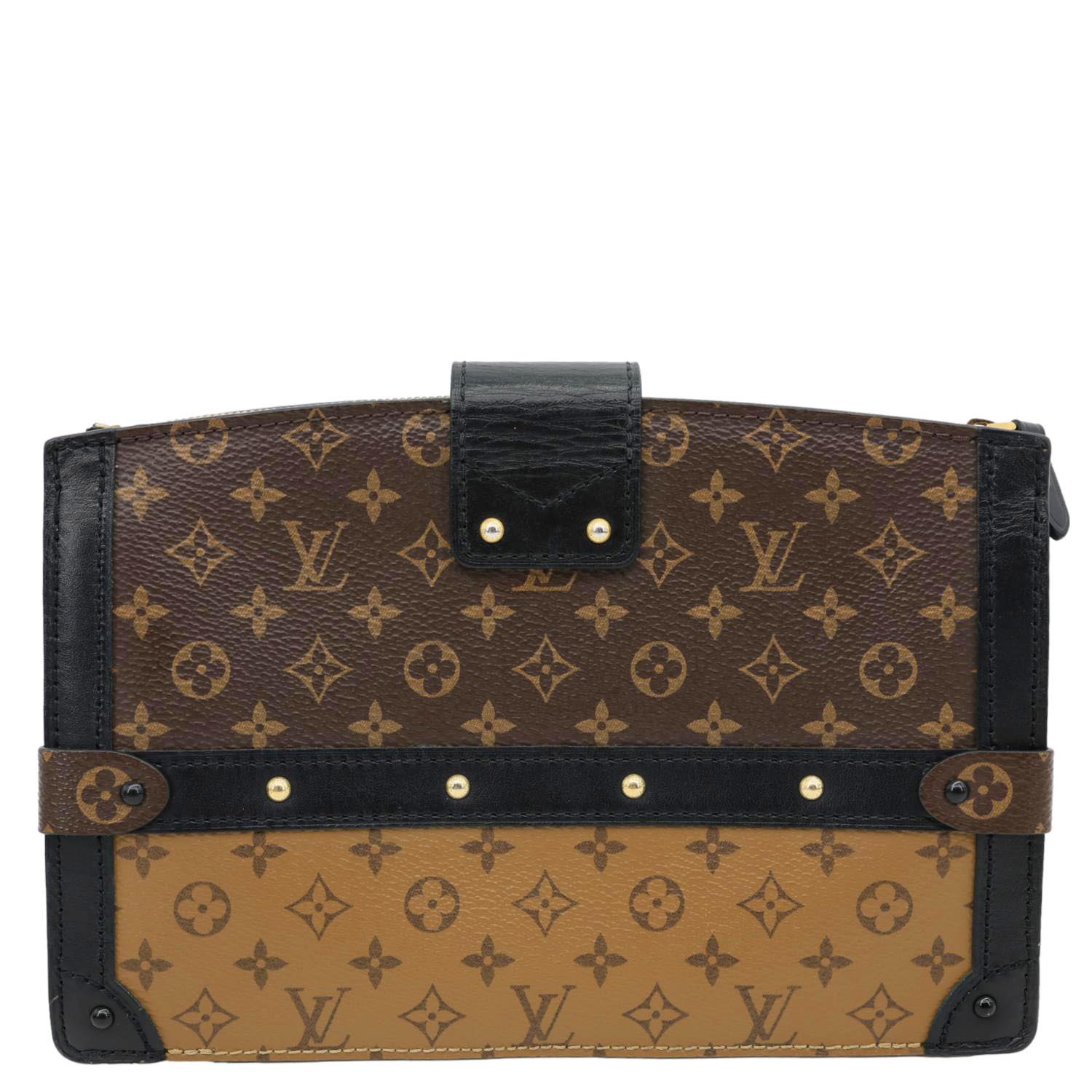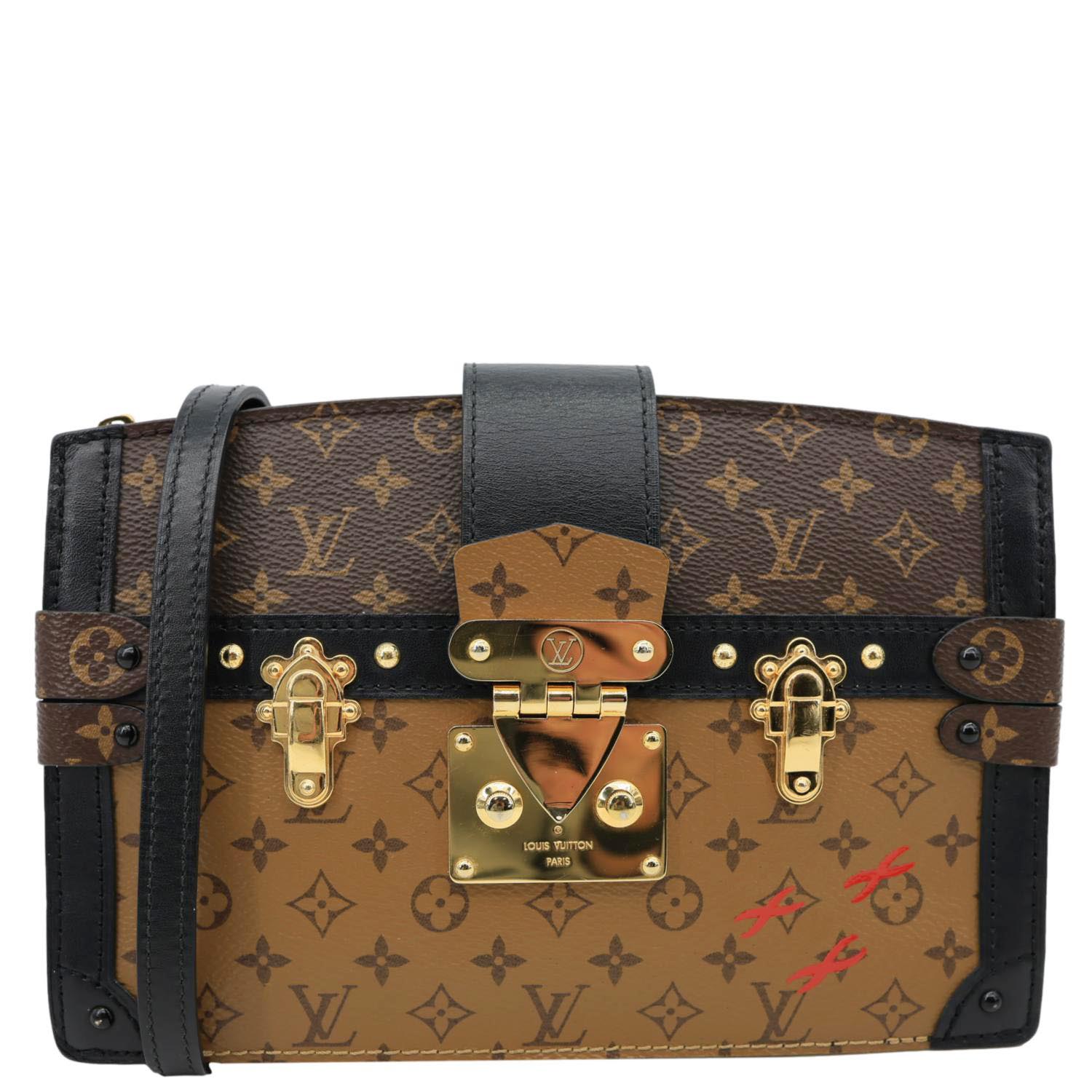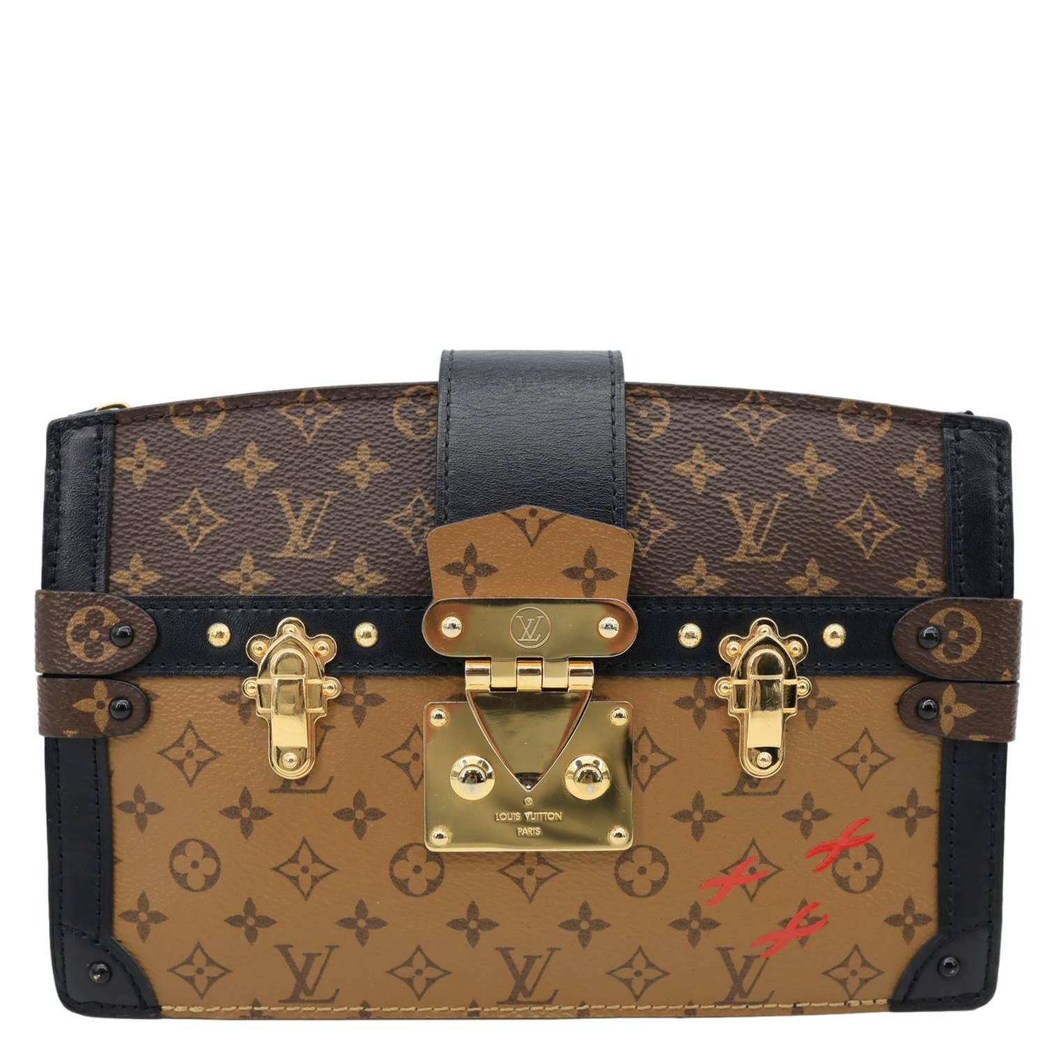 LOUIS VUITTON Trunk Clutch Reverse Monogram Crossbody Bag Brown features iconic Reverse Monogram canvas with a structured trunk-inspired silhouette and sleek gold-tone hardware. Compact and stylish, it’s perfect for carrying essentials with a modern luxury edge.