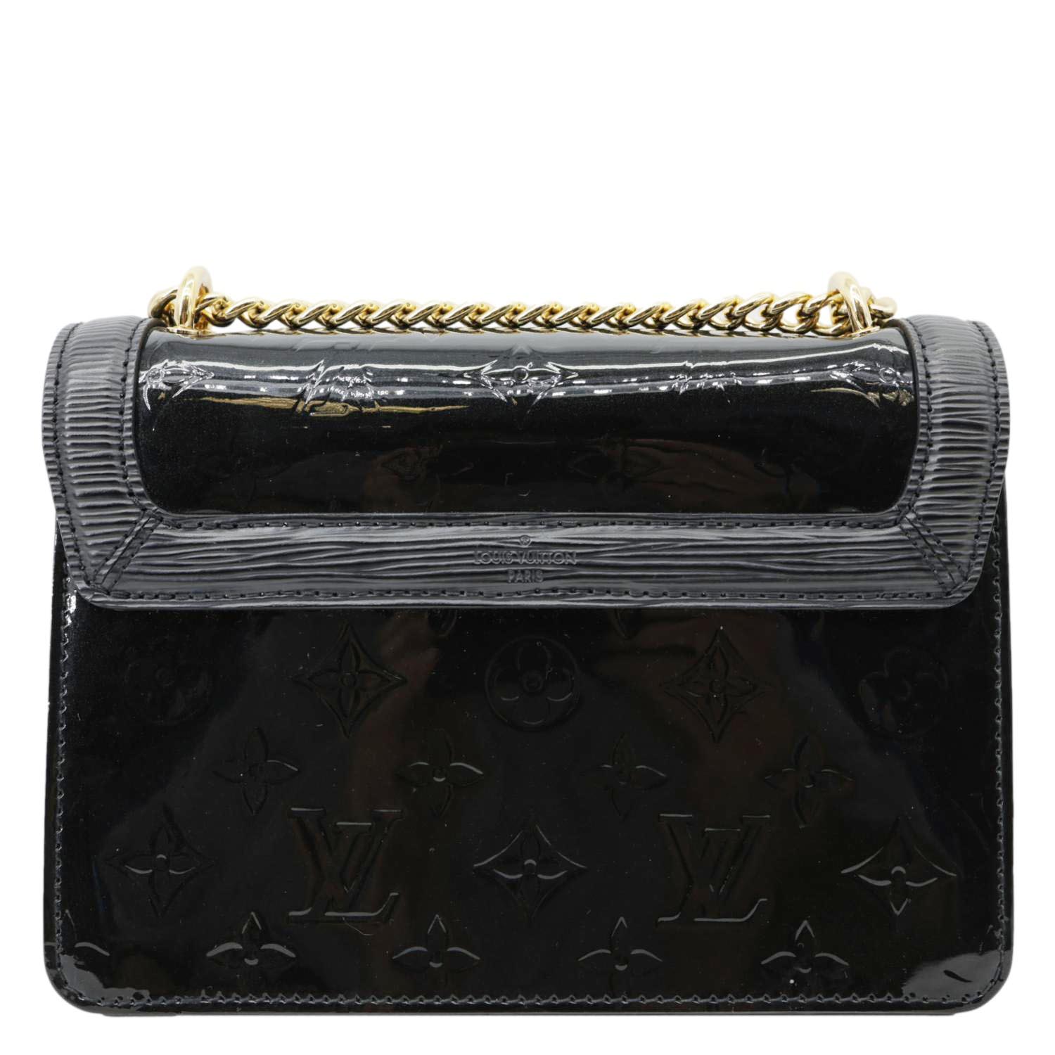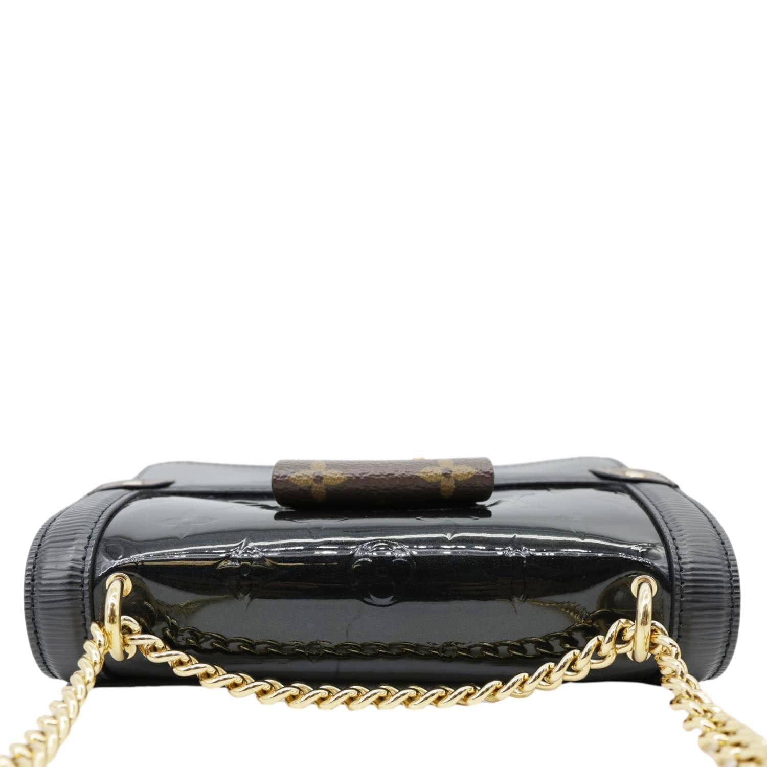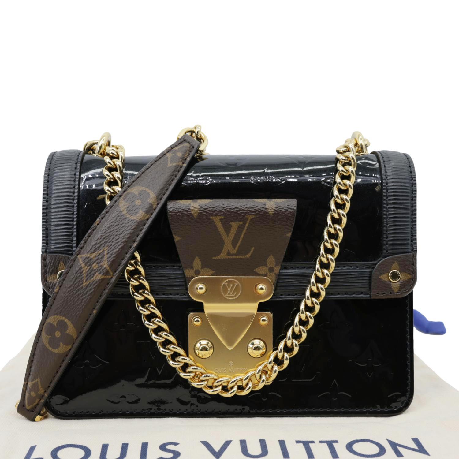 LOUIS VUITTON Wynwood crafted in glossy Monogram Vernis leather with a sleek black finish. Designed with a structured silhouette, chain strap, and polished accents for timeless elegance.