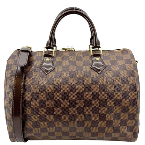 Item Details: The iconic Speedy 35 satchel from LOUIS VUITTON features the classic Damier Ebene pattern in brown,...