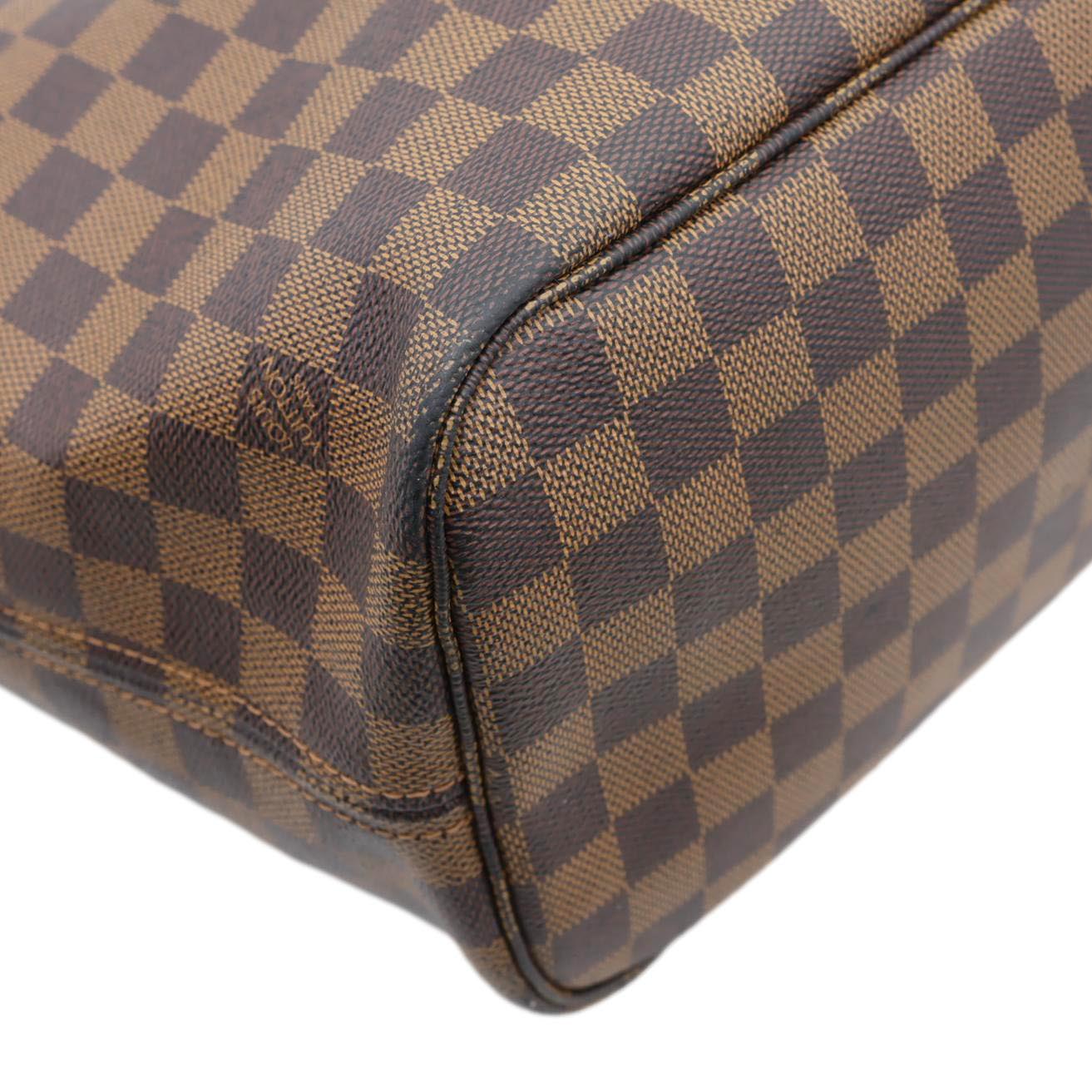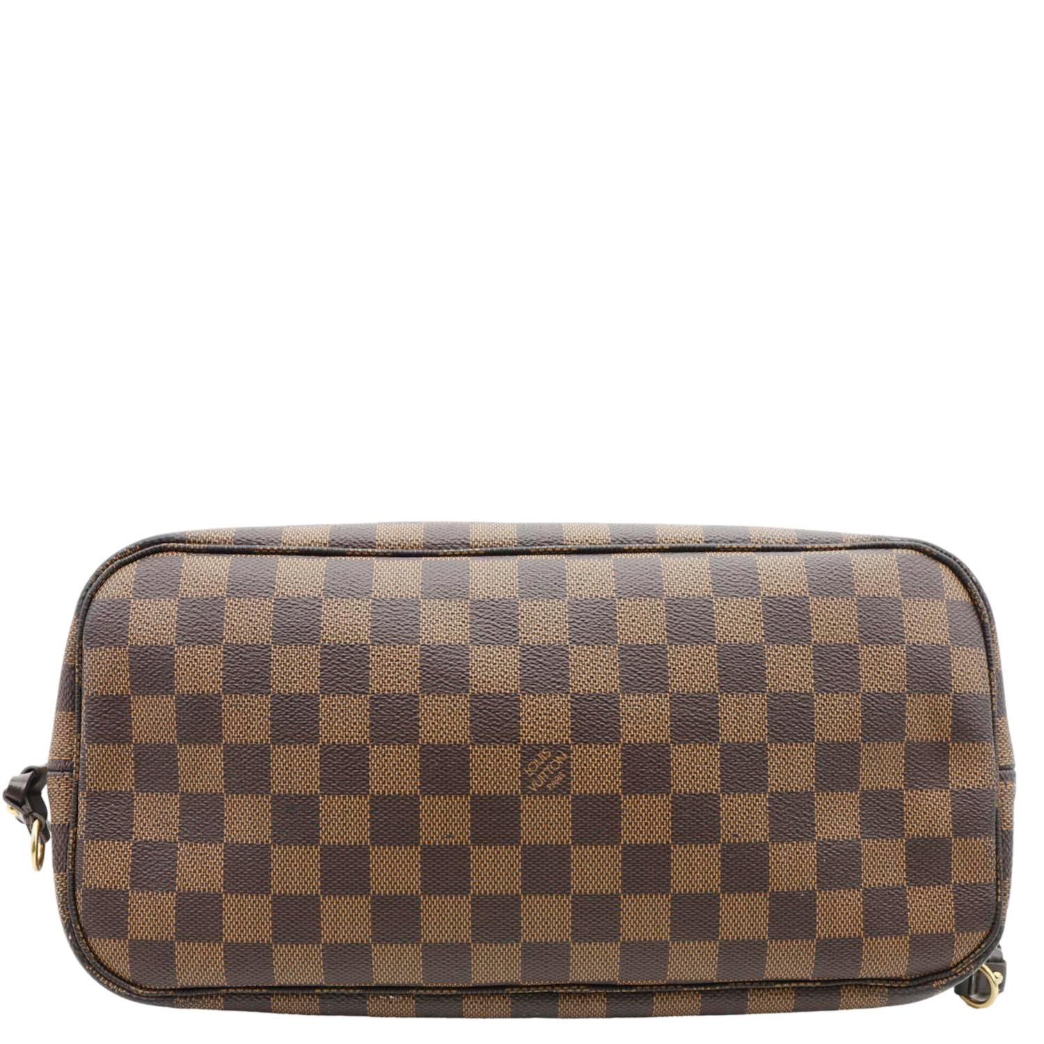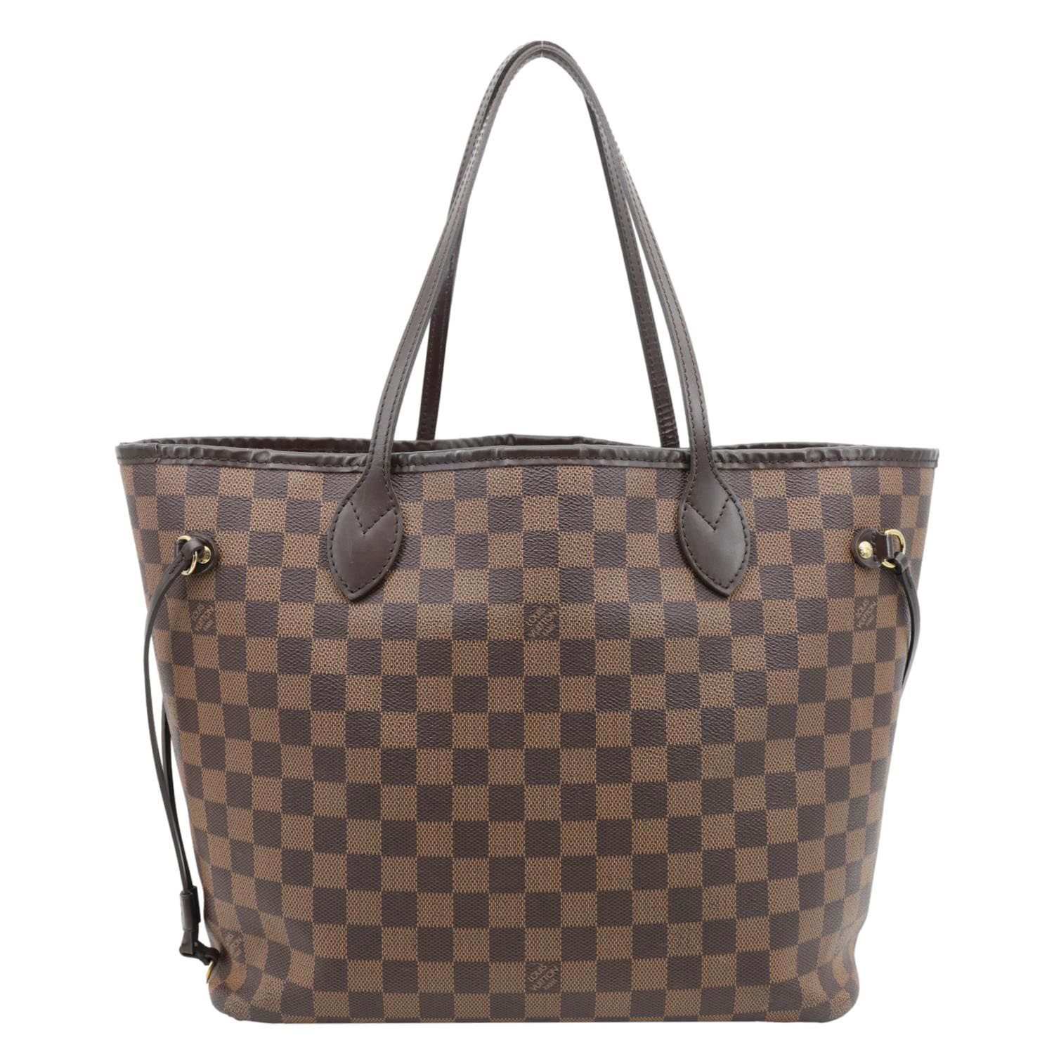 LOUIS VUITTON Neverfull MM Damier Ebene Tote Bag in Brown features the signature checkered canvas with leather trim. Spacious, stylish, and perfect for everyday versatility.