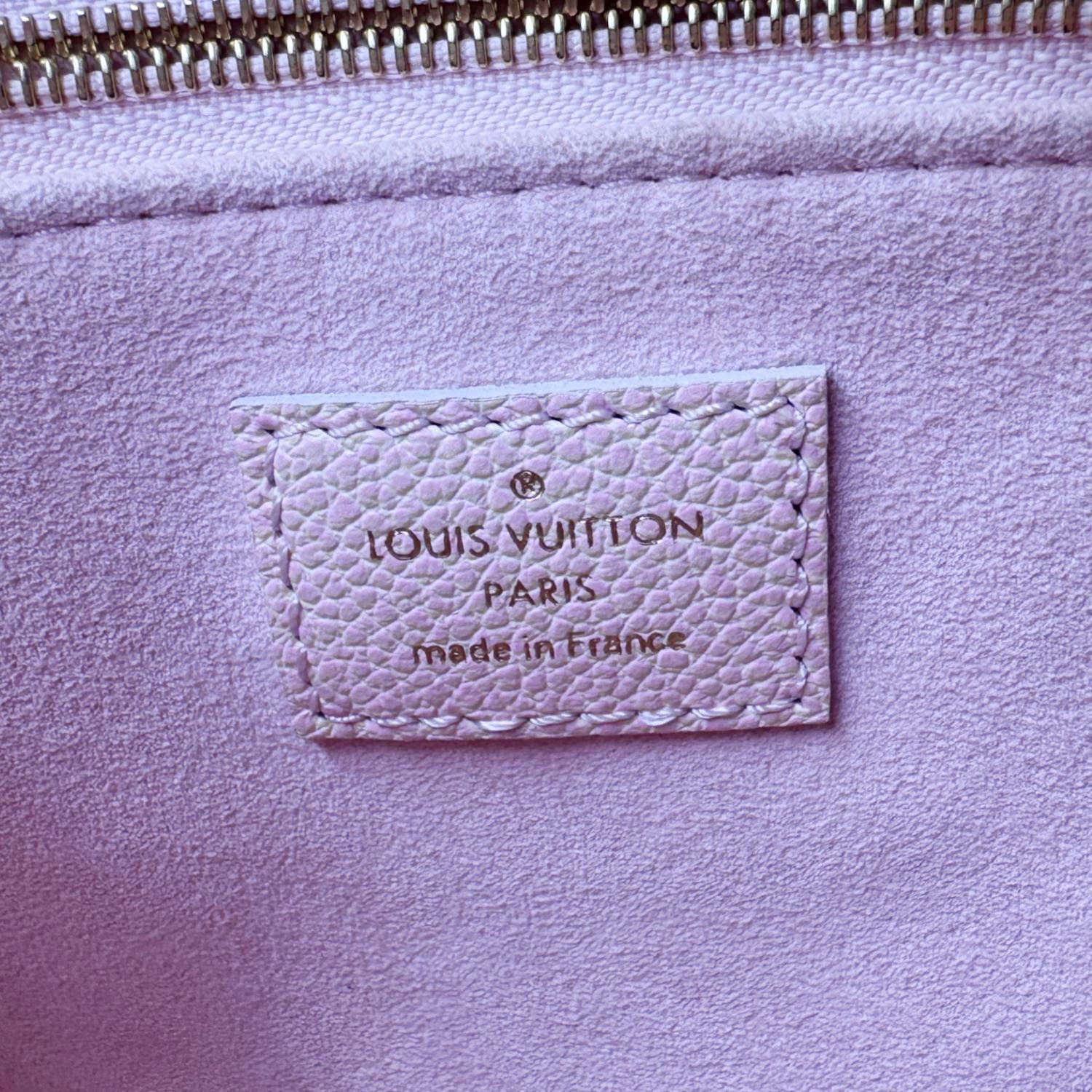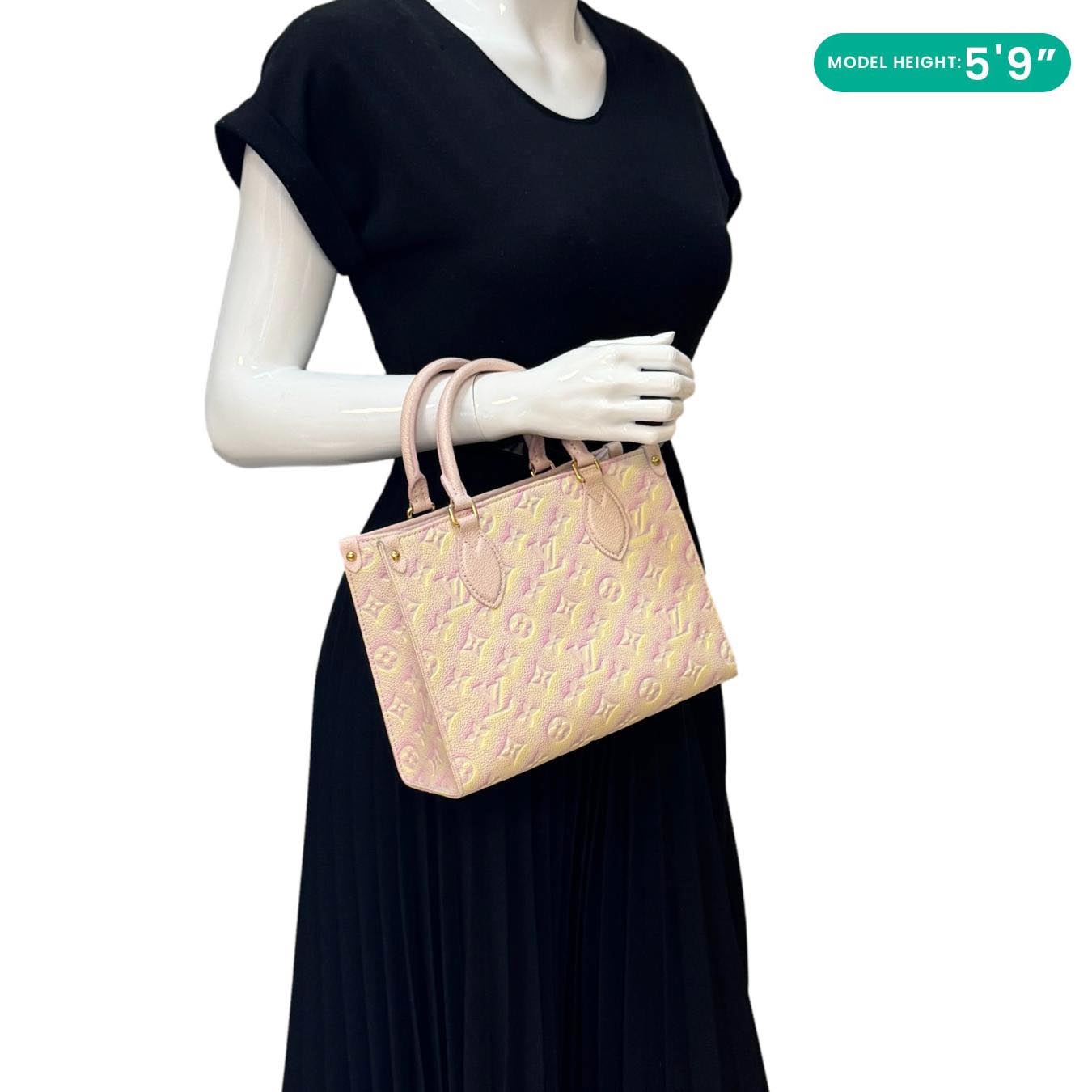 The LOUIS VUITTON Stardust Onthego PM in Light Pink Monogram Empreinte Leather features a shimmering iridescent finish with embossed signature motifs. Compact yet bold, it offers structured elegance.