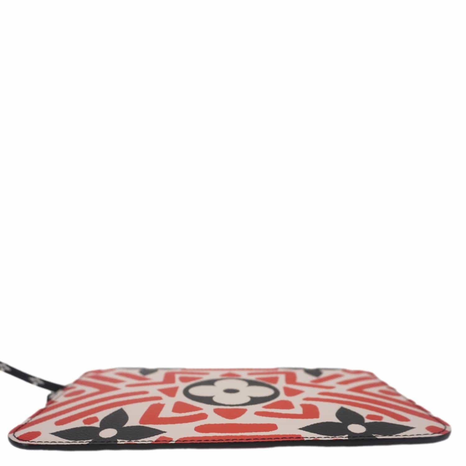 The Louis Vuitton Neverfull Crafty Wristlet Pouch in Giant Monogram Canvas features a bold red and cream graphic design. Sleek and versatile, it’s perfect for carrying essentials with effortless style.