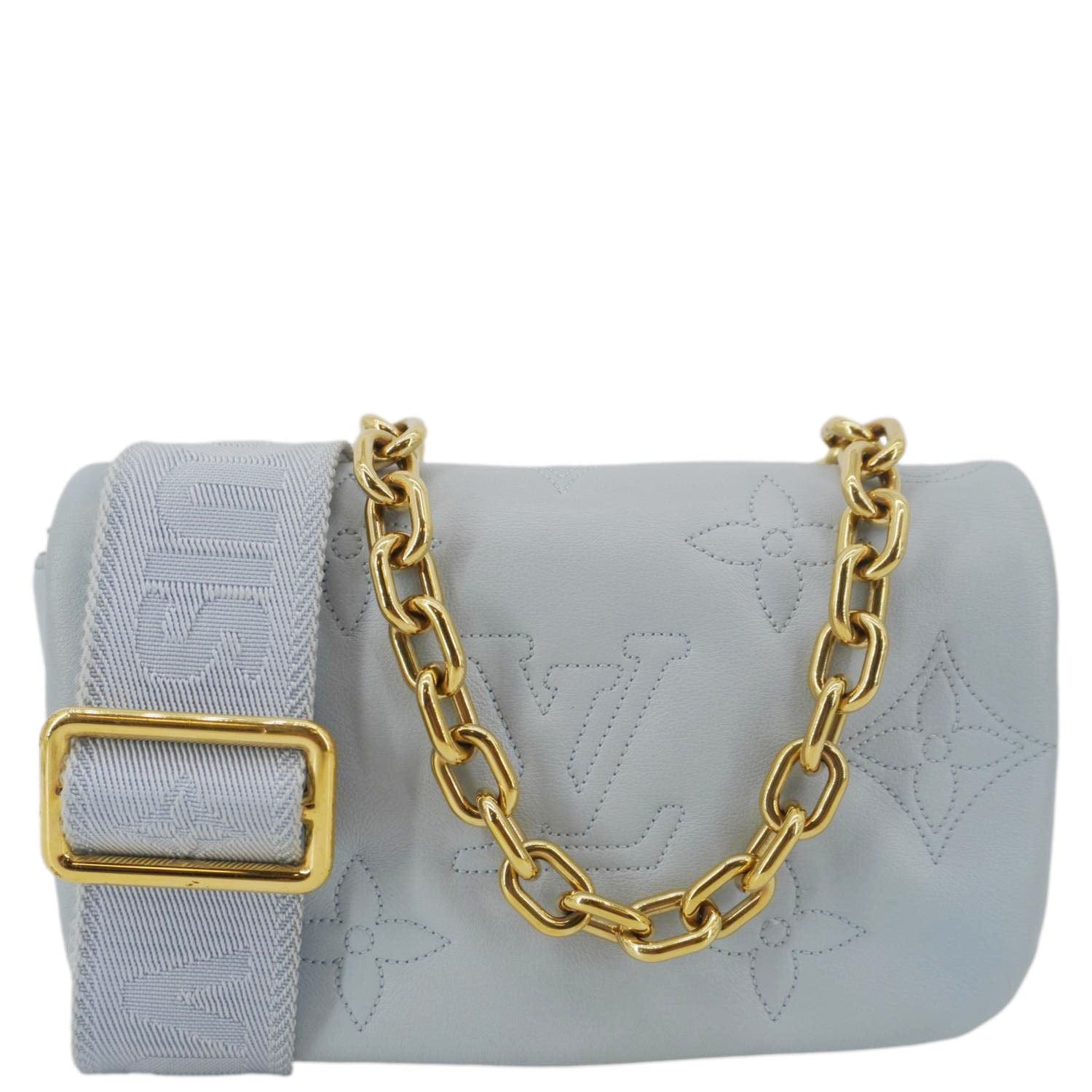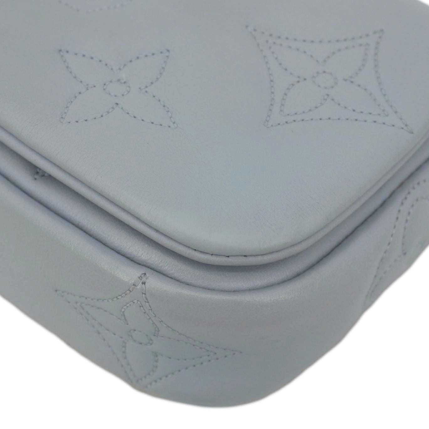 The LOUIS VUITTON Bubblegram Wallet on Strap in light blue calfskin features a puffy, quilted Monogram design with a sporty-meets-chic vibe. Compact yet functional, it can be worn crossbody for hands-free elegance.