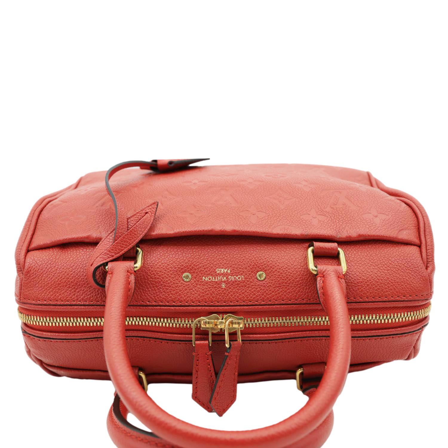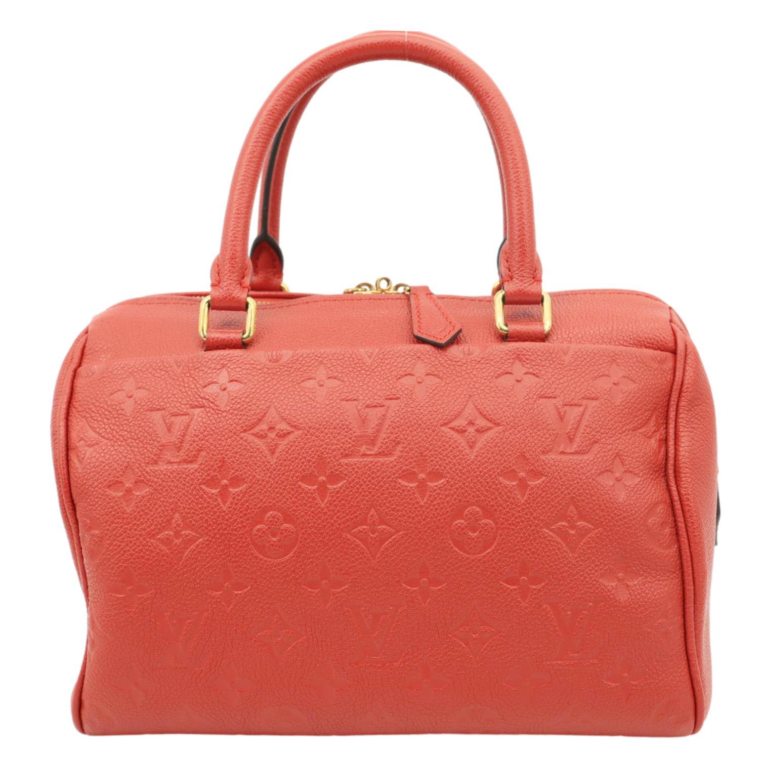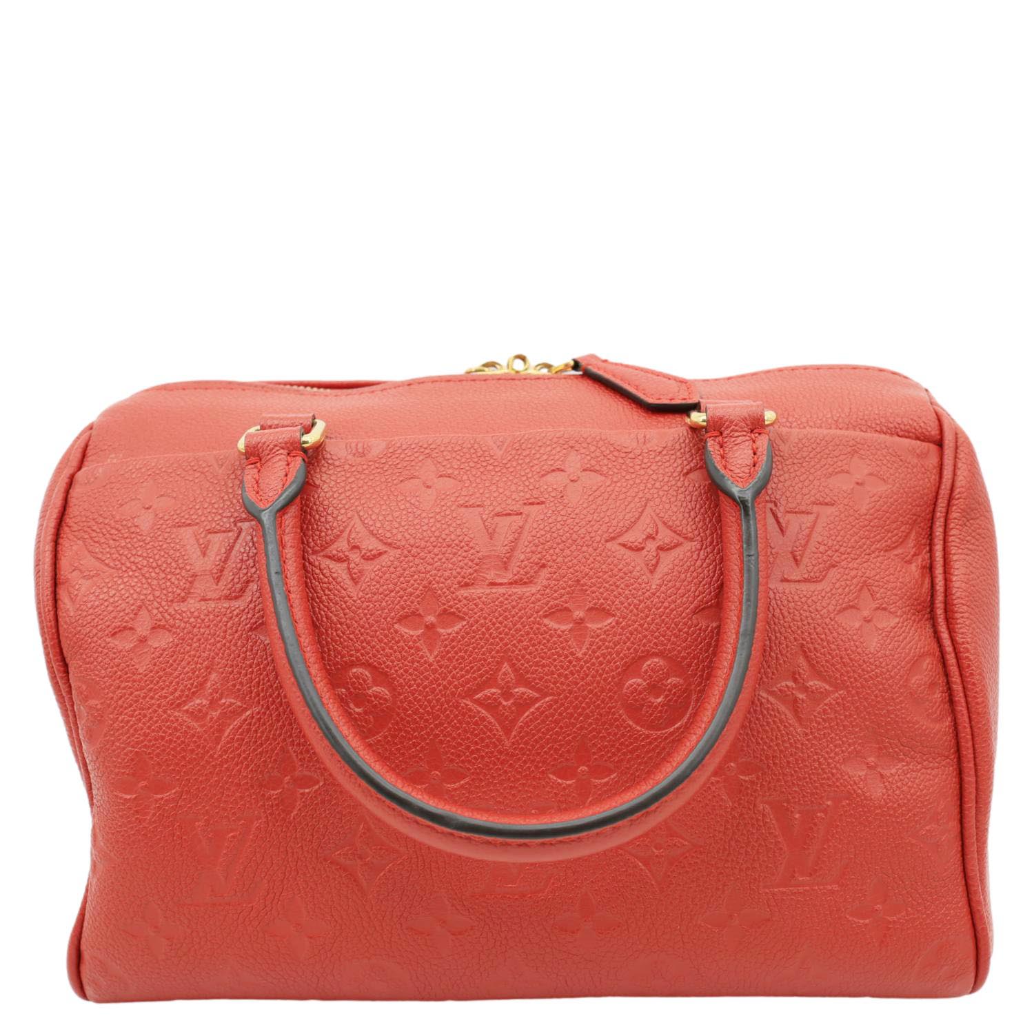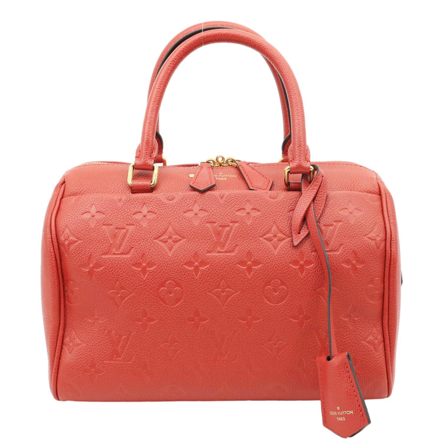 LOUIS VUITTON Speedy Bandoulière 25 crossbody bag in red Monogram Empreinte leather with embossed LV pattern and refined hardware. Features a versatile silhouette with an adjustable strap for comfortable hands-free wear. Compact yet functional, perfect for everyday elegance with a vibrant pop of color.