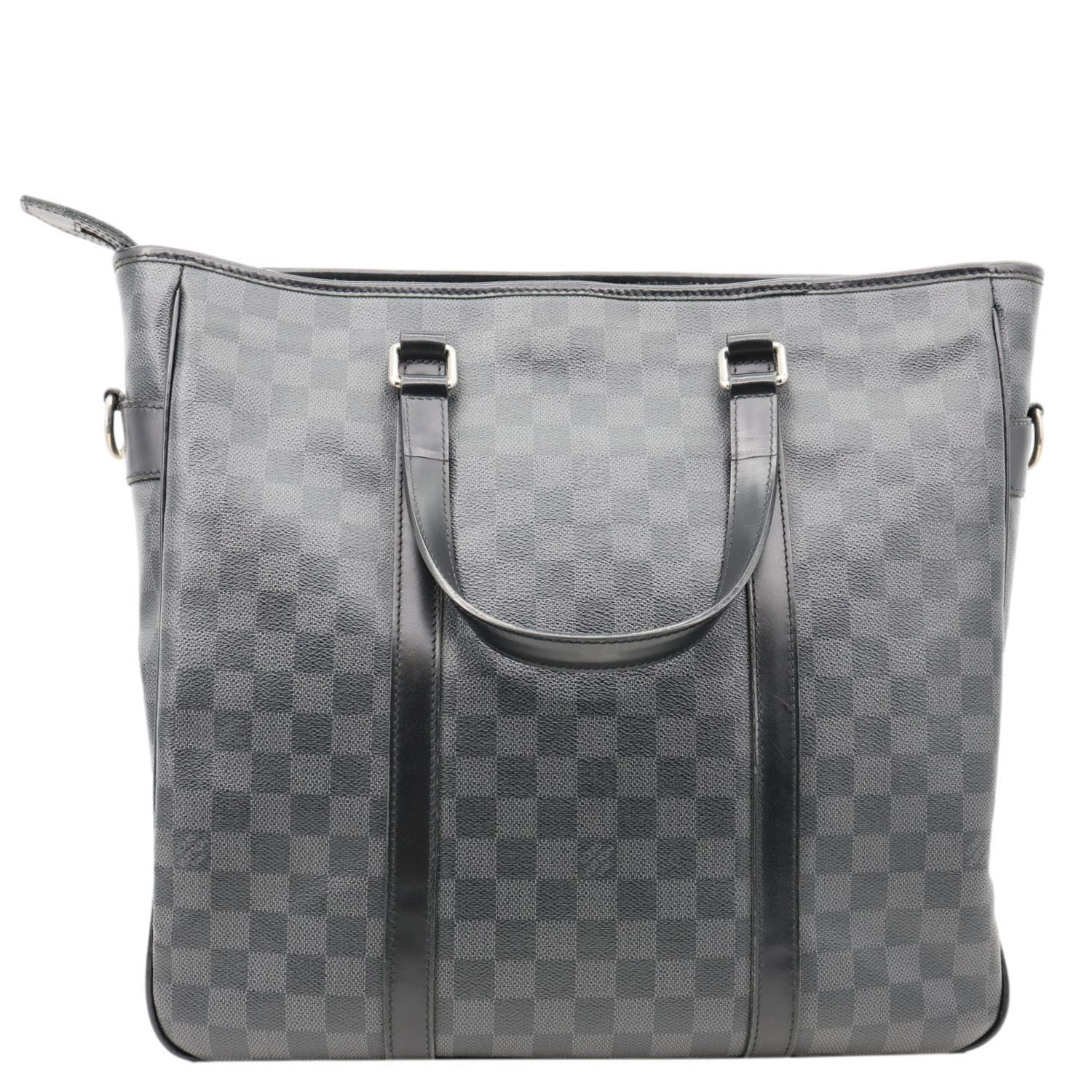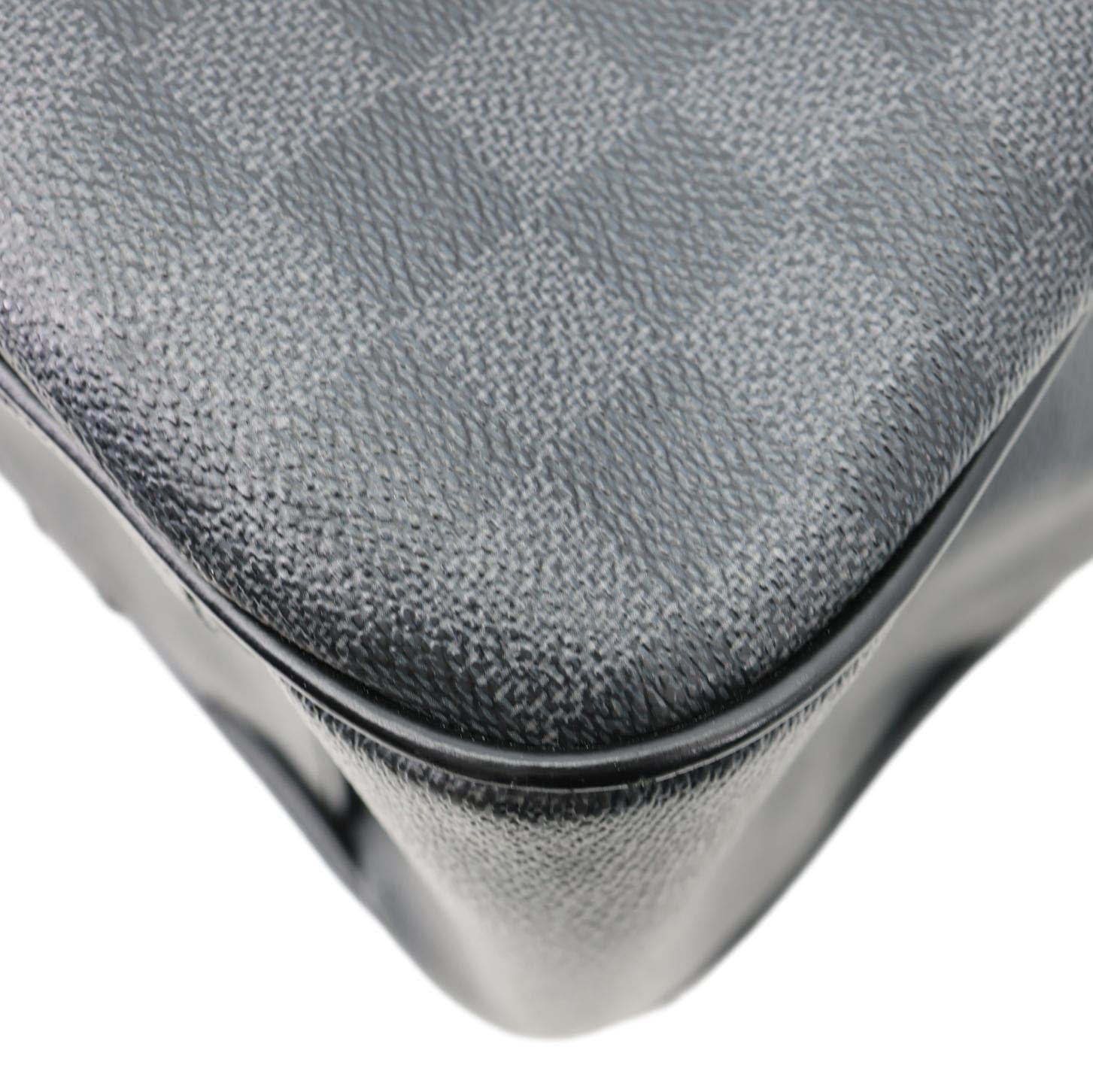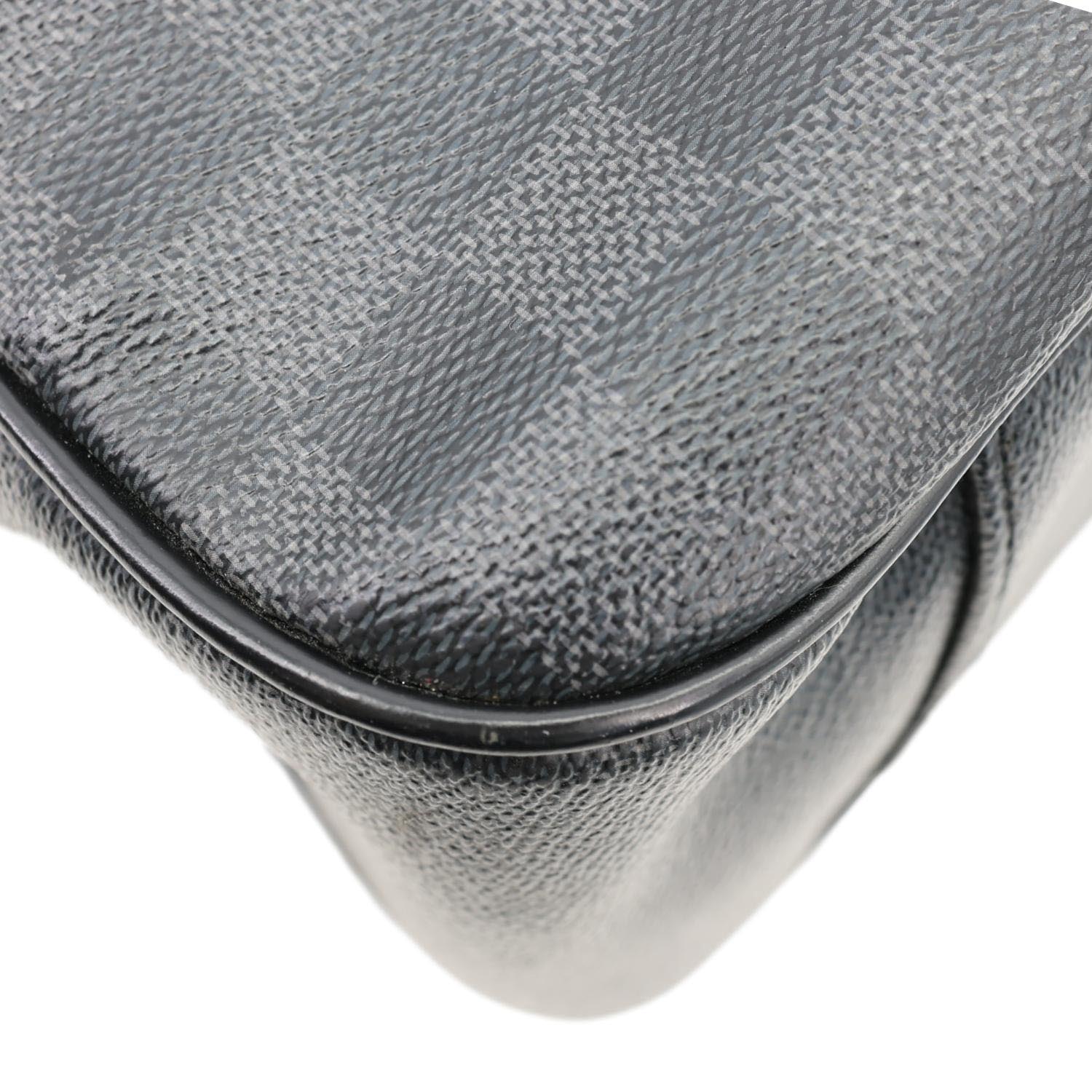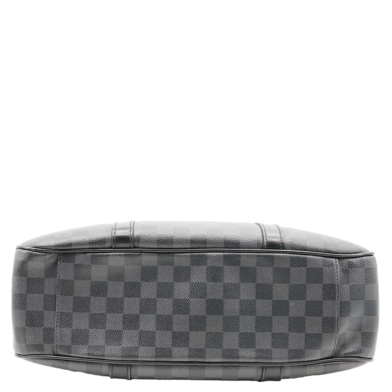 LOUIS VUITTON Tadao Damier Graphite Shoulder Bag Black features Damier Graphite canvas with black leather trim and silver-tone hardware. Sleek and functional, it offers a spacious interior ideal for everyday or work use.
