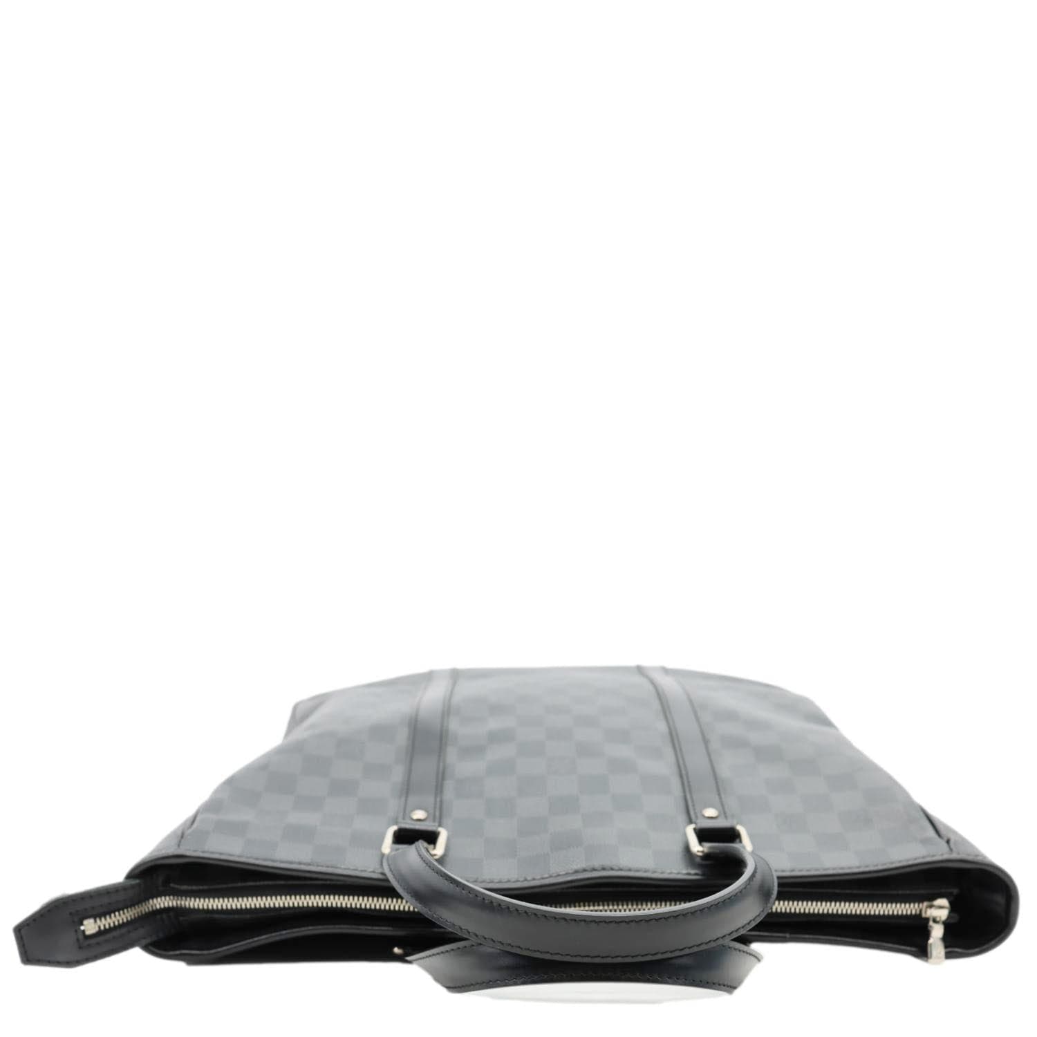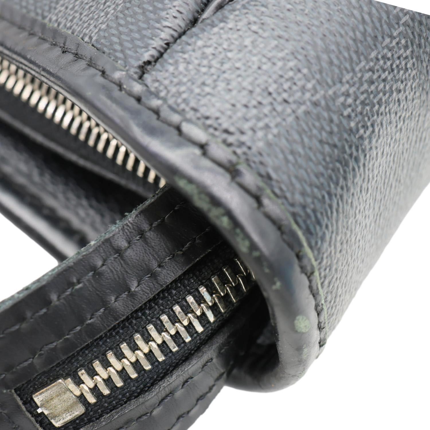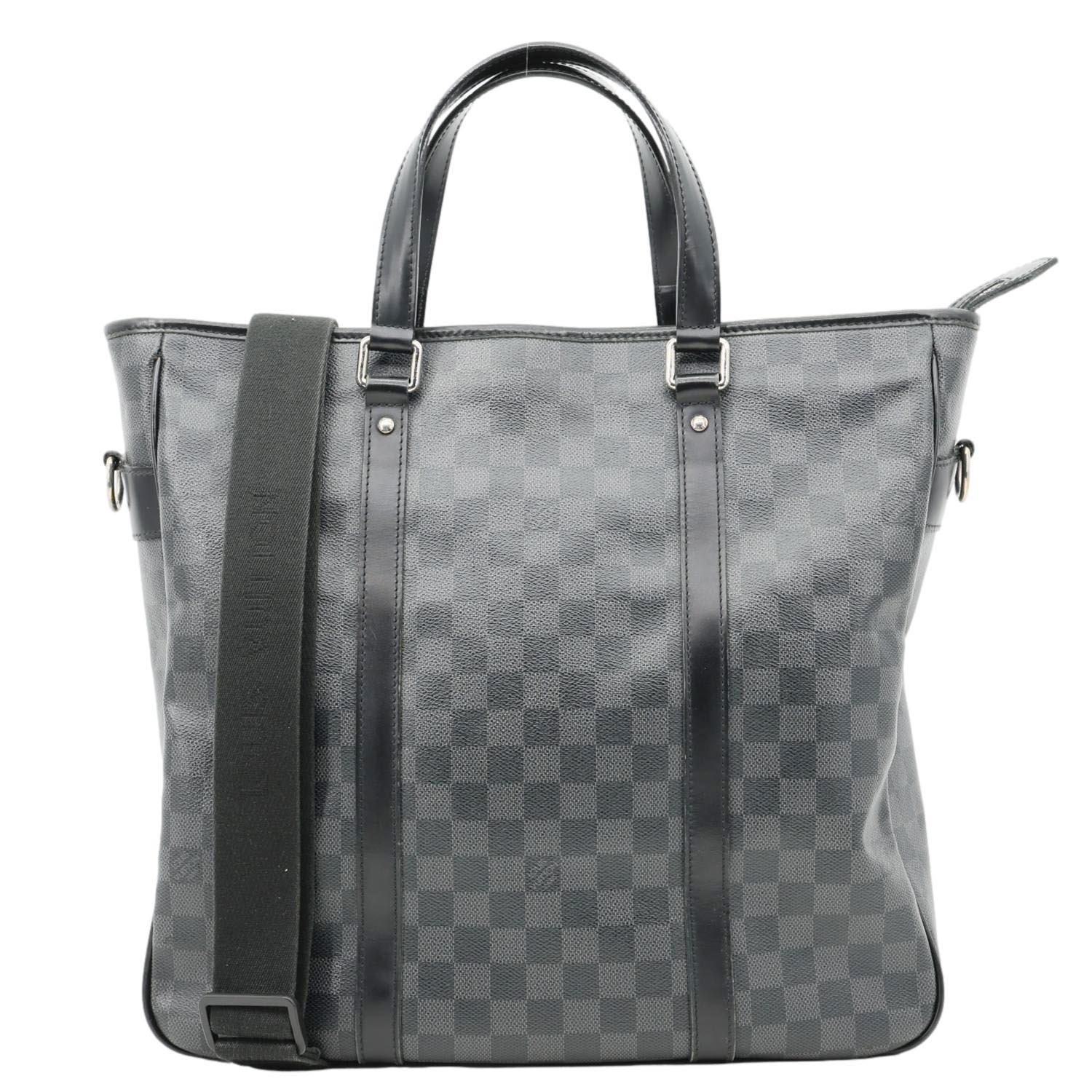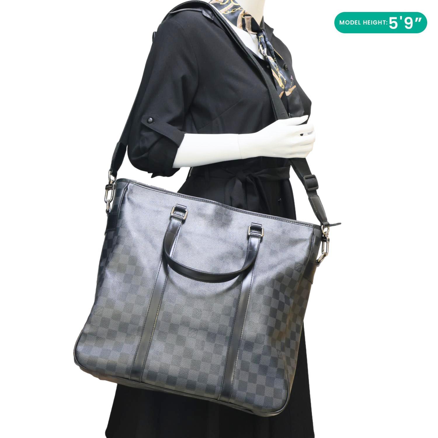 LOUIS VUITTON Tadao Damier Graphite Shoulder Bag Black features Damier Graphite canvas with black leather trim and silver-tone hardware. Sleek and functional, it offers a spacious interior ideal for everyday or work use.