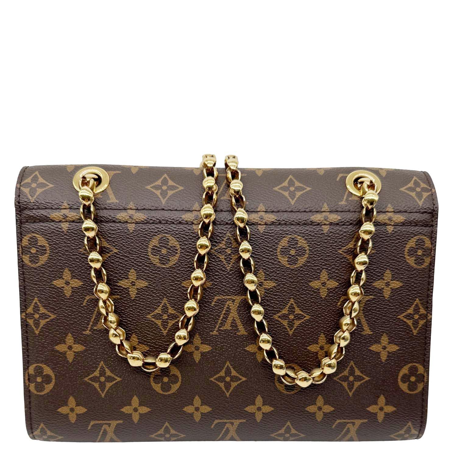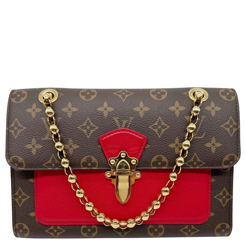 LOUIS VUITTON Victoire Monogram Canvas Crossbody Bag Cerise features iconic monogram canvas with a bold cerise leather trim and sleek flap design. Finished with a gold-tone chain strap, it offers a chic blend of classic style and modern elegance.
