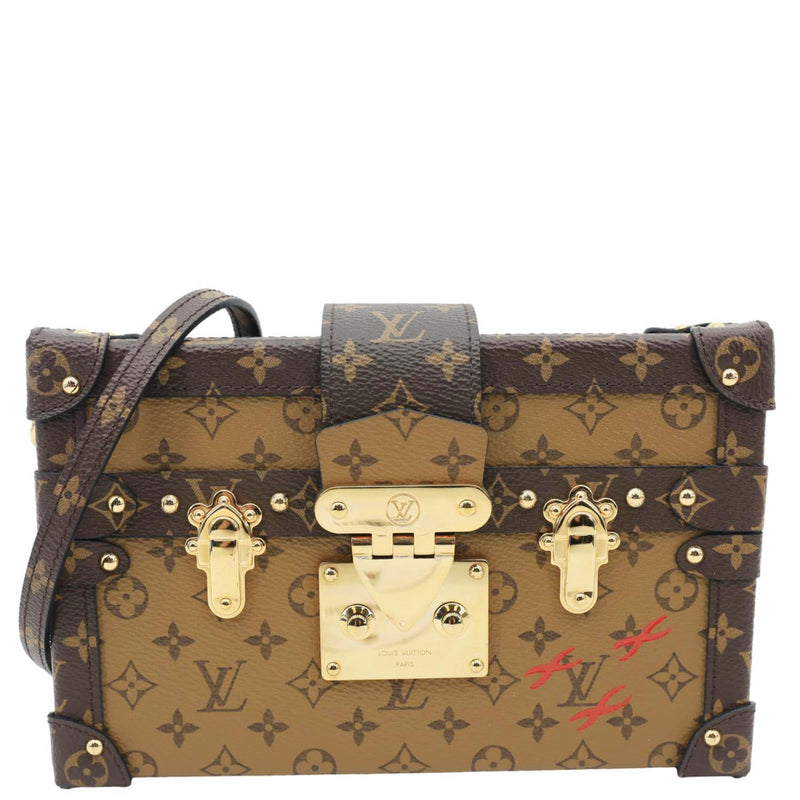 LOUIS VUITTON Petite Malle shoulder bag in brown Reverse Monogram canvas with iconic trunk-inspired design and gold-tone hardware. Elegant and compact, perfect for day-to-night looks with timeless luxury flair.