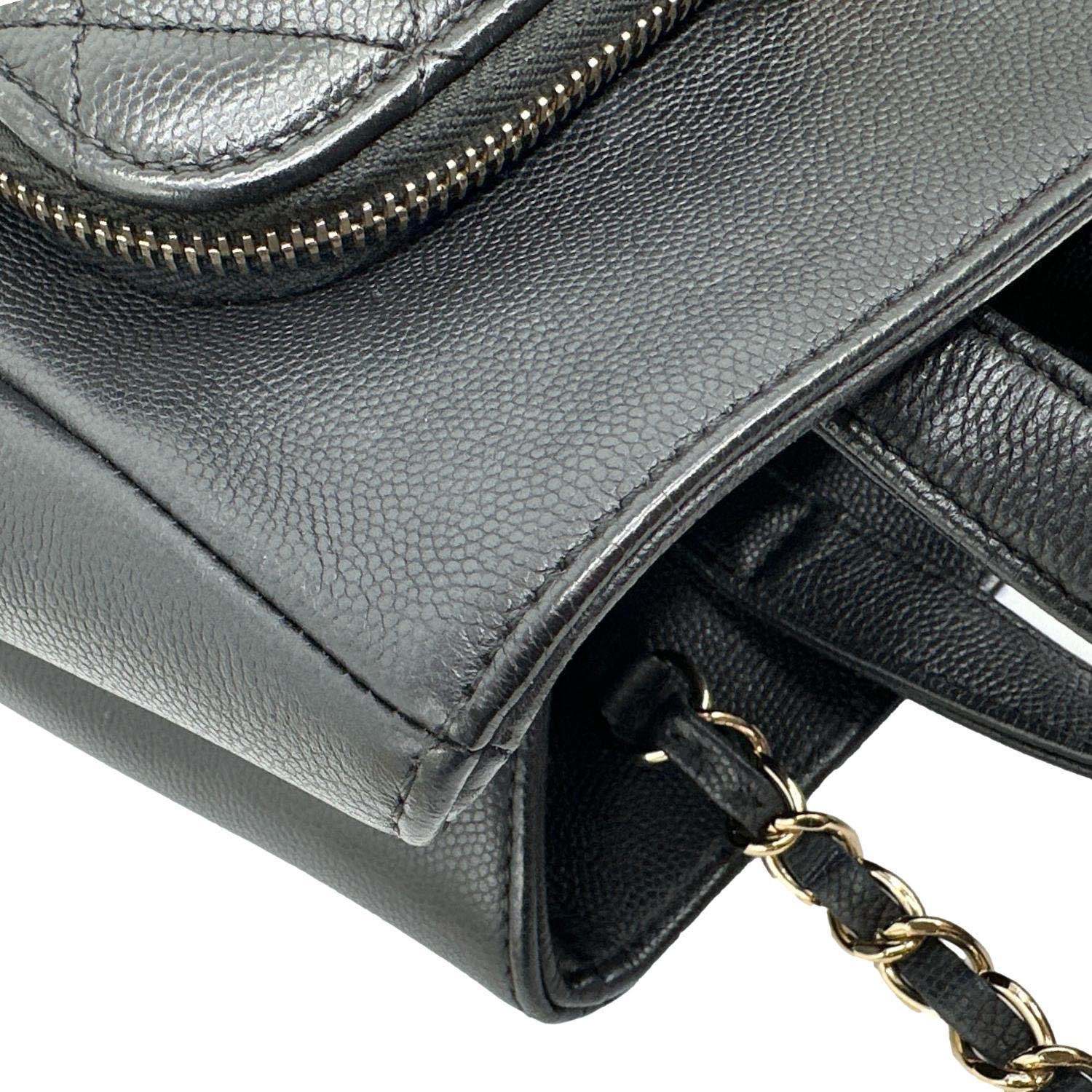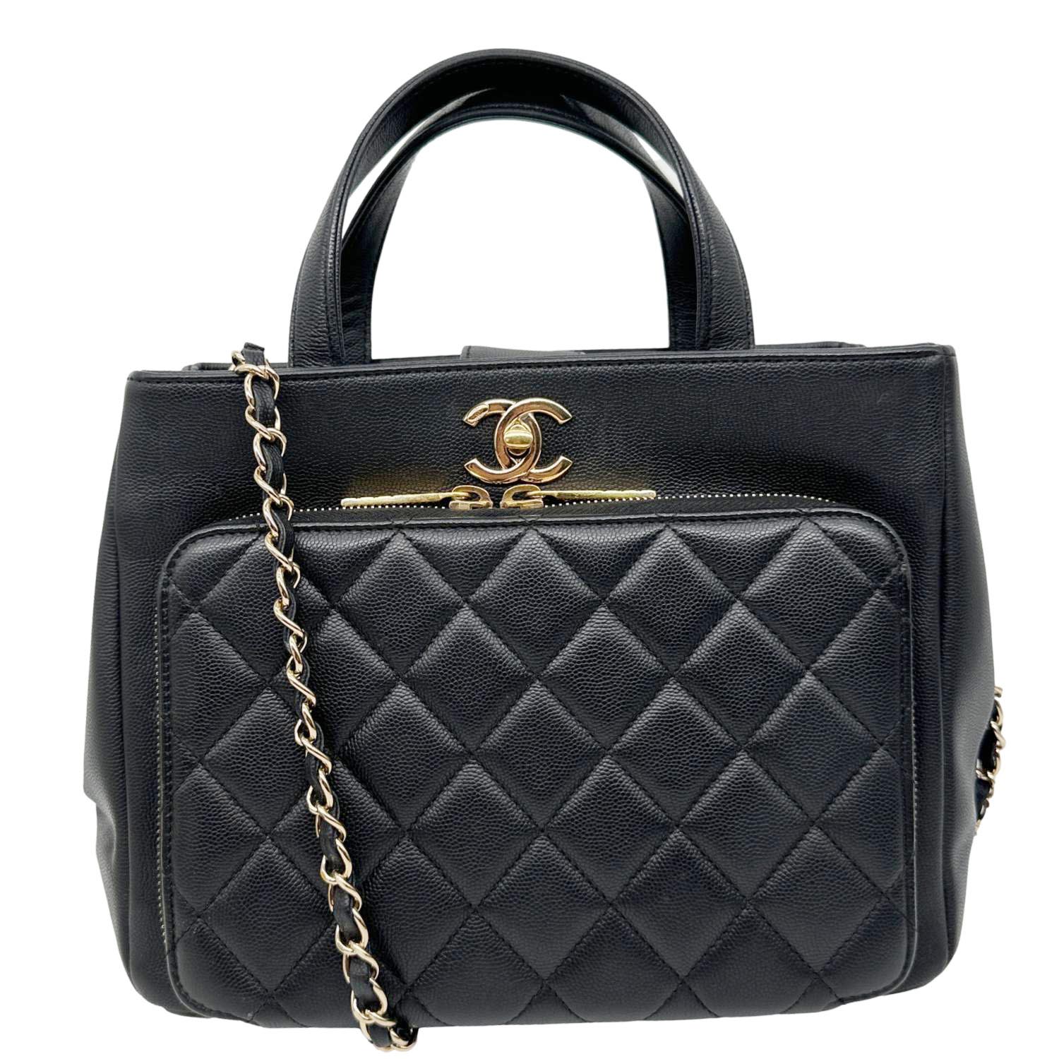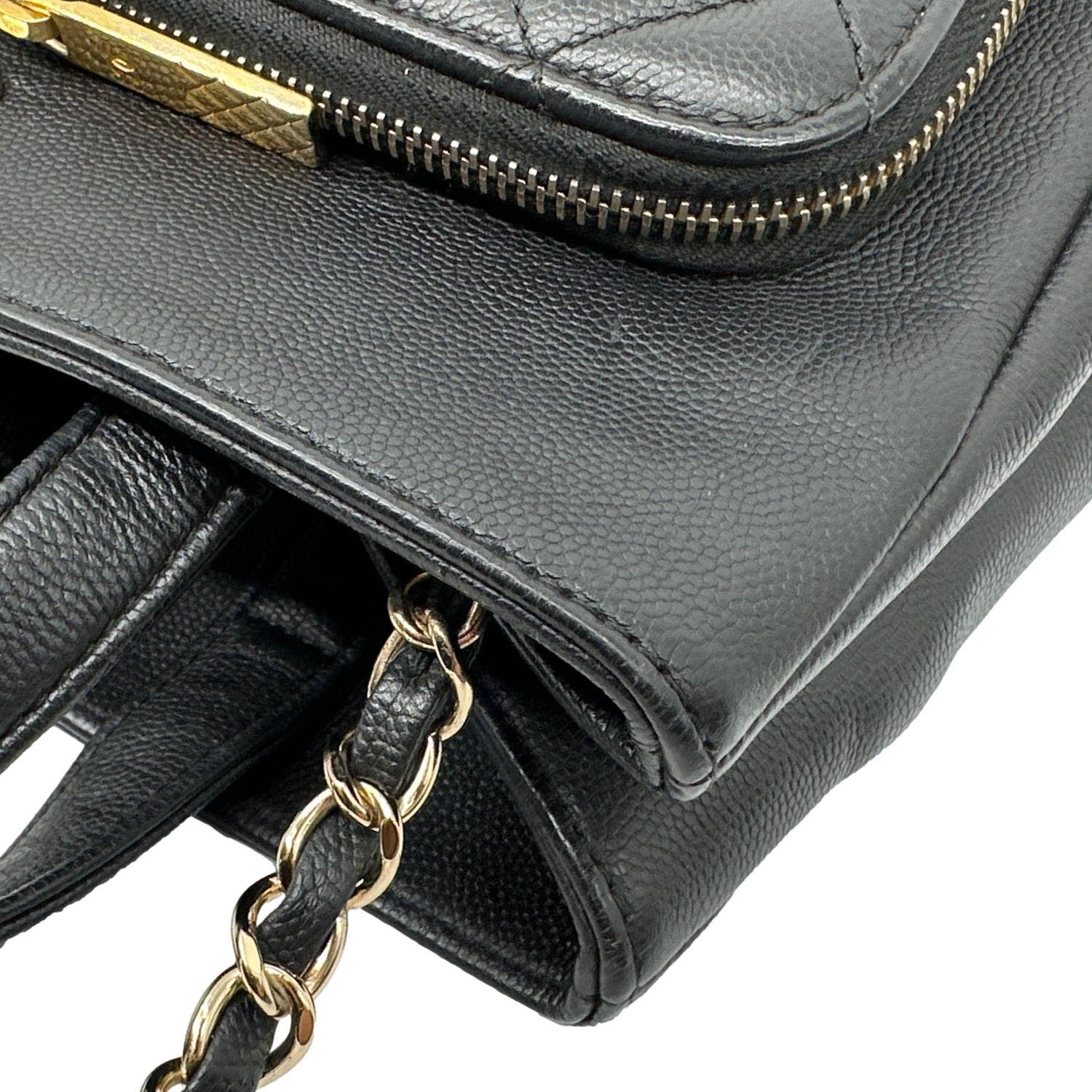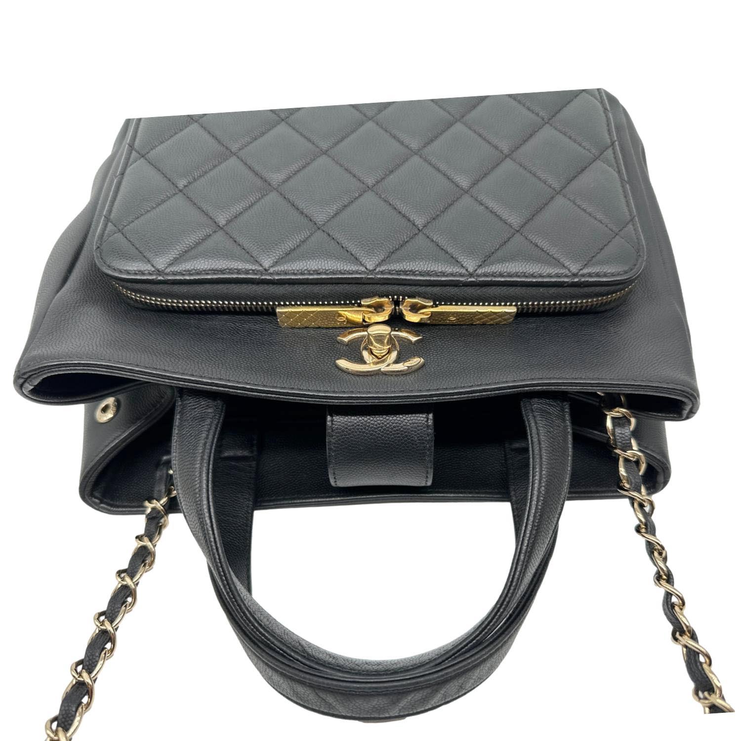 Quilted caviar leather shopping tote with structured silhouette and subtle Chanel branding. Spacious, everyday design ideal for work or stylish errands.