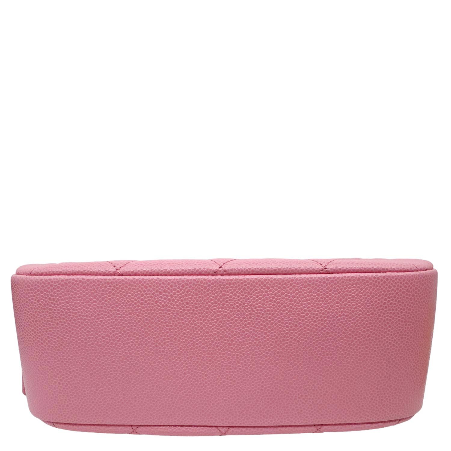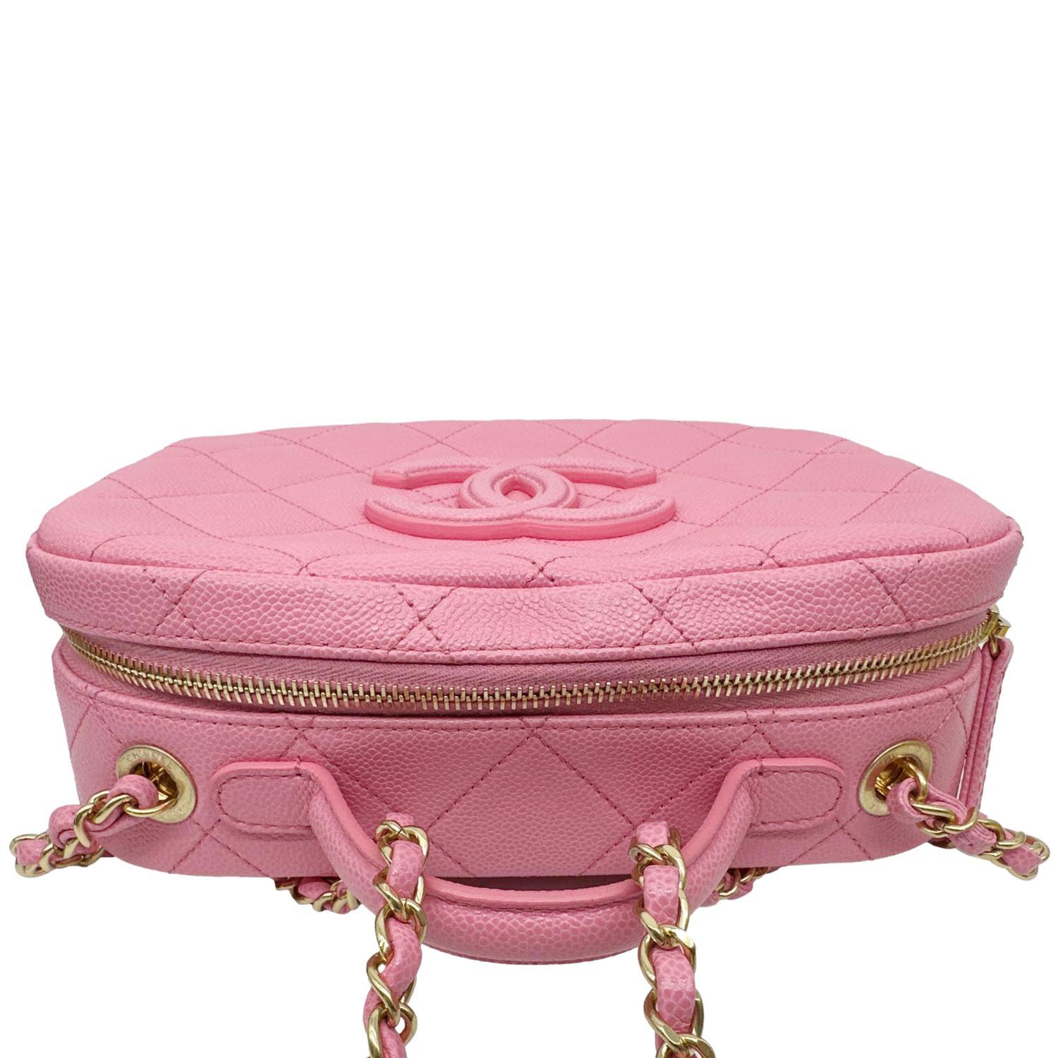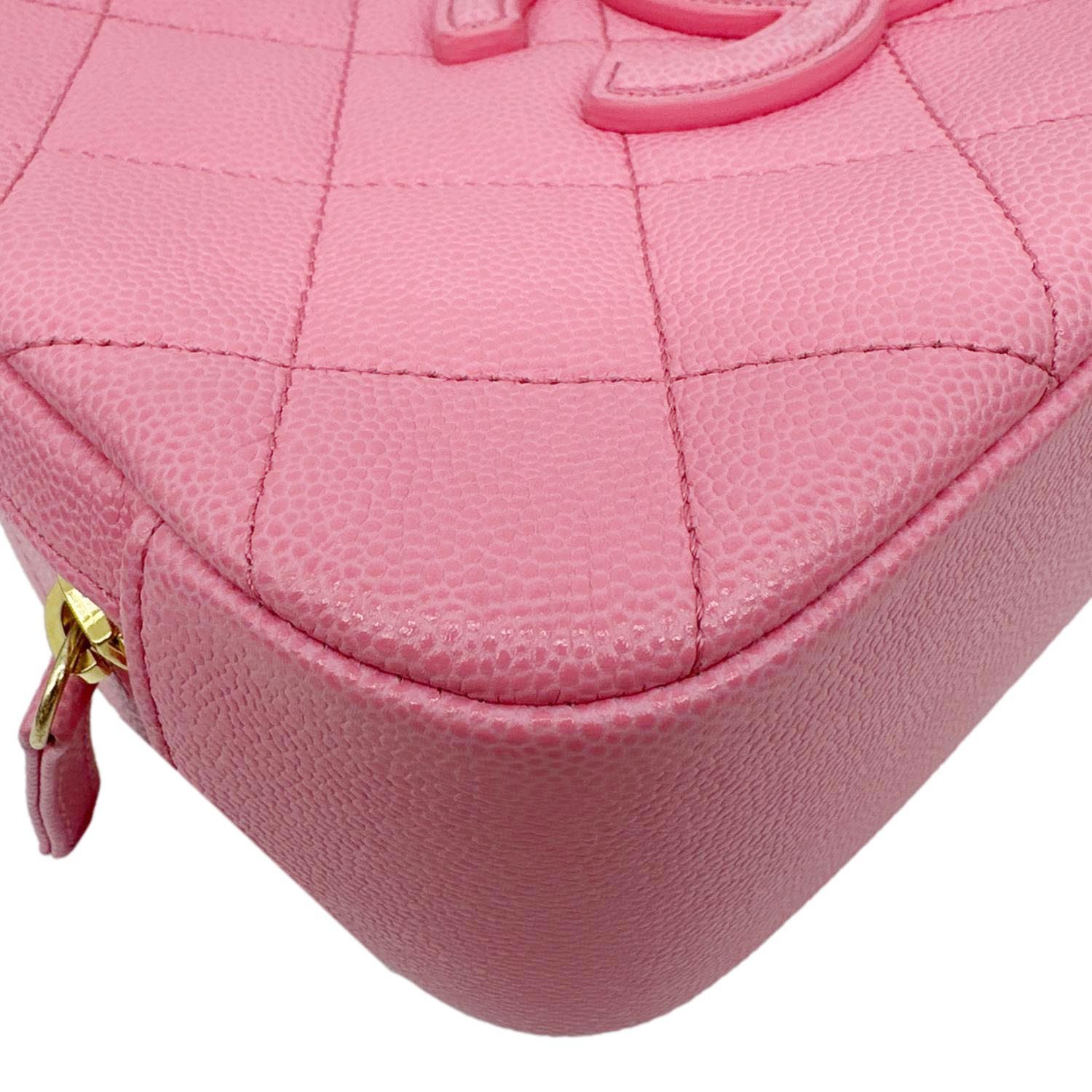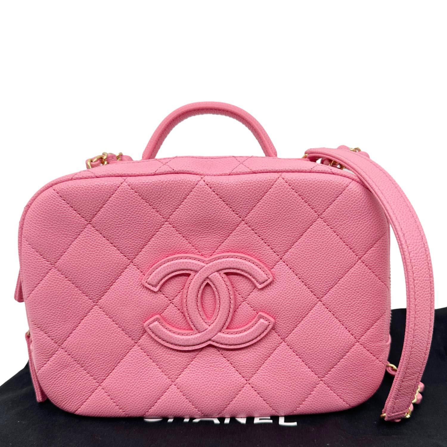 Compact vanity-style silhouette crafted from durable quilted caviar leather in a soft pink tone, finished with the iconic CC logo and elegant chain shoulder strap. Structured design with zip-around closure and organized interior, perfect for carrying essentials while adding a chic statement to any outfit.