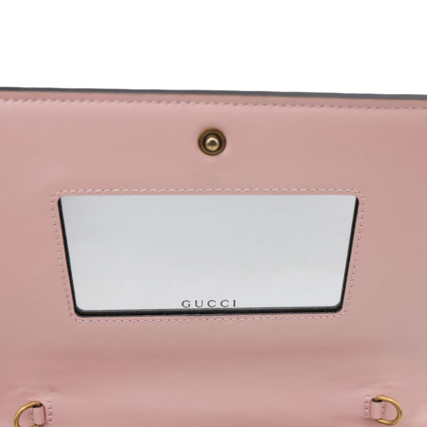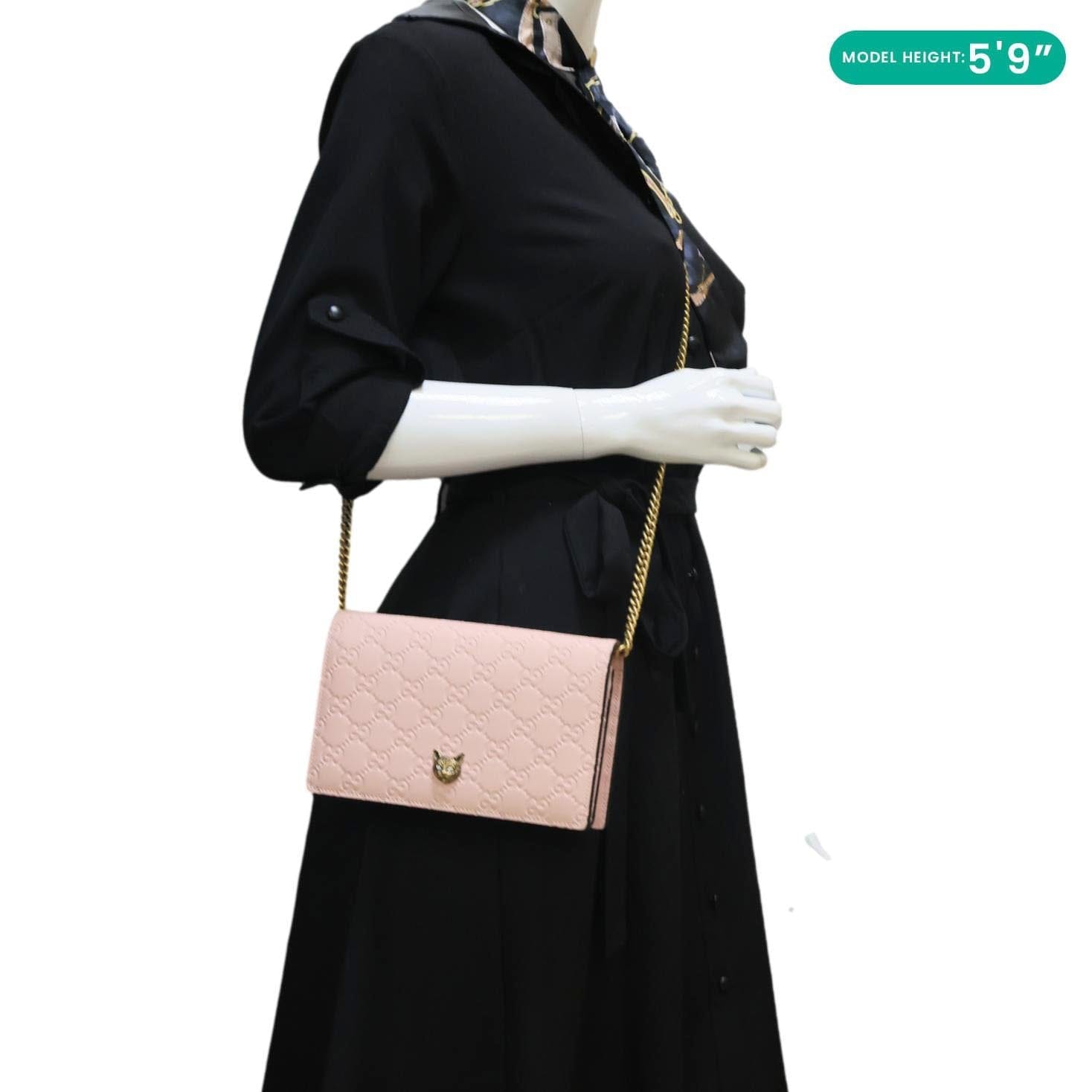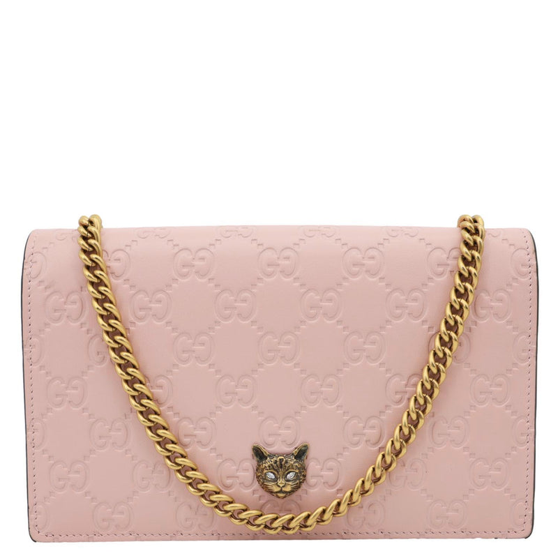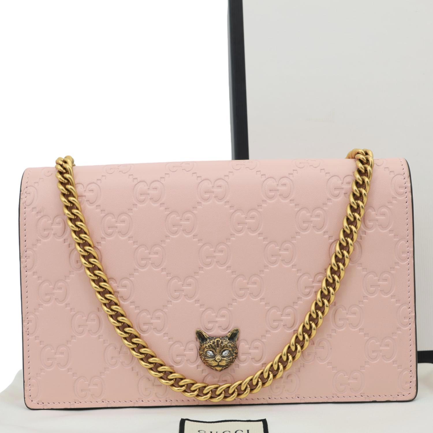 GUCCI Linea Cat Animalier leather chain crossbody bag in pink with playful cat motif and signature GG detailing. Chic and whimsical, perfect for stylish everyday wear with a fun luxury twist.