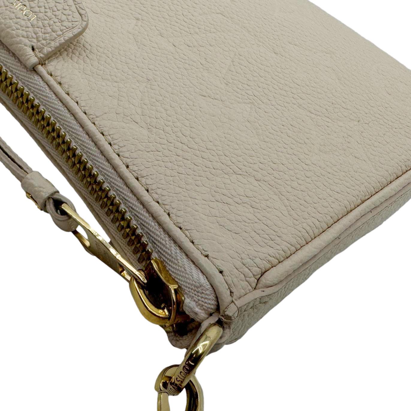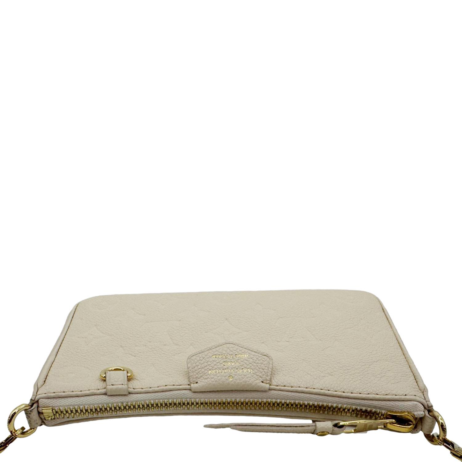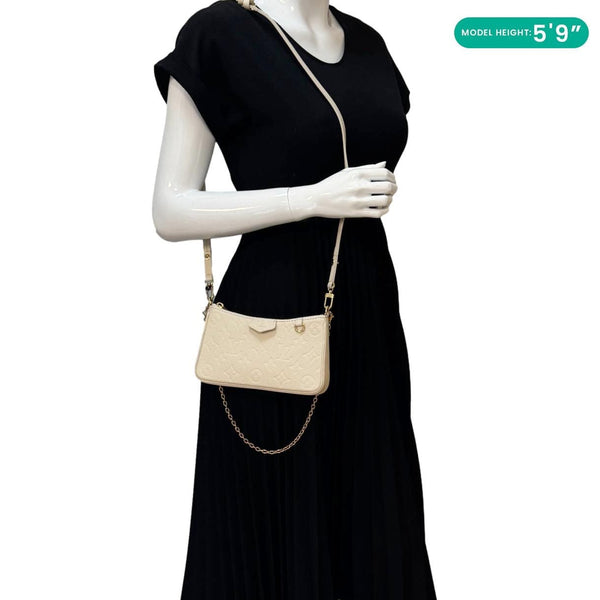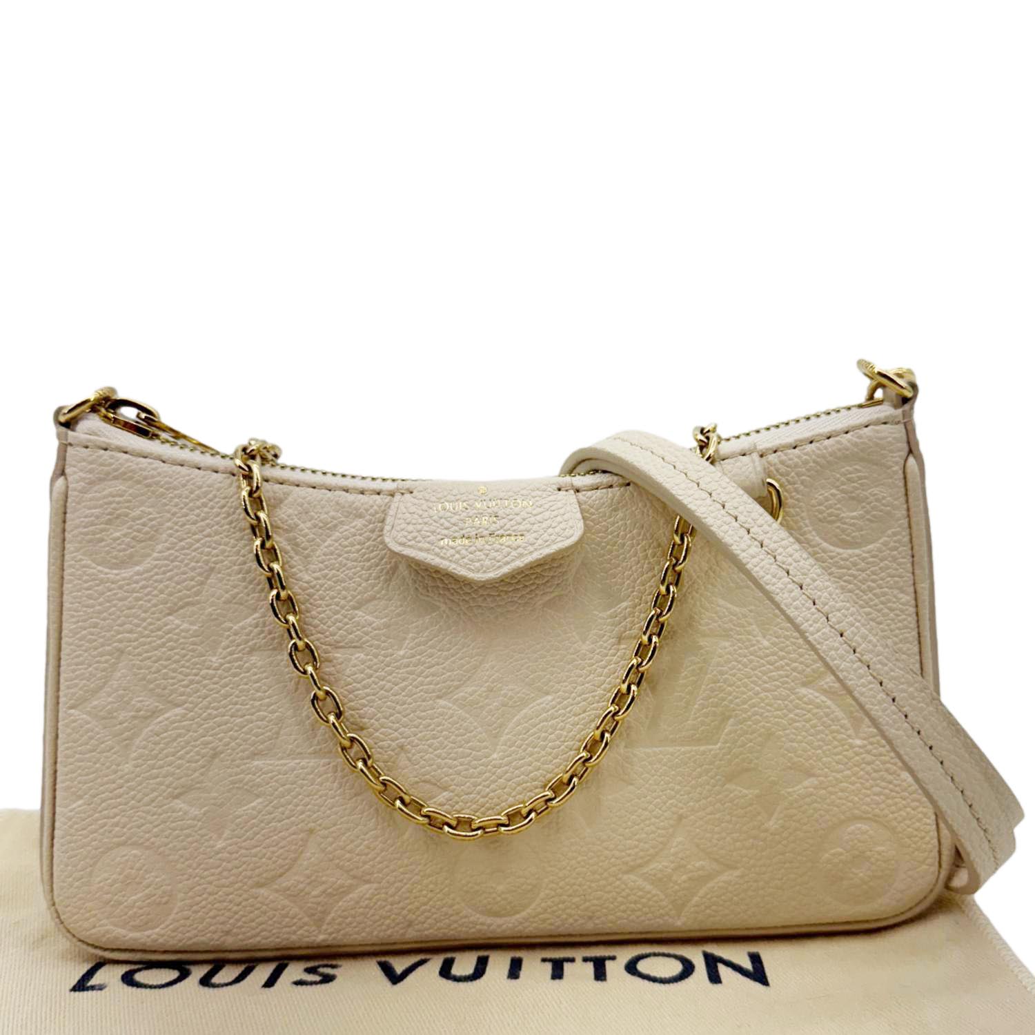 The Louis Vuitton Easy Pouch on Strap is crafted from cream Monogram Empreinte leather with gold-tone hardware and a sleek silhouette. Its detachable strap and chain offer versatile wear as a shoulder bag or clutch.