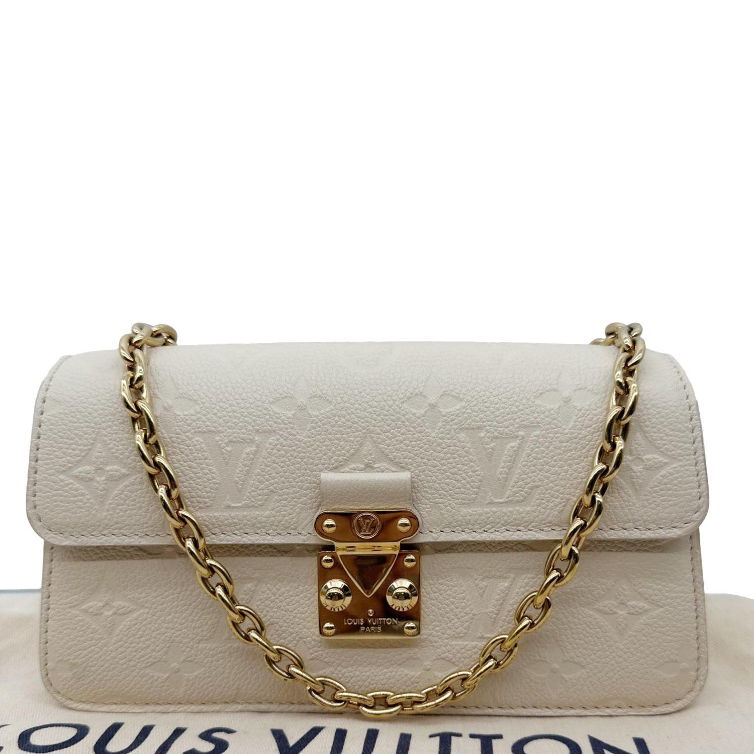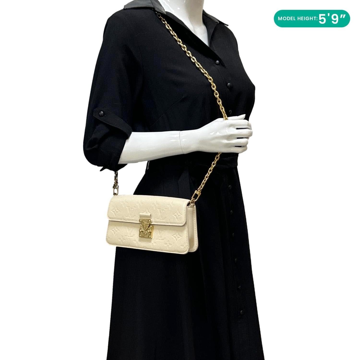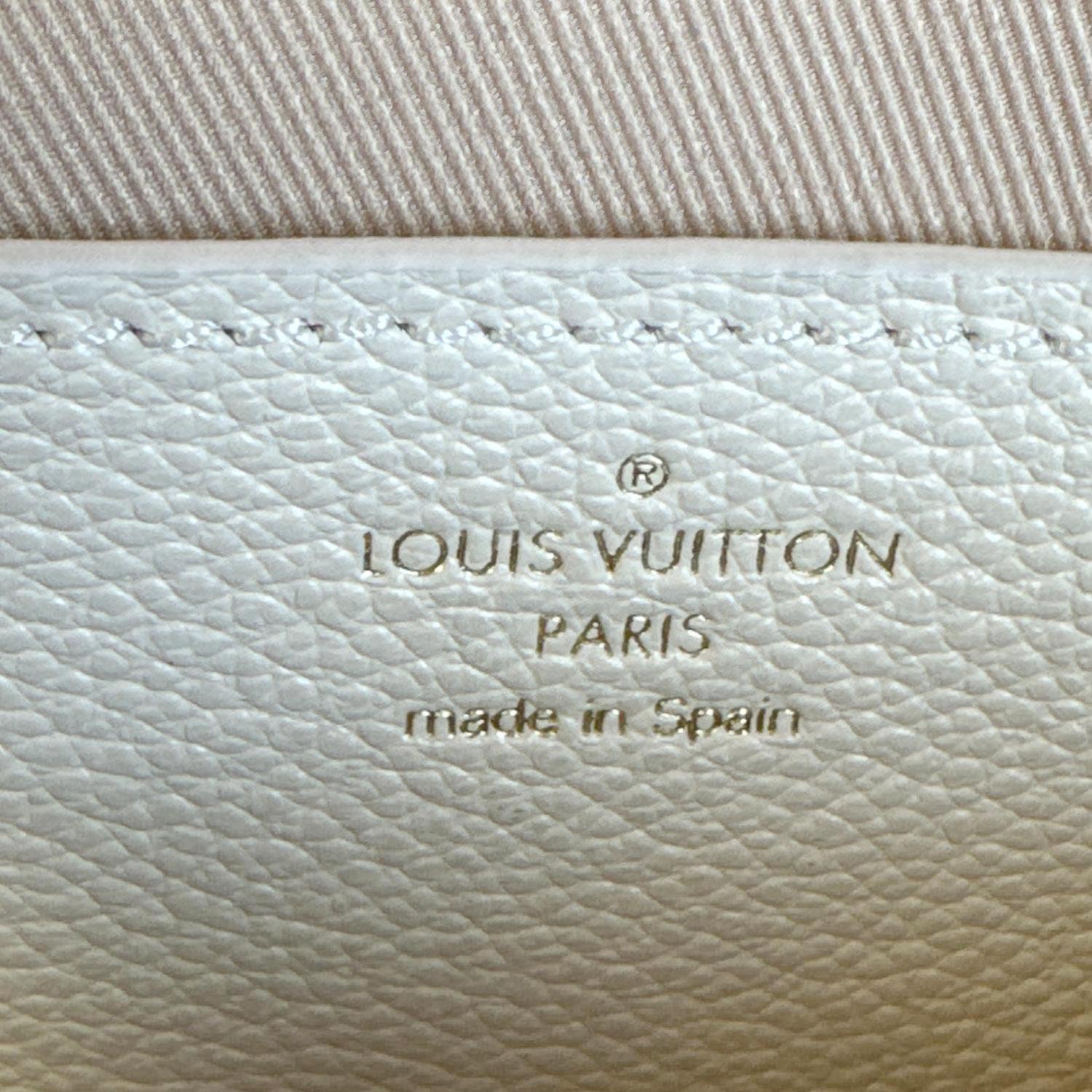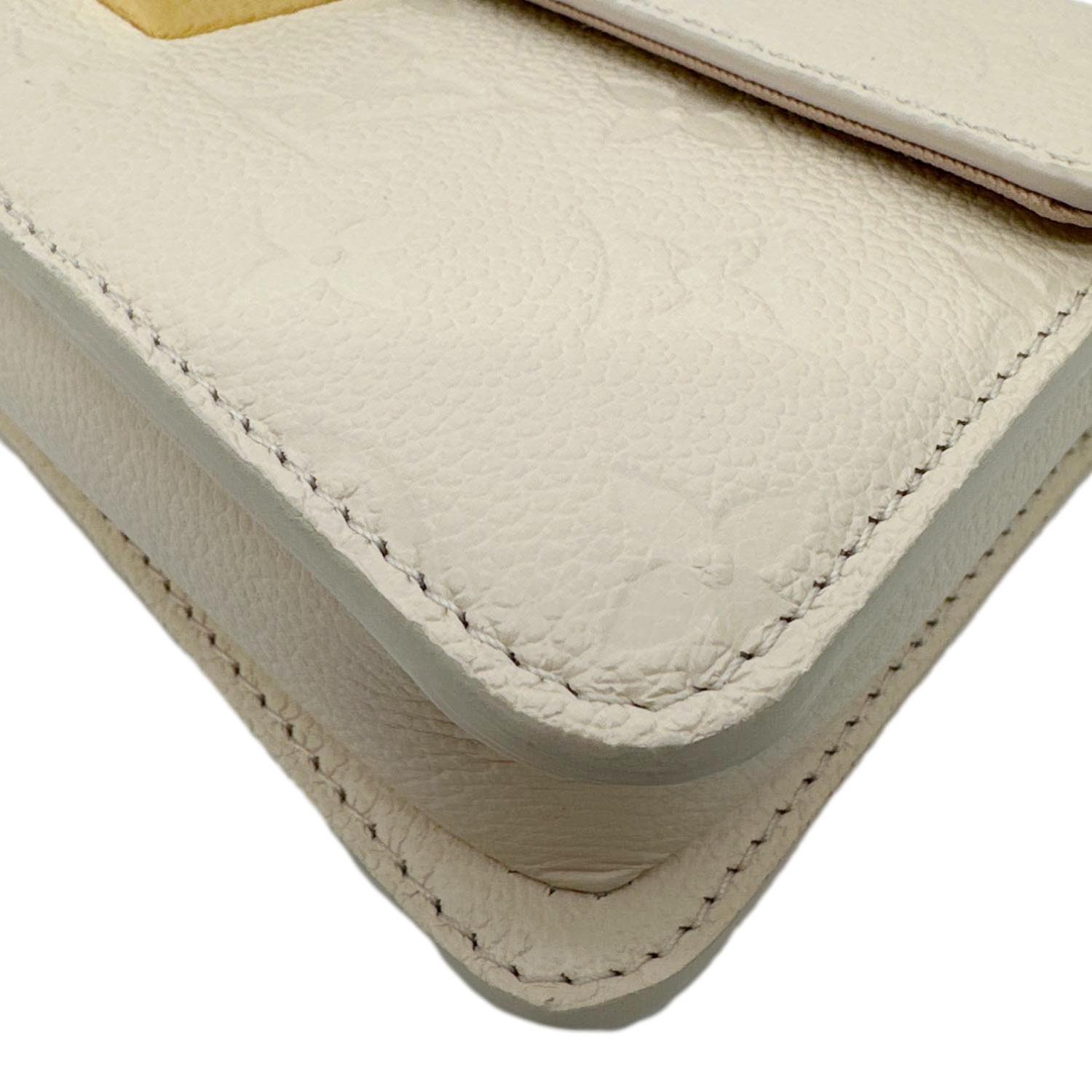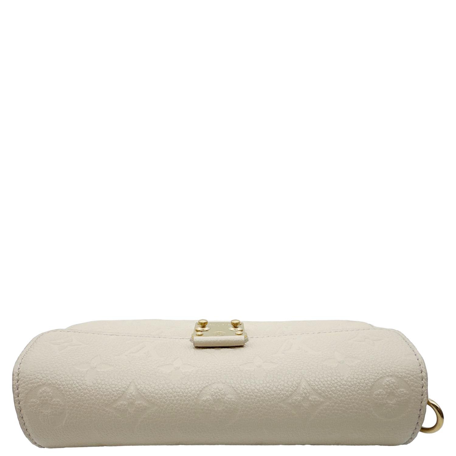 Louis Vuitton Metis Monogram Empreinte Wallet on Chain in cream leather with embossed Monogram texture. Compact wallet silhouette with chain strap, combining practical organization with refined crossbody style. Elegant piece that transitions effortlessly from day to evening looks.