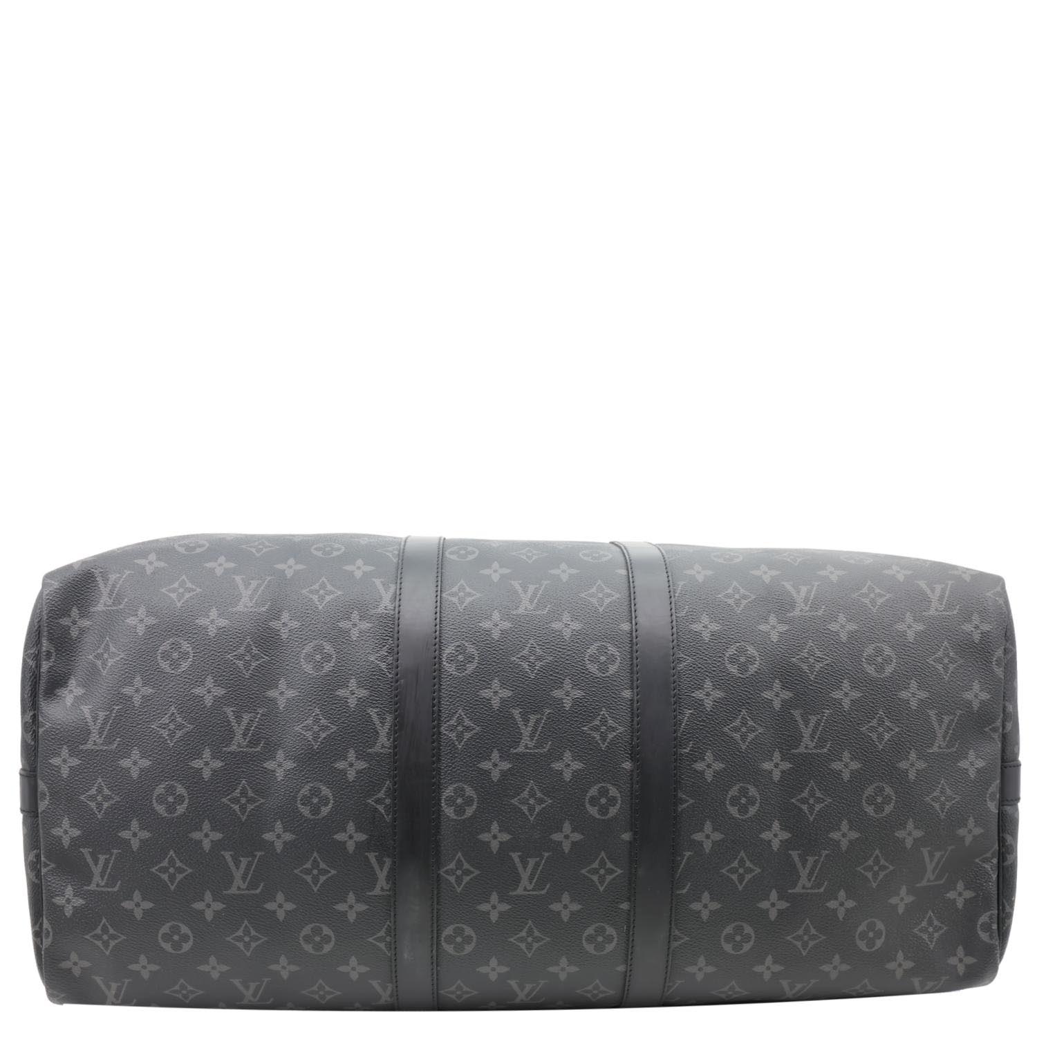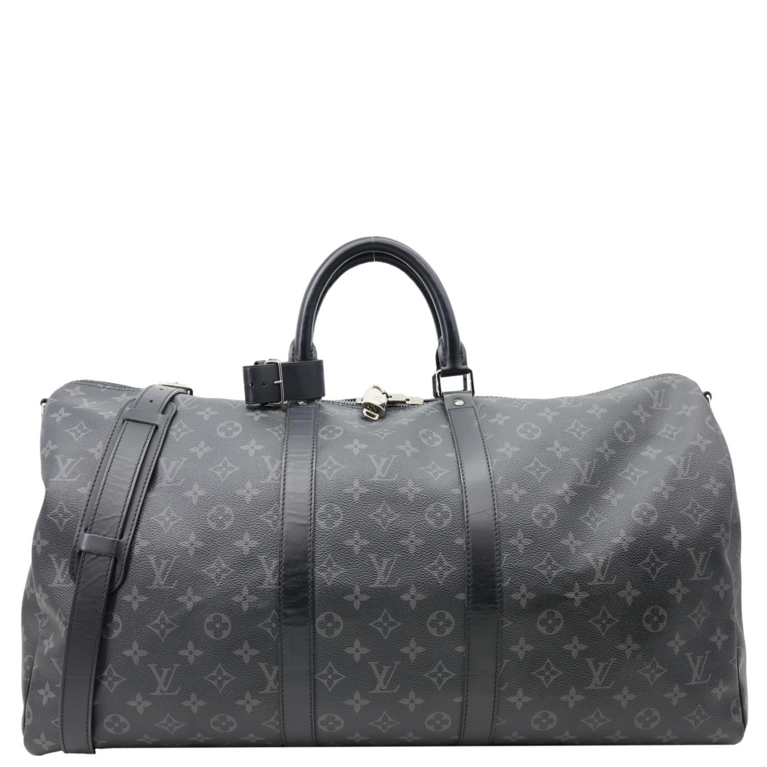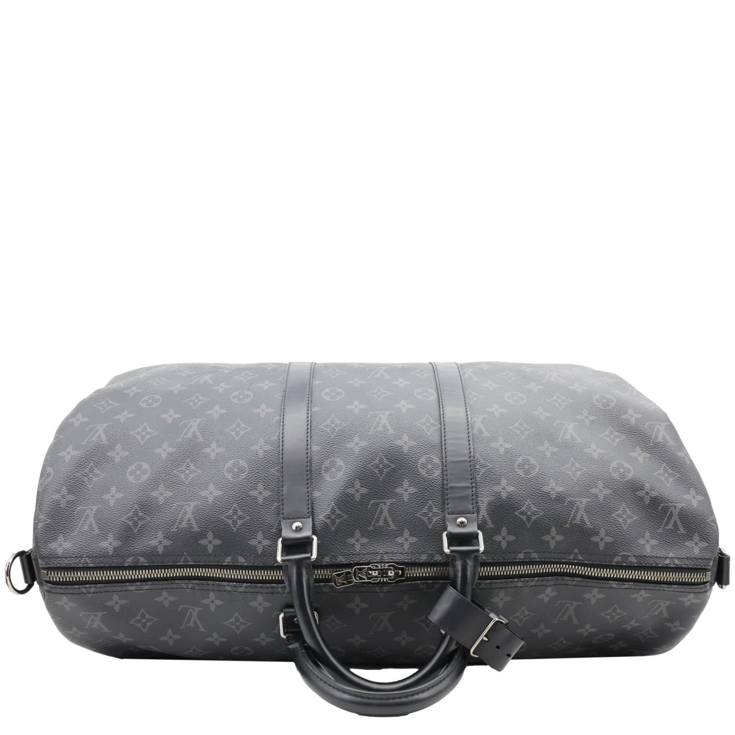 The LOUIS VUITTON Keepall 55 Bandoulière Monogram Eclipse Travel Bag Black is a sleek carry-on crafted in signature Monogram Eclipse canvas with leather trim and silver-tone hardware. Spacious and versatile, it features rolled handles and a removable strap for effortless travel.