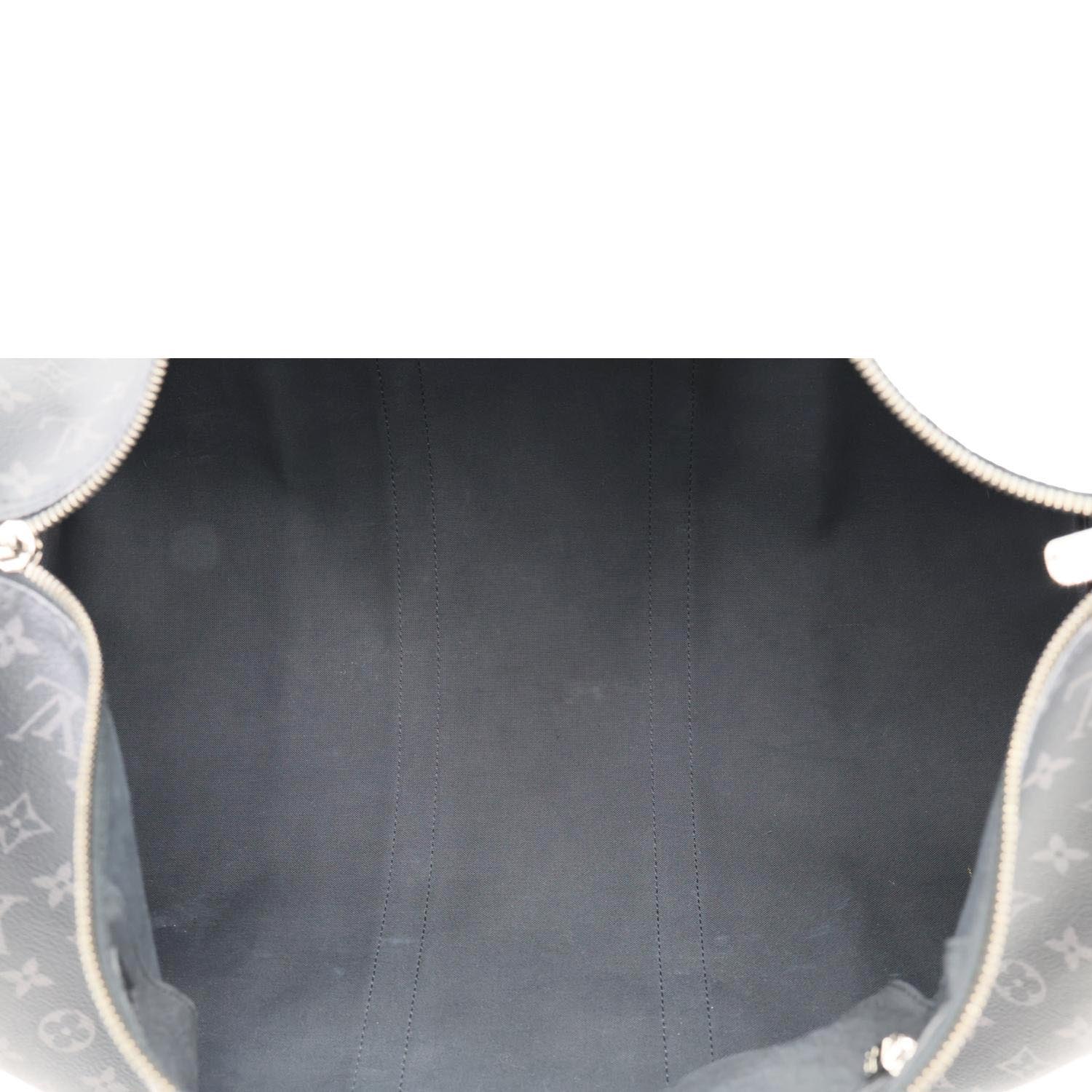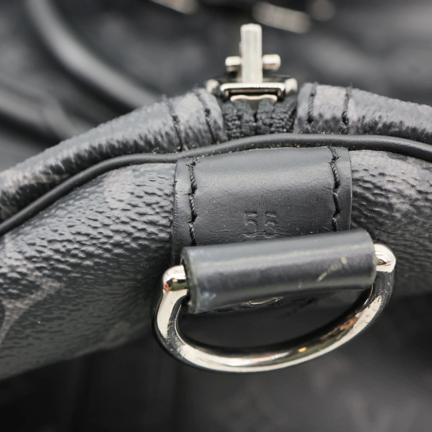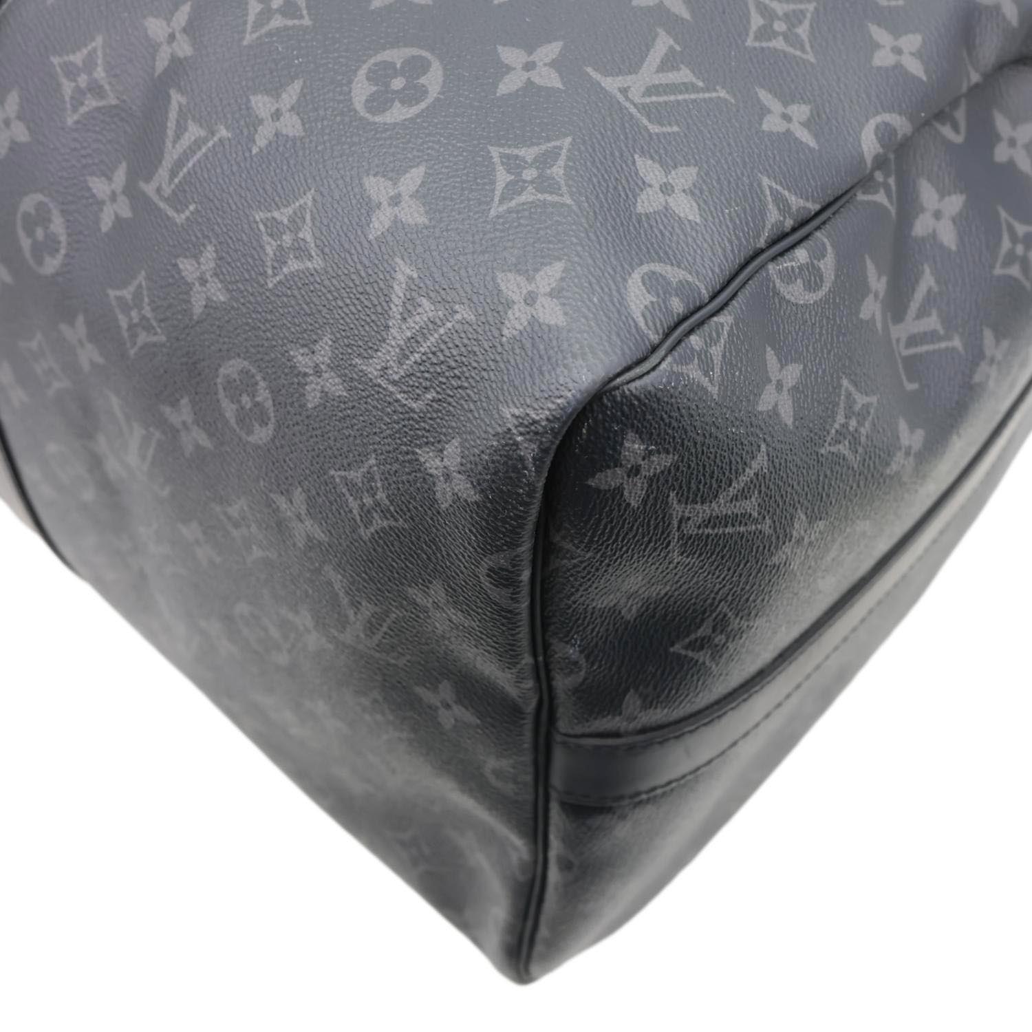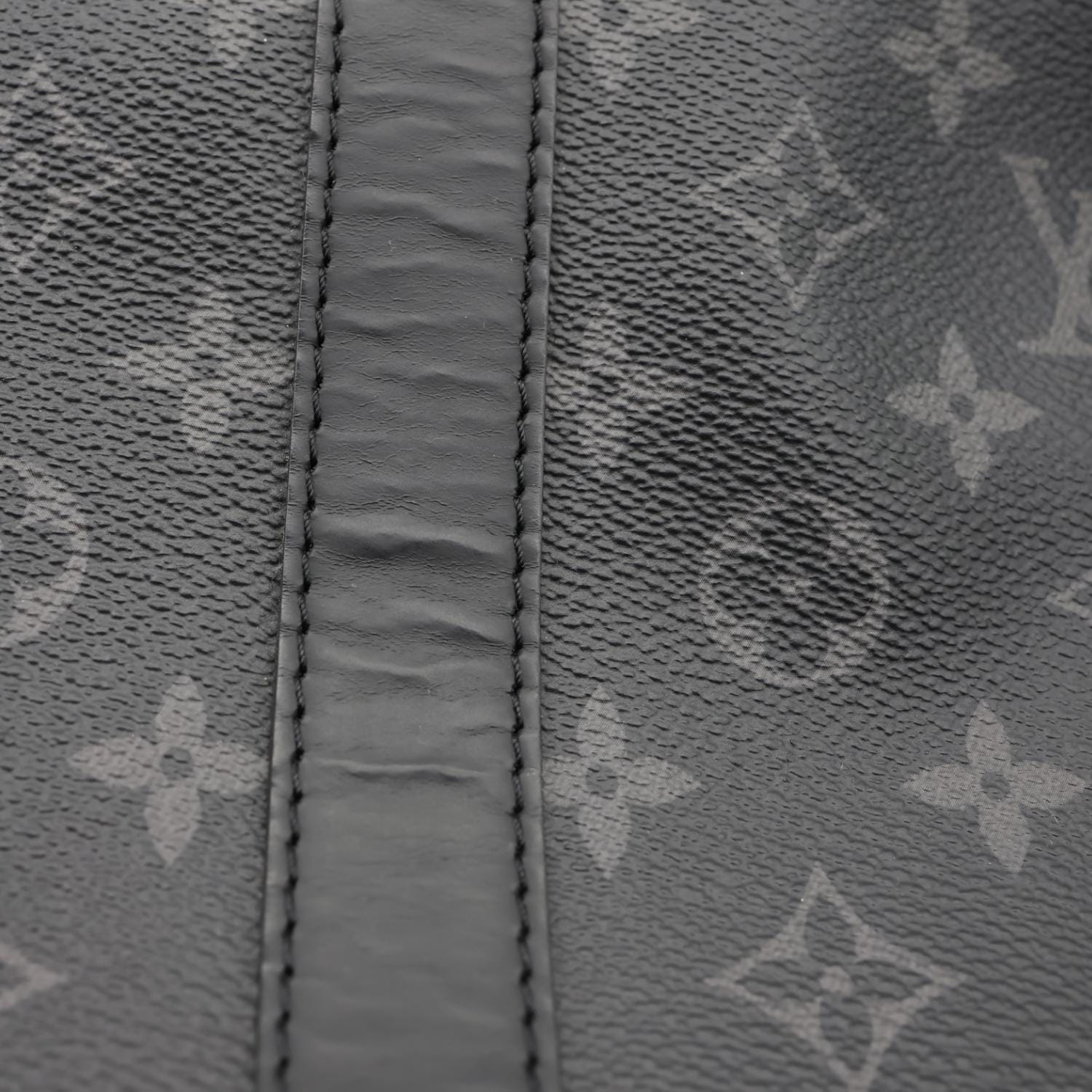 The LOUIS VUITTON Keepall 55 Bandoulière Monogram Eclipse Travel Bag Black is a sleek carry-on crafted in signature Monogram Eclipse canvas with leather trim and silver-tone hardware. Spacious and versatile, it features rolled handles and a removable strap for effortless travel.